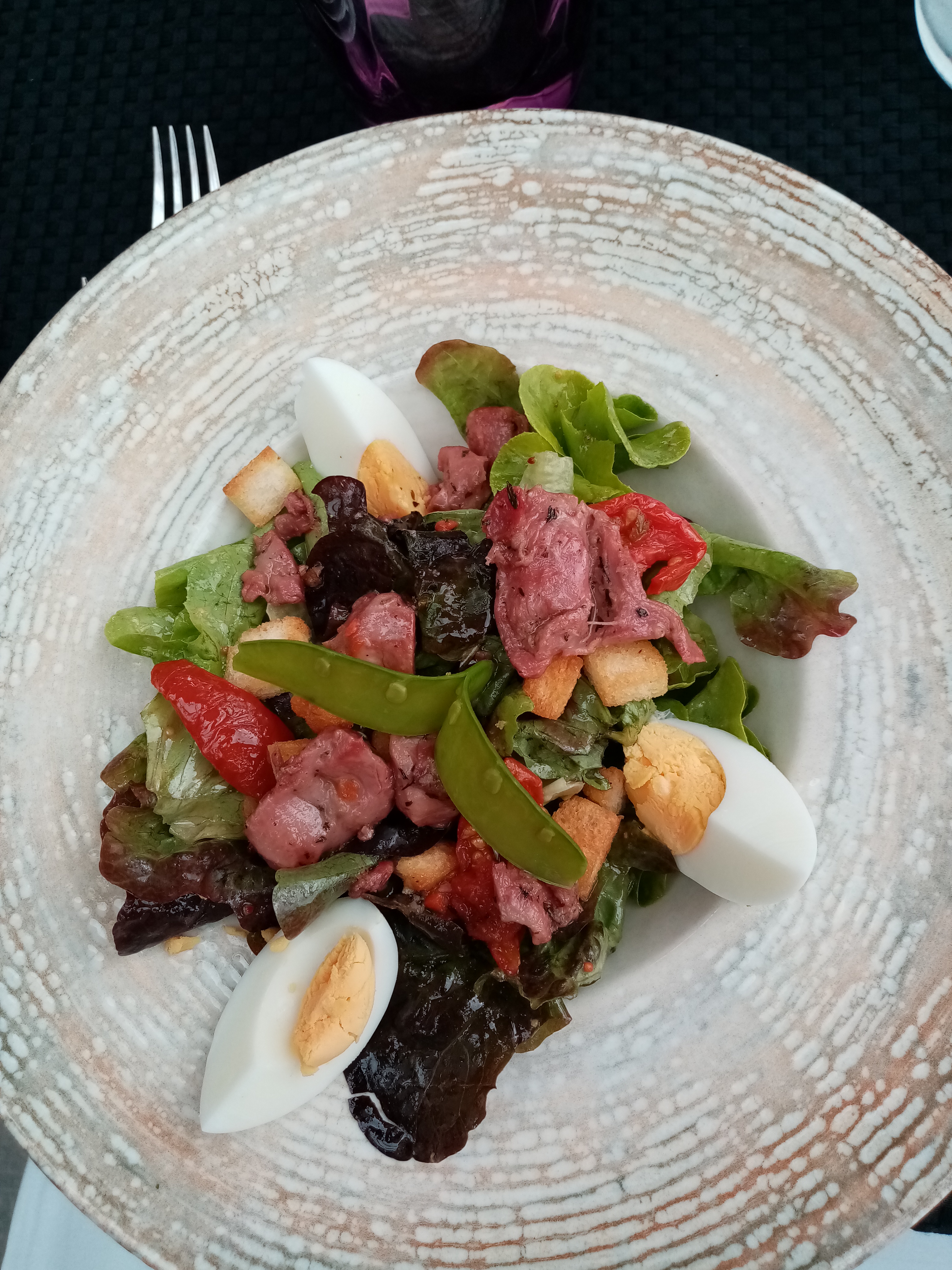 Jolie déco. Placée dans les hauteurs ce restaurant vous accueille dans un cadre joli avec des plafonds bien hauts pourvus d'une lustre de toute beauté. La cheminée rajoute une touche. Parlons maintenant de l'assiette. Très copieux. Belles portions. Produits de qualité. Bonne présentation. On ne peut en ressortir le ventre vide. Nous avons adoré. Après tous ces mets copieux il nous a été impossible de finir l'énormepetite profiterole..... Service fluide. Serveurs souriants et disponibles. À refaire