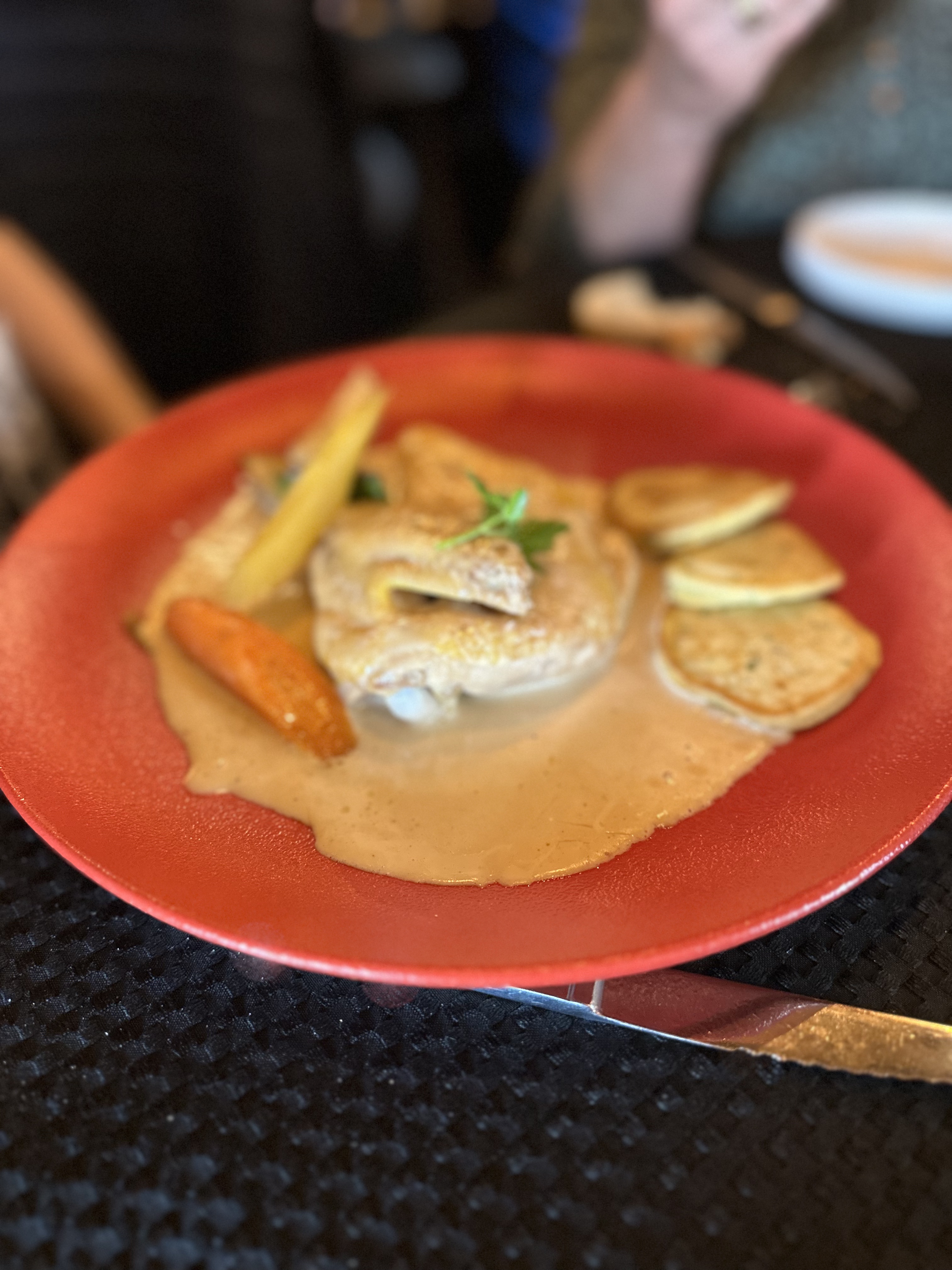 J’ai pris le menu degustation L’Amuse bouche n’a pas été agréable car le tartare de saumon a été servi chaud donc pas appréciable dommage. Pour les grenouilles en revanche elles sont excellentes, grenouilles fraîches, jamais manger d’aussi bonne. Pour le plat principal le poulet fermier de la Dombe aux morilles, le plat est bon bien présenté mais la crème a été trop réduite reste banale j’en ai mangé des meilleurs. Pour le dessert le moelleux au chocolat blanc Dessert excellent copieux rien à redire.