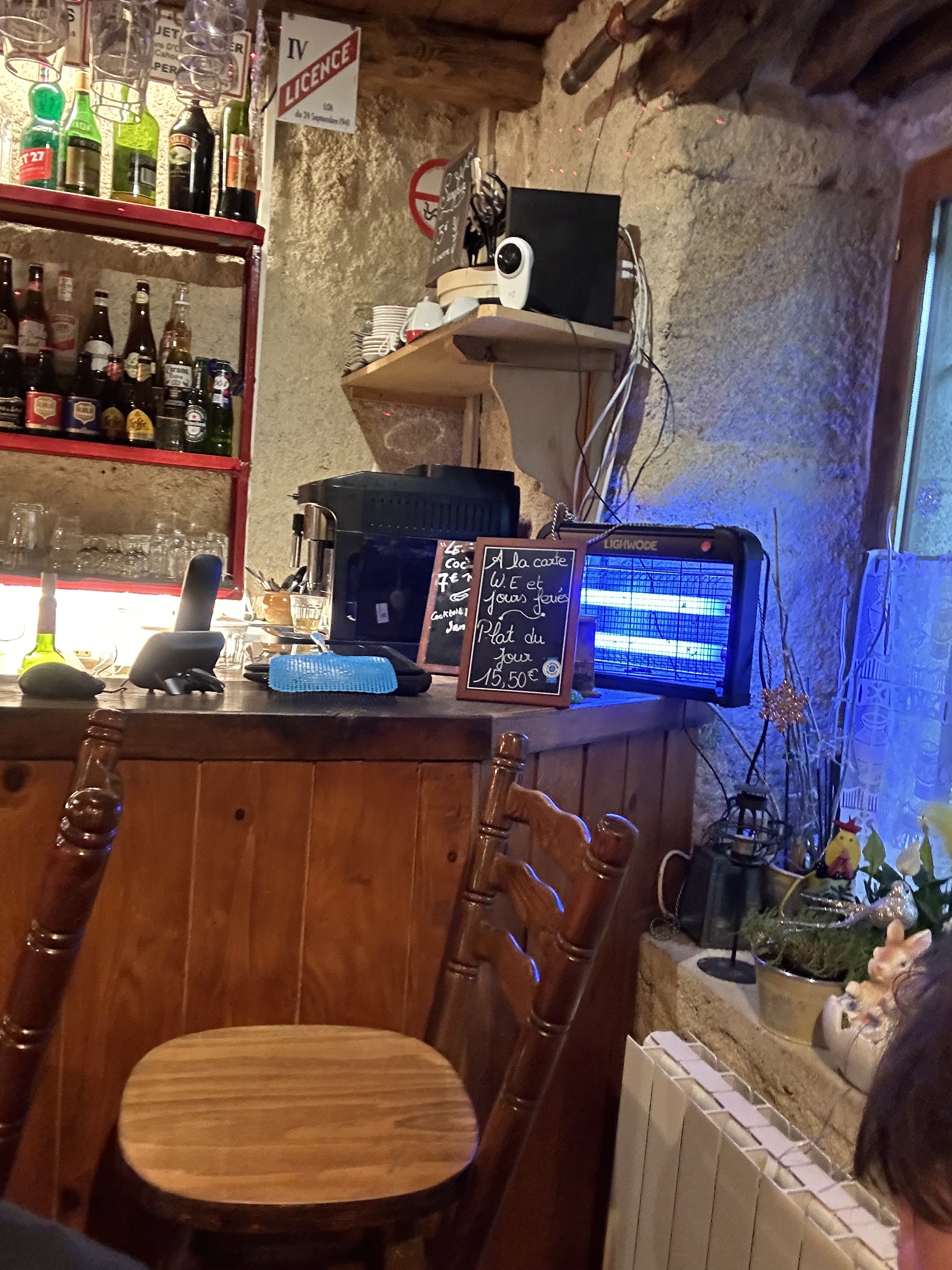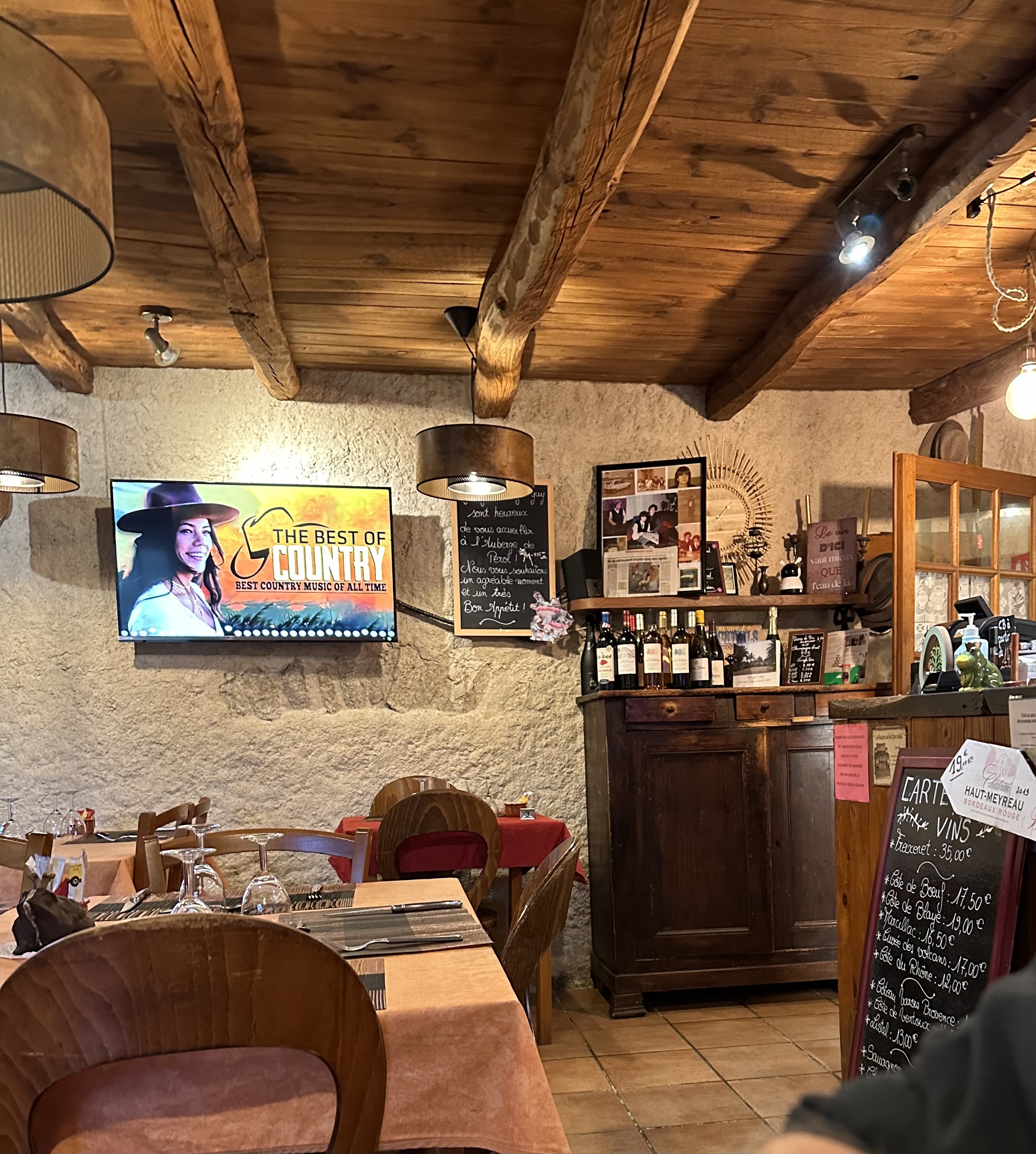 Merveilleuse auberge, servant des menus de jour pour les agriculteurs locaux, les pompiers et bien sûr ma femme et moi. Un repas pour le déjeuner comprenant du café et du vin vous coûtera un total de 28 euros pour 2. Des hôtes formidables et un joyau d'endroit à trouver .