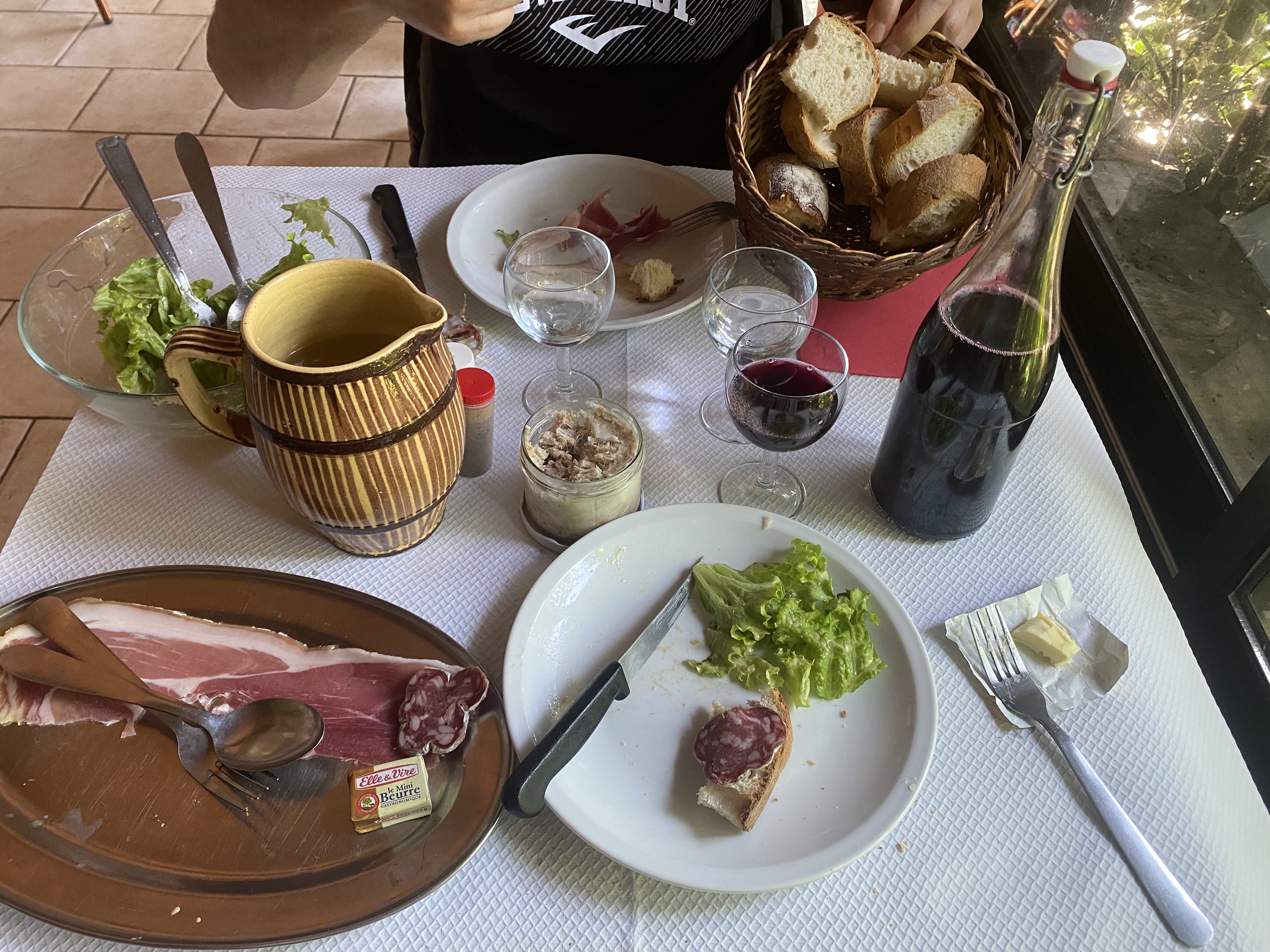 Menu excellent plat de charcuterie, salade,omelette aux cèpes, fromage,bouteille de vin et du vrai pain avec de la mie aérée le tout pour 19 euros. De là, l'église de Thines est à 10 kms ou 4h de marche.