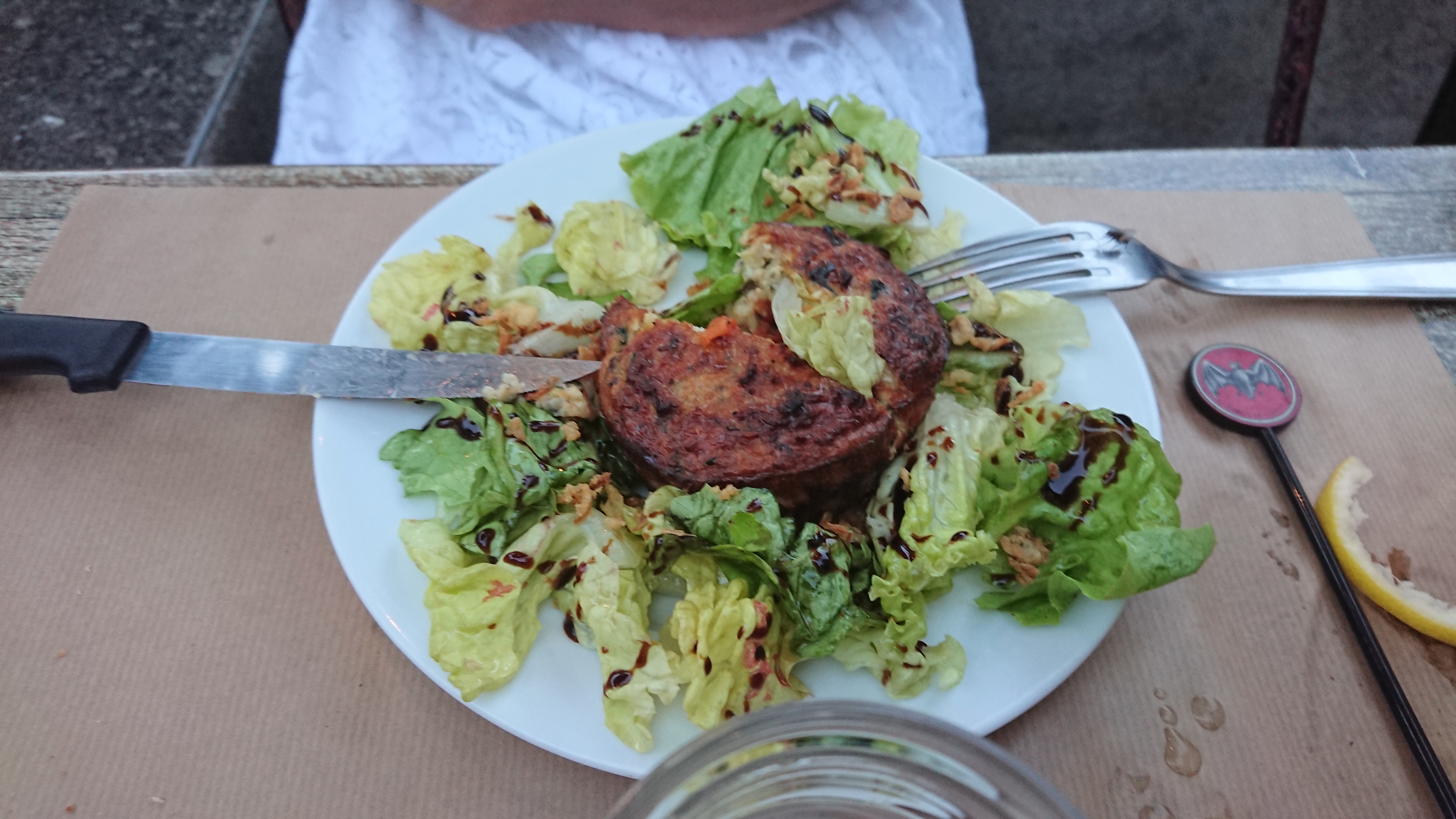Ce n'était pas notre premier choix mais le seul du coin qui n'était pas plein. Seulement 2 plats au choix qui doivent changer régulièrement. Pas de bol pour nous, ce jour là le choix ne nous a pas emballé. Nous nous sommes rabattus sur des burgers, simples, mais bon. Peut être un peu cher malgré tout. La vue sur le village de pierre est sympa depuis la terrasse et appelle à une petite promenade digestive jusqu'à la tour carrée qui nous domine.