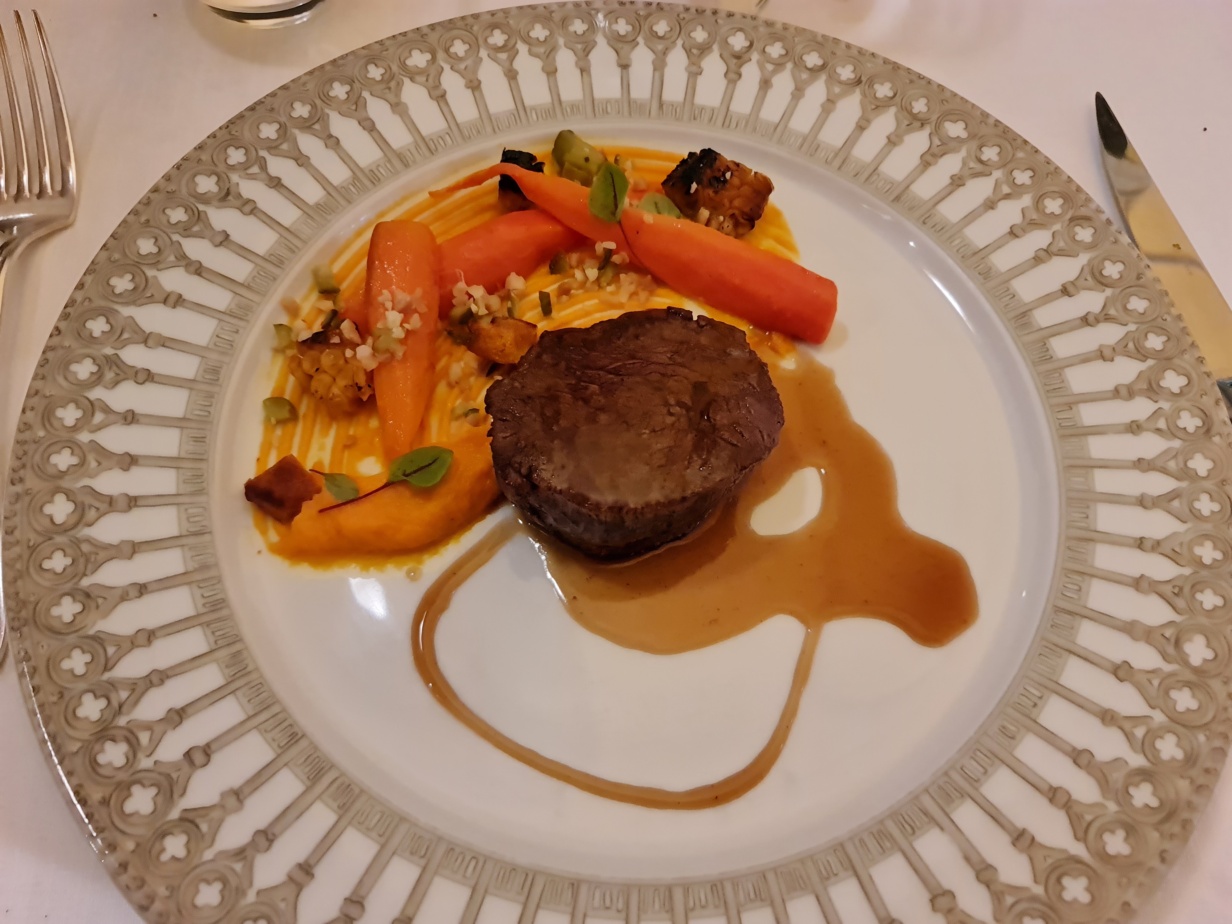 J'ai déjeuner à la carte et même si ce restaurant n'est pas étoilé, j'en ressort avec une expérience gustative supérieure à certains 1 ou 2 *. Le plat principal, un filet mignon de veau accompagné de maïs travaillé, et chaque bouchée était un voyage incroyable. Quelles saveurs ! Et le rythme auquel s'enchaînent les plats est parfait, les serveurs sont présents sans être derrière nous constamment, actifs et pro actifs, de bons conseils, etc. Le cadre, juste exceptionnel. Pour moi le meilleur restaurant gastronomique de la région.