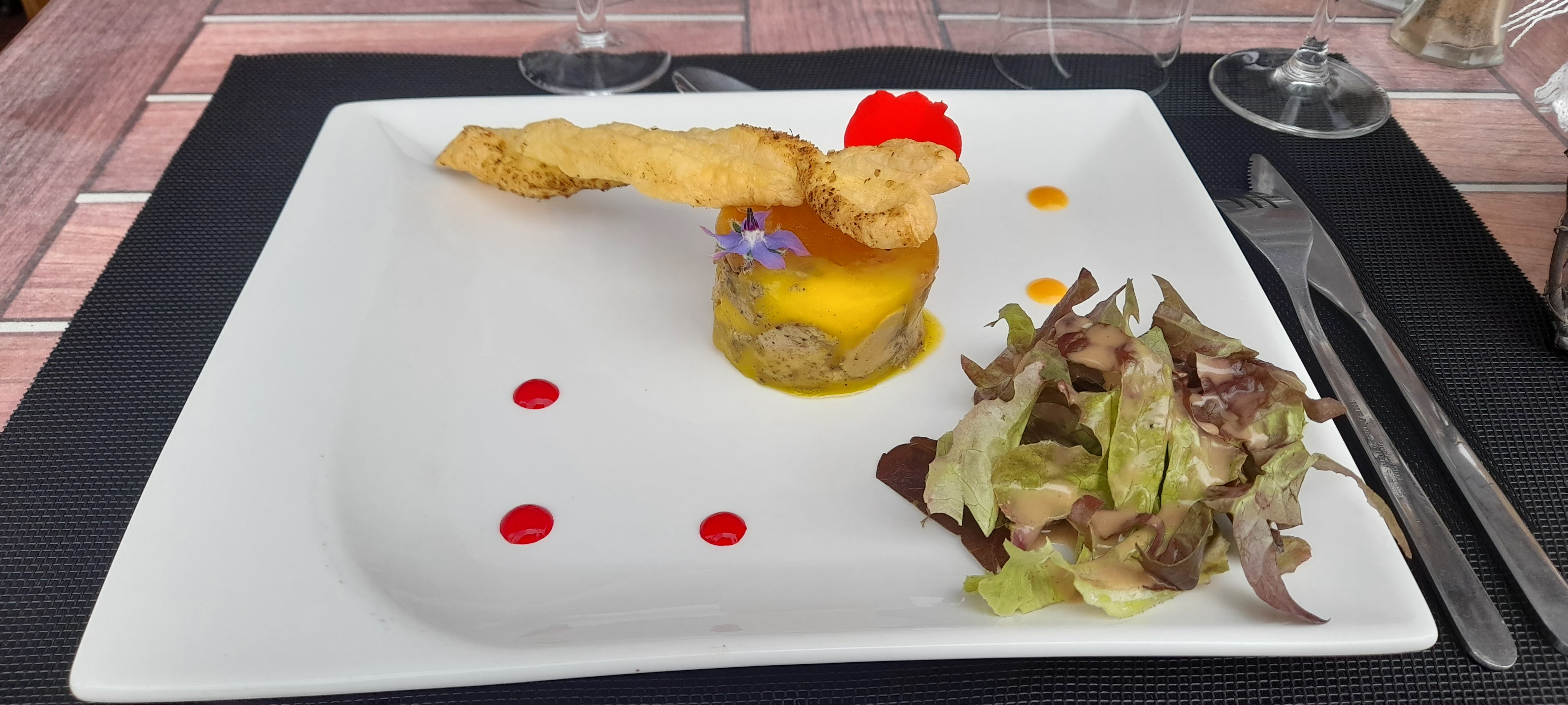La prochaine fois on ira ailleurs menu à 27 € foie gras cuit avec gelée comme un vulgaire pâte de campagne : l'association cela ne le fait pas ! papillote de saumon roulée dans une crépinette de porc : jamais vu mais cela ne fait pas non plus ! dessert nougat glacé mais sans nougat la totale .