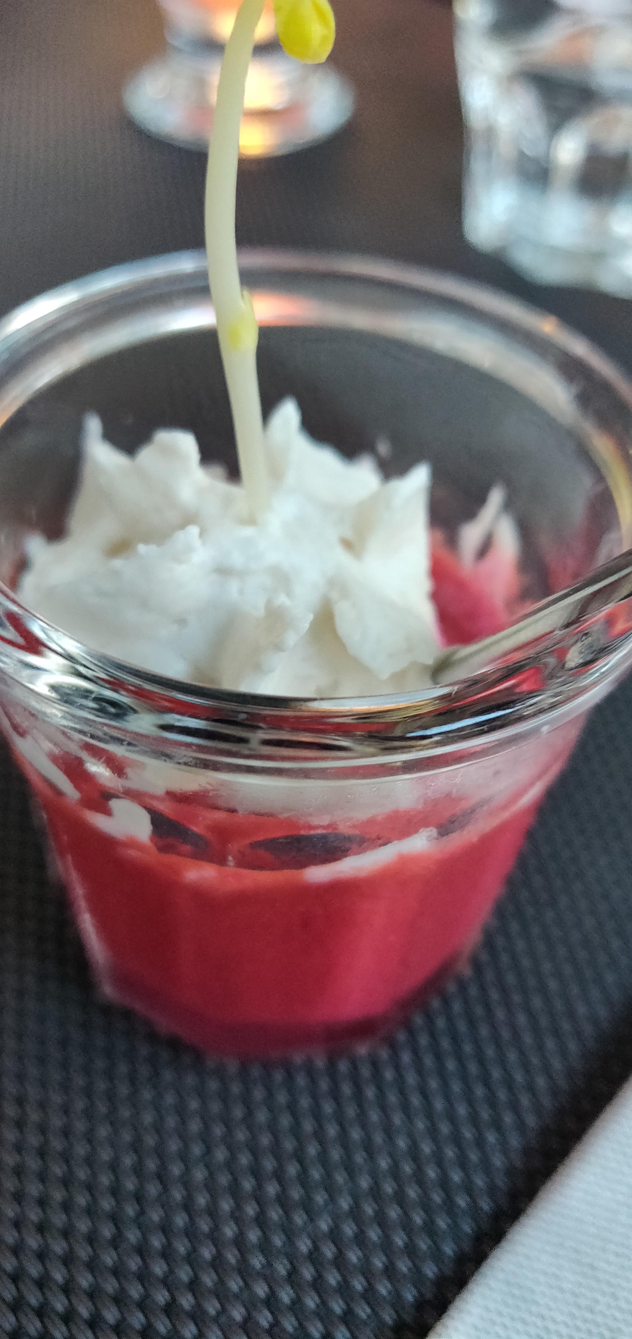 Tout est délicieux, depuis la mise en bouche, surprenant mélange betterave-pasteque avec émulsion de wasabi. Jusqu'au dessert, cheesecake citron, framboise. Le plat savoureux, épicé subtilement. Cadre magnifique. Y aller absolument. Merci de régalée nos papilles.
