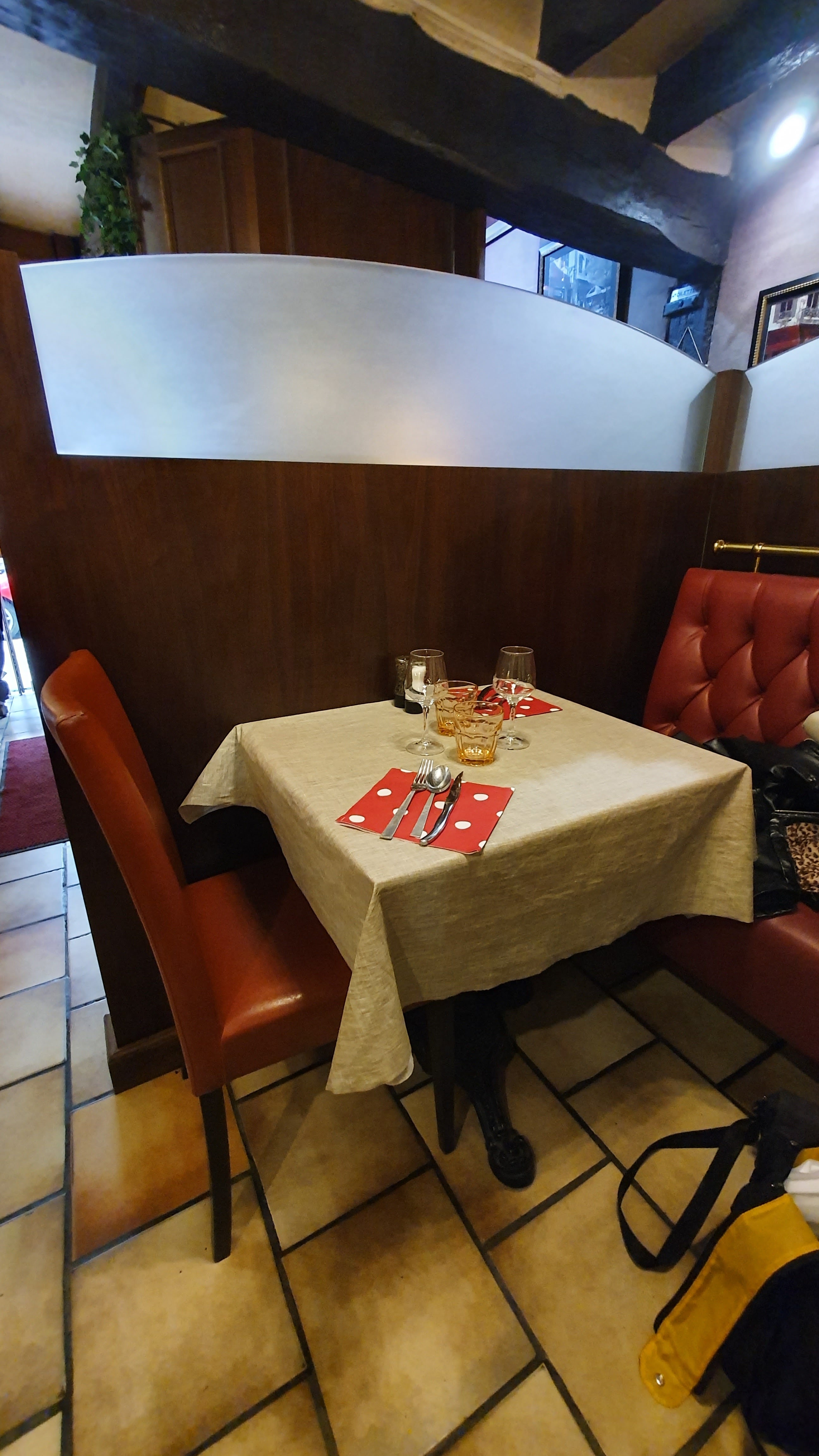 Avis mitigé… Service très agréable. Serveurs souriants et aimables. Le petit hic : la propreté… On nous emmène à la cave sans nous demander notre avis alors qu’il y a des étages super agréables et bien entretenus. La cave est pleine de salpêtre et sent l’humidité. Il y en a sur les murs au niveau de la table. Sur laquelle j’ai demandé à avoir un coup de torchon d’ailleurs, car il y avait plein de salpêtre tombé dessus, ainsi que sur les chaises. Le sol est sale et plein de poussière / salpêtre.. Des morceaux de tissu déchirés en guise de nappe.. Tout cela ne met pas trop en appétit… :( Heureusement, pour notre plus grand plaisir; les plats étaient délicieux (mais juste tièdes). Pour conclure : il faut faire quelques travaux de nettoyage ou oublier les tables supplémentaires à la cave..