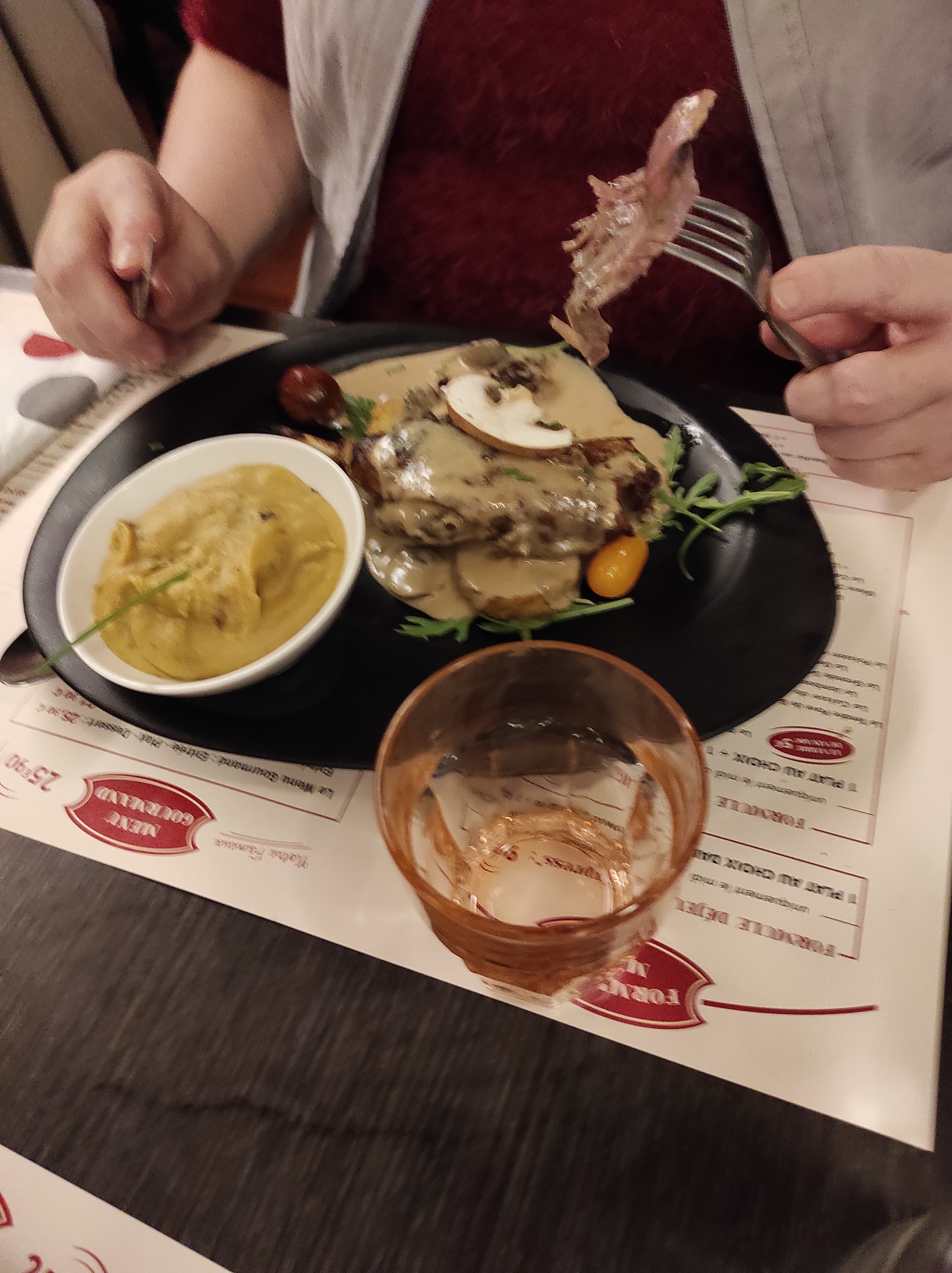 Service rapide et très professionnel cuisine excellente et de qualité cuisses de canard sauce au champignons 🍄 et purée de champignons 🍄 à tomber par terre 🤣 ❤️🇨🇵