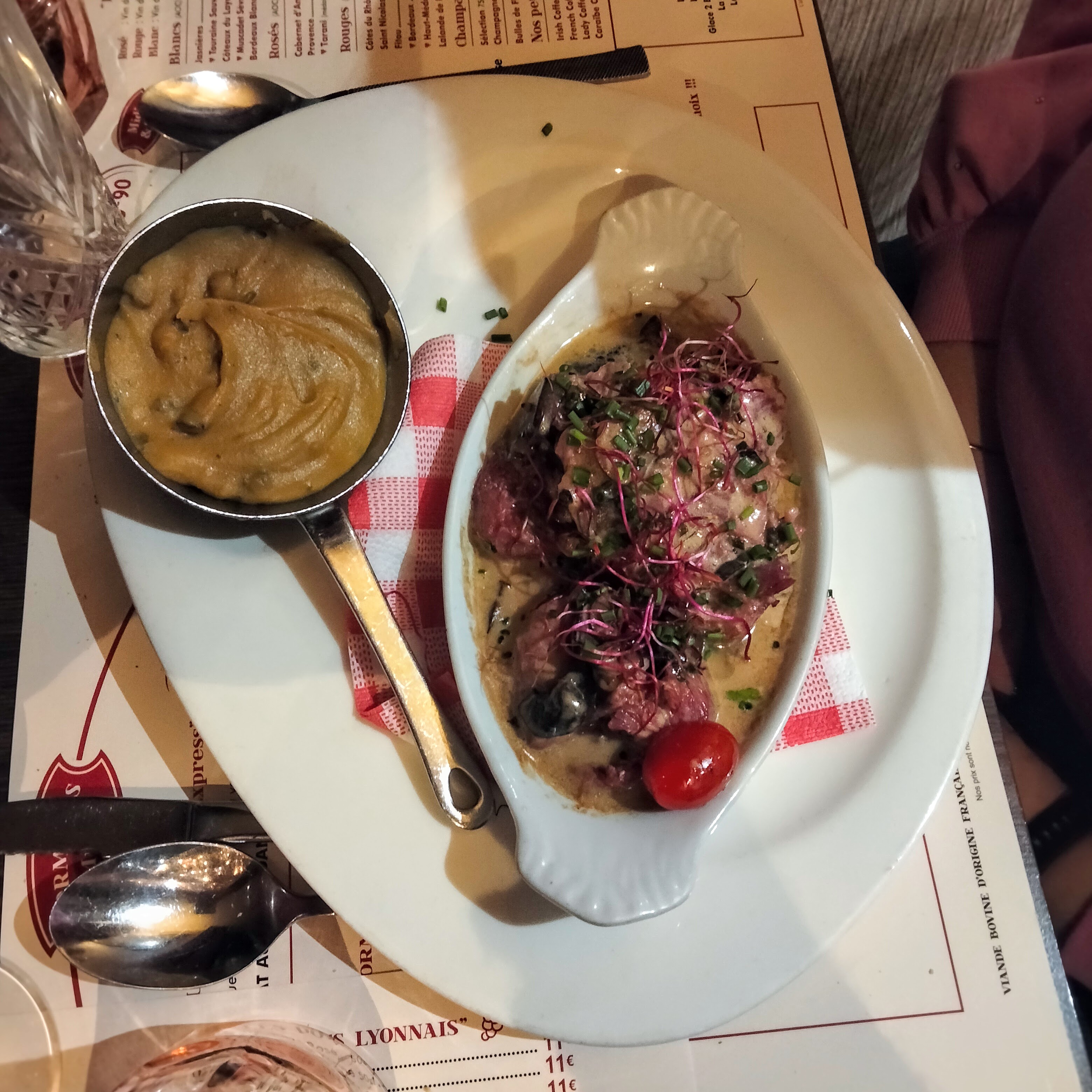 Je dîne ici en ce moment. J'ai ressenti le besoin de partager cela immédiatement plutôt que plus tard. Il y avait une salade César et des escargots en entrée. La salade était bonne. La salade était légèrement en sauce et mélangée, contrairement à d'autres qui étaient denses et crémeuses. Mention spéciale aux croûtons croquants et aux échalotes frites croustillantes. J'ai eu la cocotte de joues de porc. Mon partenaire avait les brochettes de bœuf. Le porc était tendre et très chaud au moment de servir. La purée de pommes de terre qui l'accompagnait était tout simplement incroyable et époustouflante. Le service était bon et rapide même si nous étions asiatiques. Le personnel parle un anglais basique, donc c'est très utile. Cet endroit semble très local et c'était plutôt bondé pour le déjeuner. Ce lieu rustique est une visite incontournable si vous êtes au Mans.