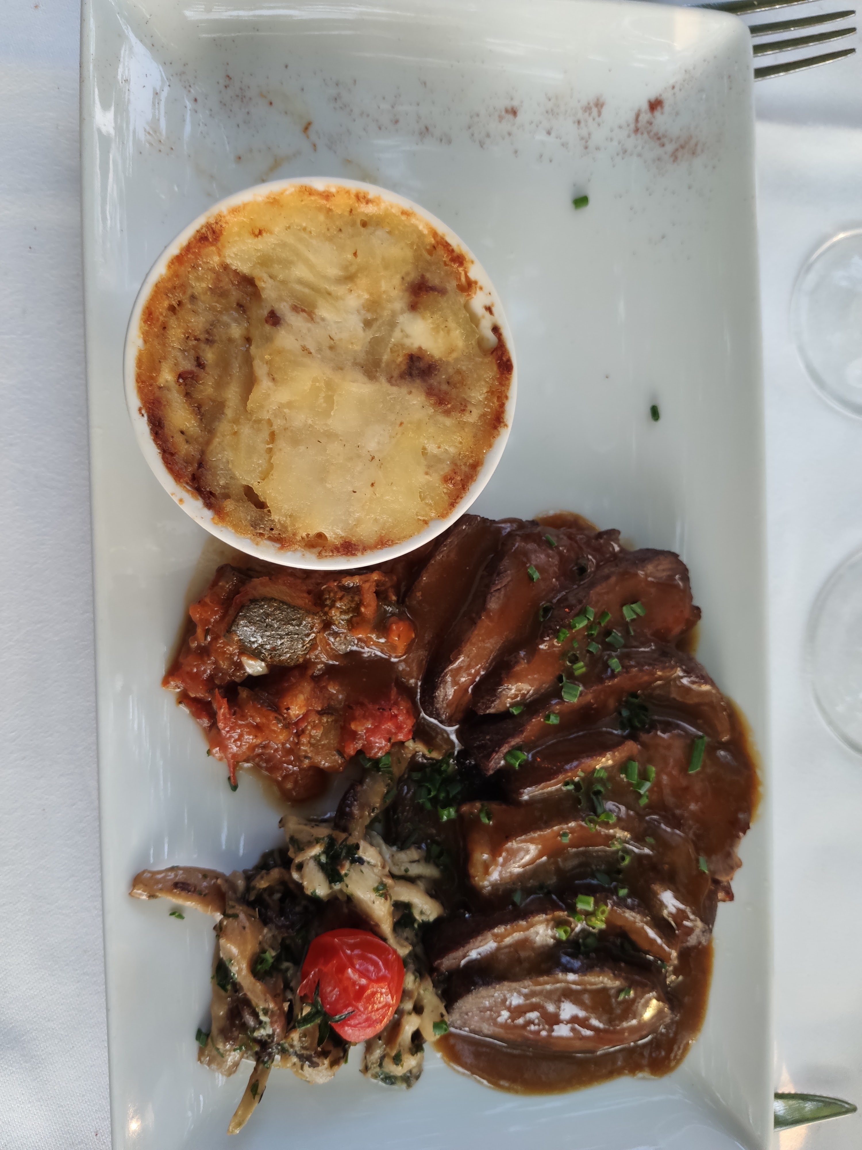 Accueil de qualité, assiettes copieuses et gourmandes un vrai bon moment, de l'entrée au dessert, déjeuner en terrasse bien ombragée, service professionnel et souriant