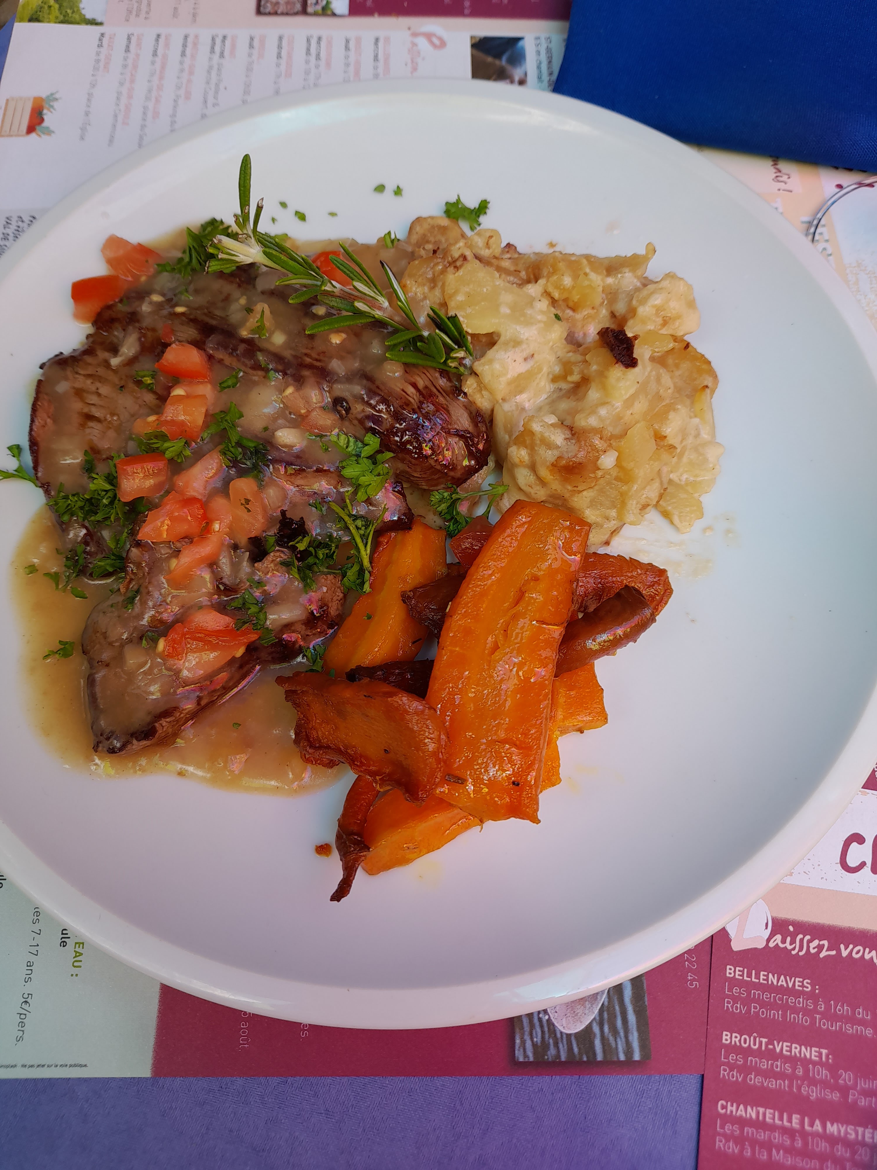 Service impeccable, terrasse ombragé sous les arbres, vus panoramique sur la Sioule, plat copieux. Très bon qualité prix.