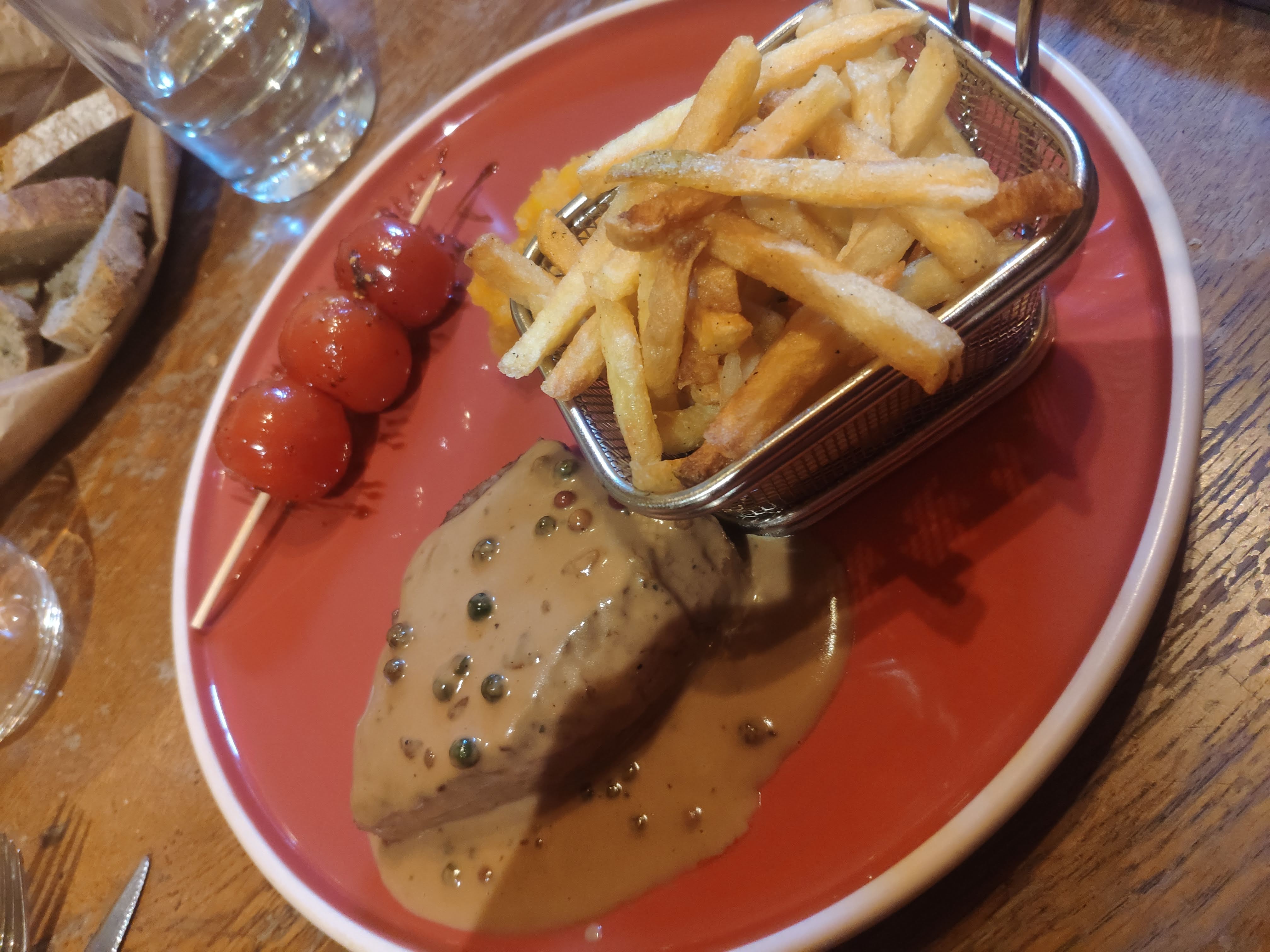 Excellent repas : tartare de tomates au basilic, tournedos sauce morille (avec des morilles) avec purée de légumes et petites pommes de terre persillées, fromage à volonté, croustade de pommes tiède.