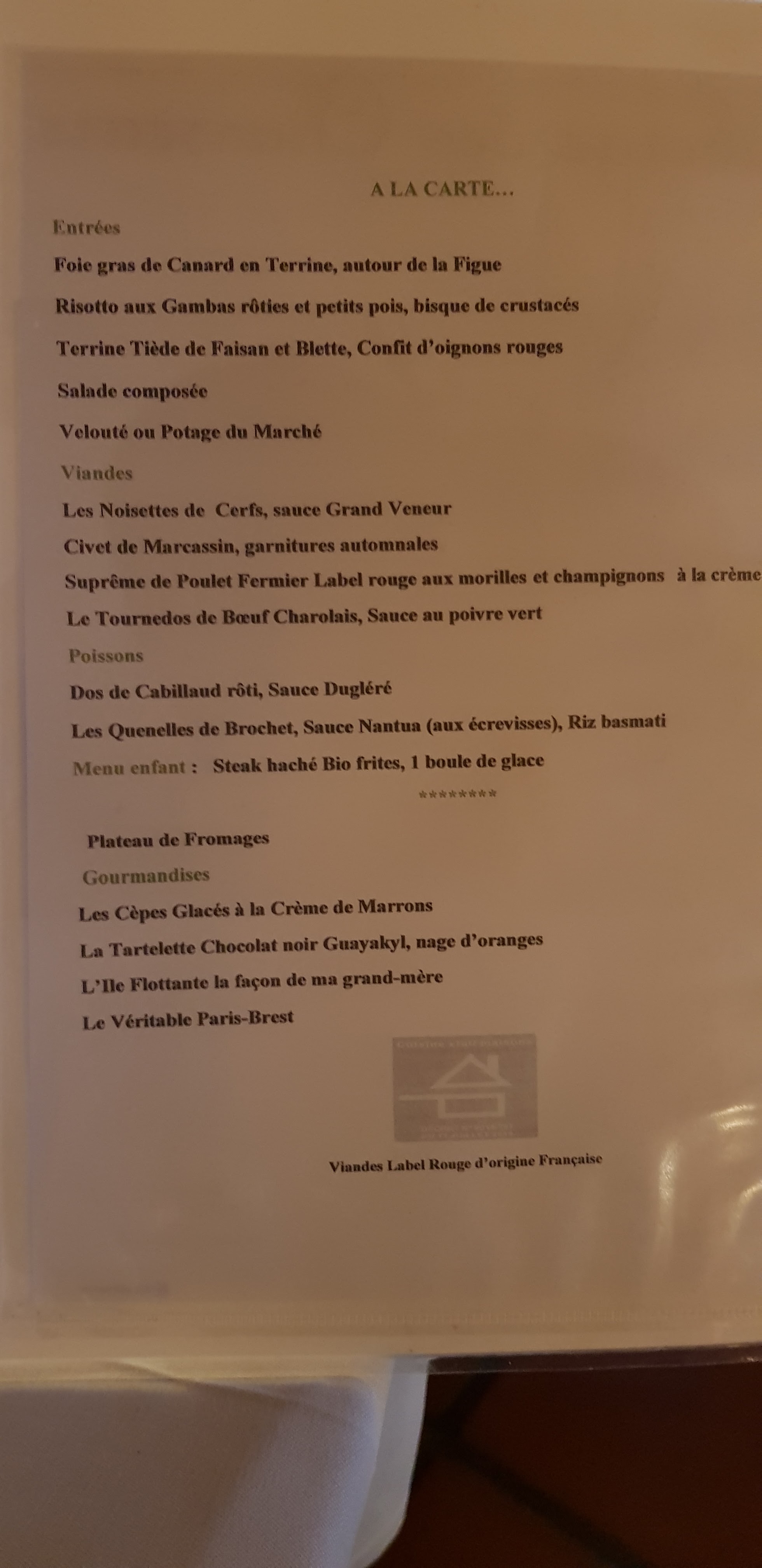 Malgré le prix élevé du repas nous pensons que cela valait la peine Accueil du personnel impeccable, gentillesse et sourire au service du restaurant, bons conseils pour le choix du vin. Cadre intérieur de la salle très soigné et chaleureux. Les tables dressées dans la tradition. Nous avons dégusté la chasse, servie dans les règles de l’art, dans une présentation très soignée. Nous avons été très agréablement surpris de la qualité et la bonne ambiance en général dans l’établissement. Le personnel toujours souriant et attentif a vraiment couronné le plaisir de notre repas et nous a aidé à oublier la montant de l’addition. Bravo ne changez rien… C’est super comme ça.