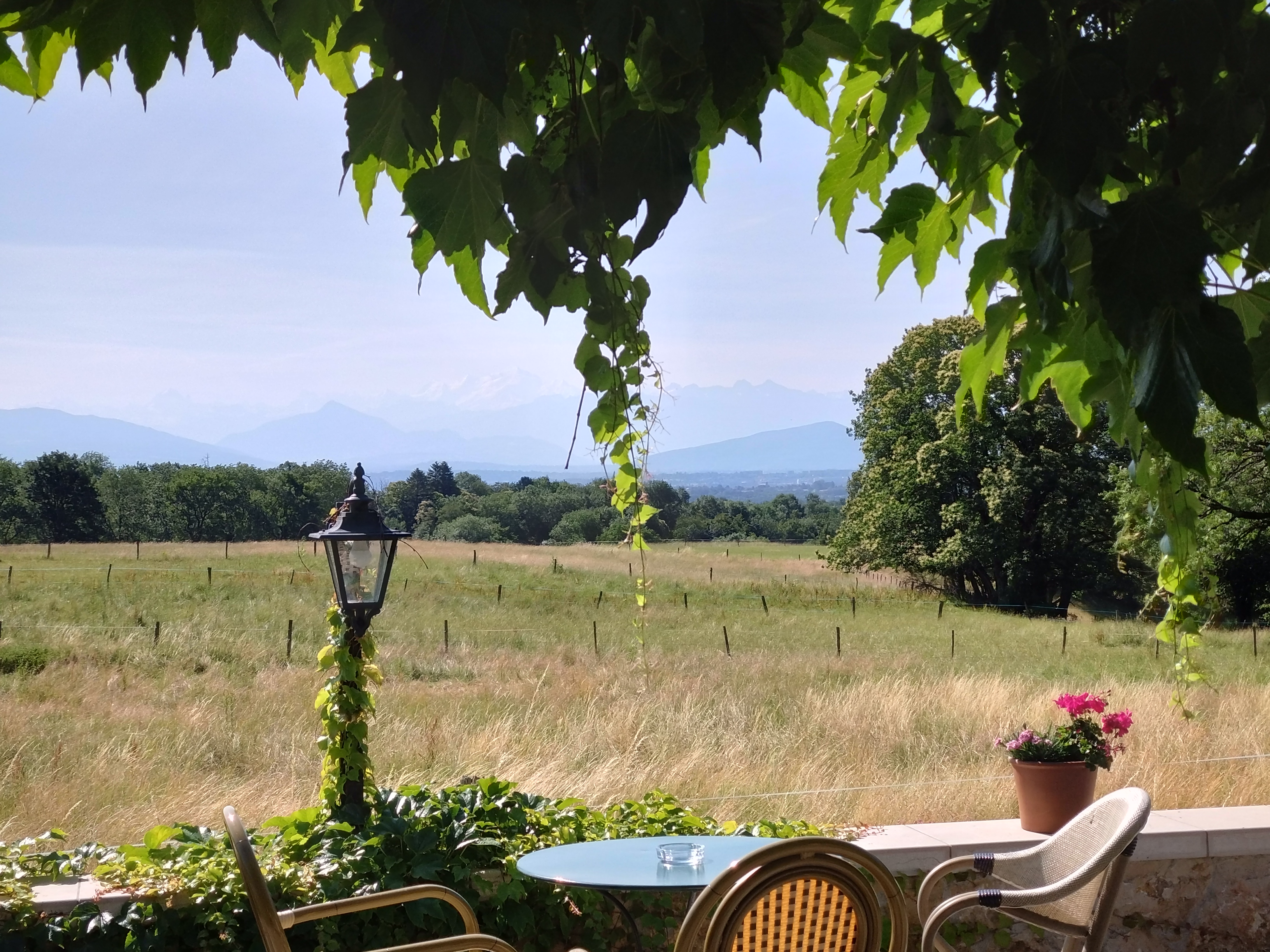 J’ai réservé une chambre à mon patron danois âgé de 75 ans. Il a apprécié le calme et l’emplacement de cet établissement du bassin genevois. L’hôtel a une terrasse avec un superbe point de vue campagnard dominant Geneve et un arrière plan montagnard sur la chaîne du mt Blanc. Nous avons dîné . Le menu unique est à 45€ j’ai choisi de la truite fumée en entrée avec une crème chantilly citronnée, mon plat était d’excellentes côtes d’agneau au jus de thym en dessert une pavelova.
