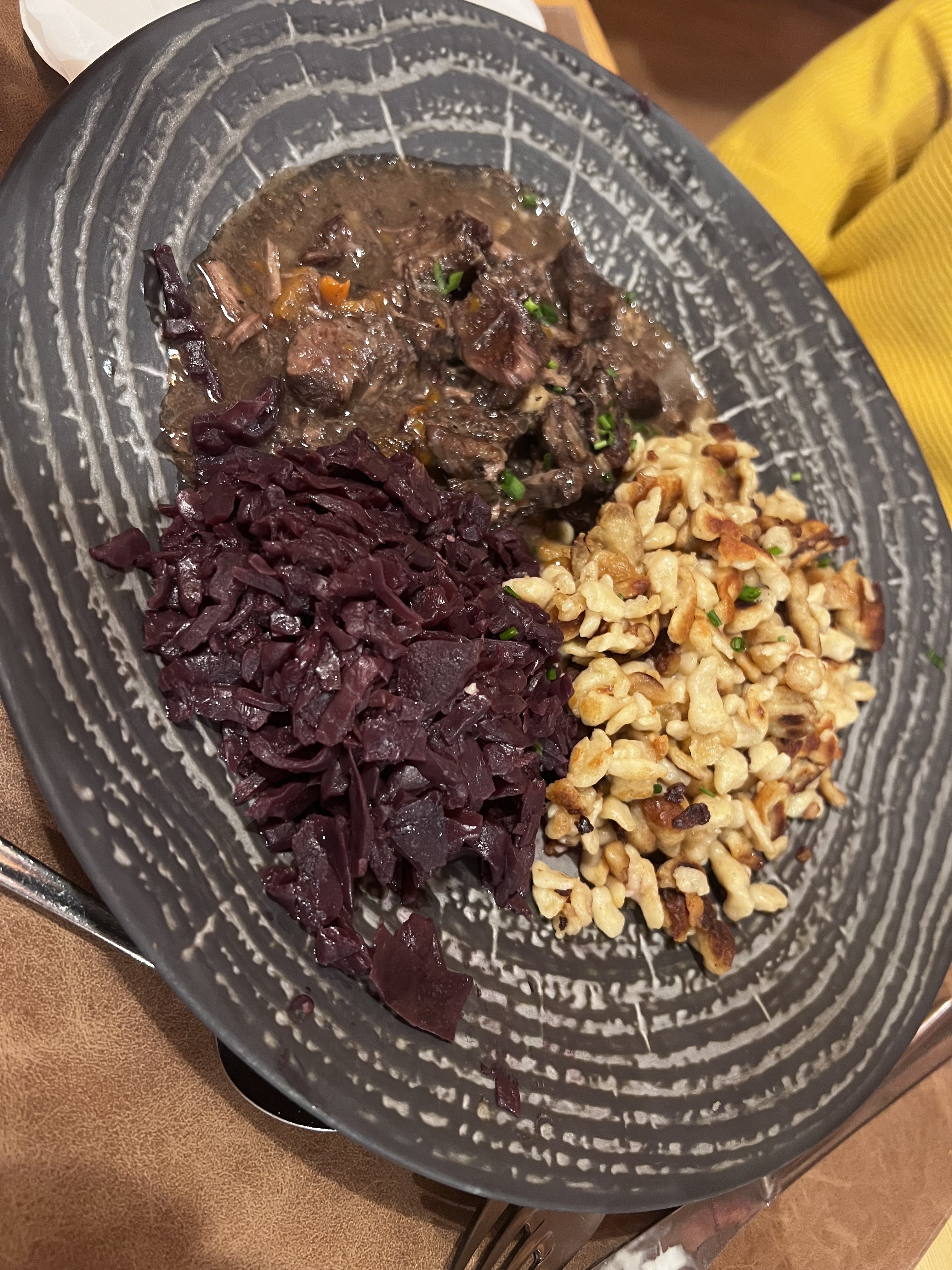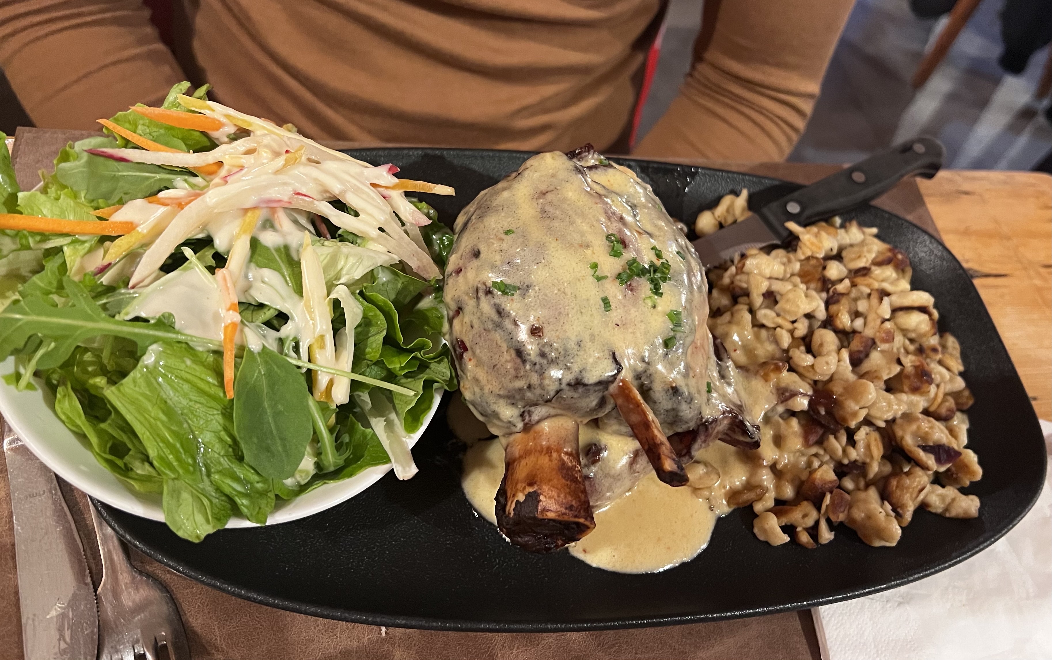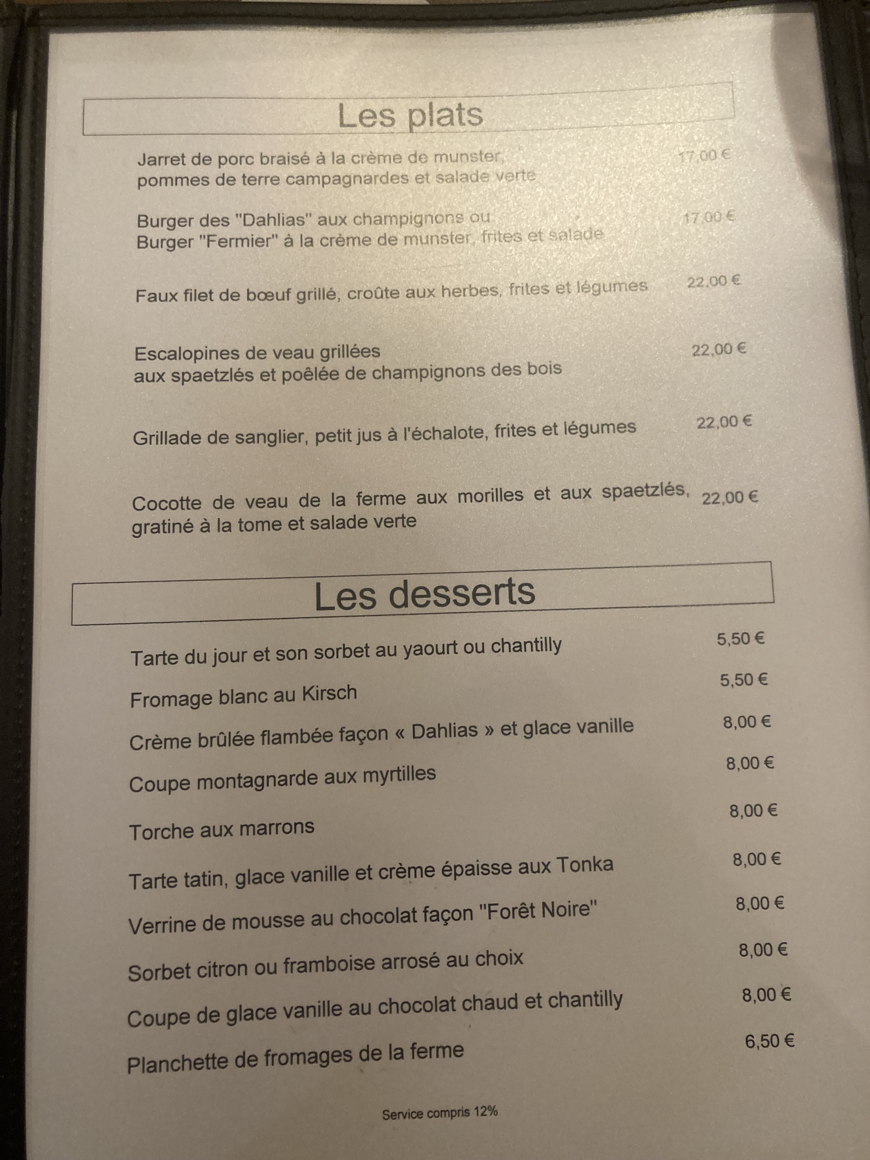 Très bien mangé!!! Le Jarret de porc sauce au munster était très grand et très bon même si j'aurais aimé un peu plus de sauce. Petits estomac s'abstenir ! Ou prévoir un dogy bag. Le cadre est sympa. Les prix sont très correctes . 138€ entrée plat desserts boisson et vin pour 4 adultes et 1 enfant.