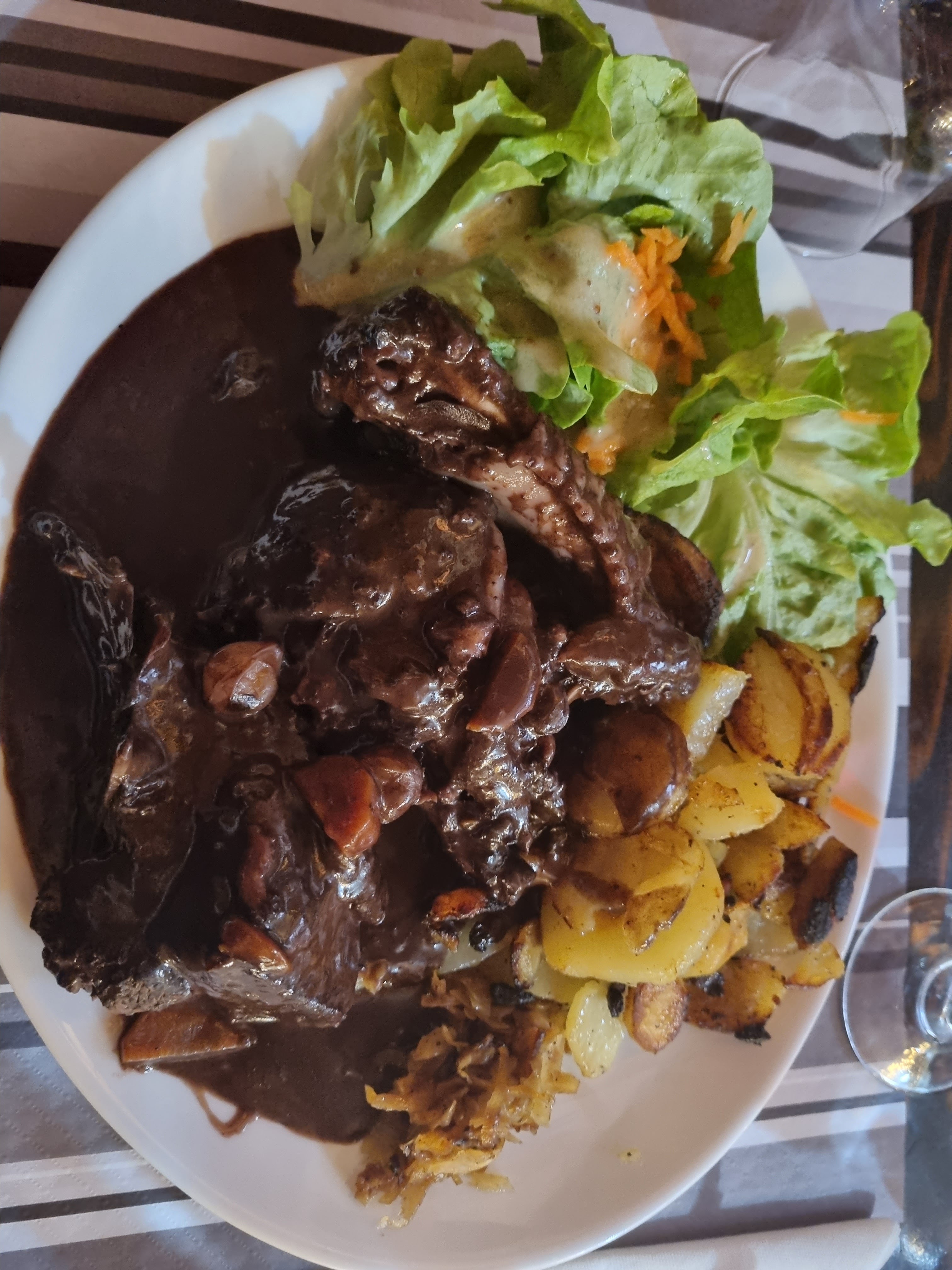 Je peux dire que je me suis régalée avec mon coq au vin et l' accompagnement truffade, salade. Toute la famille c est régalée aussi. Avec la côte de porc et la sioer truffade. On a peiné à manger notre dessert qui était trop bon aussi . Merci au cuisinier. Tout est bon, obligé d'y retourner !!!