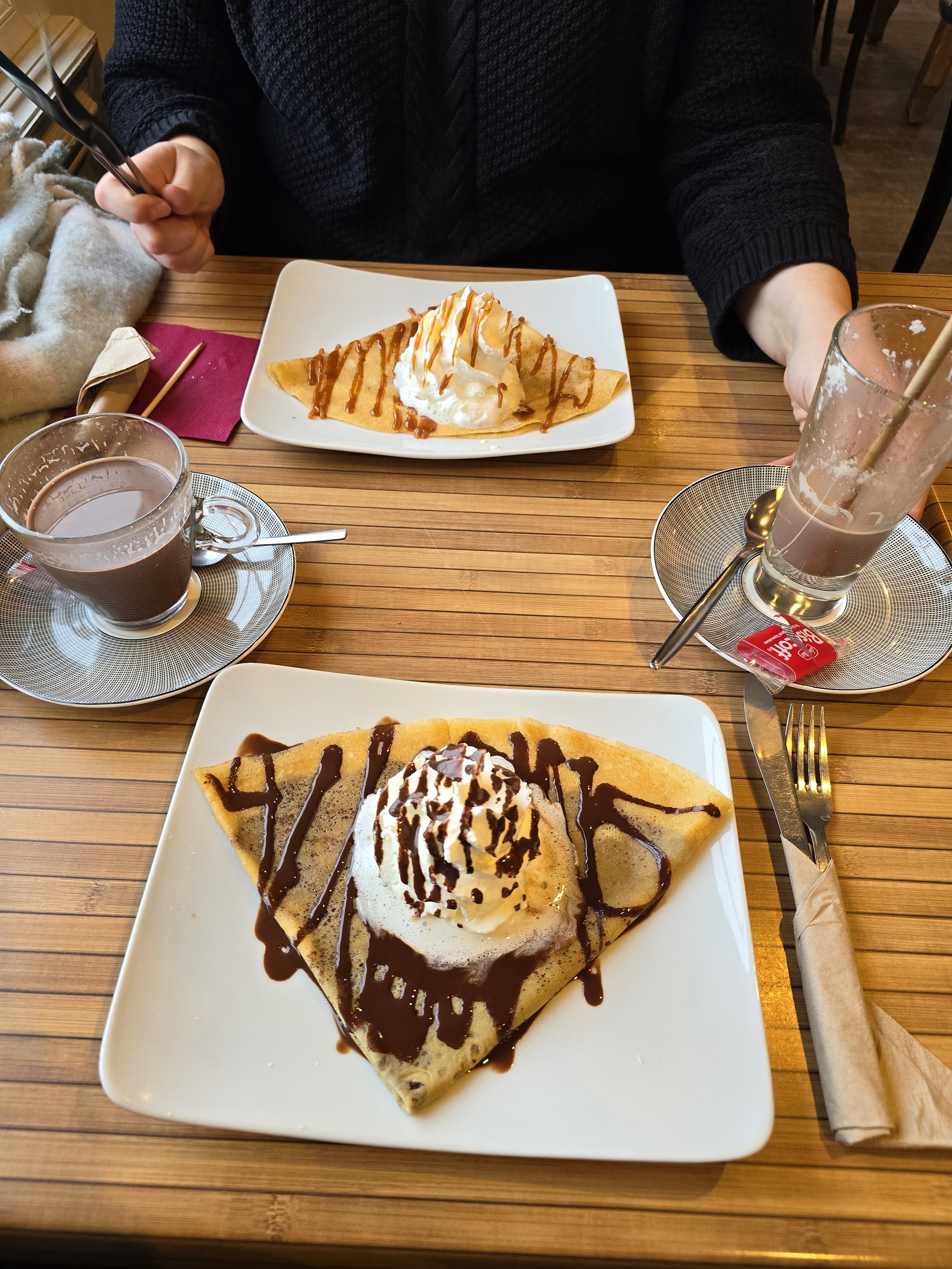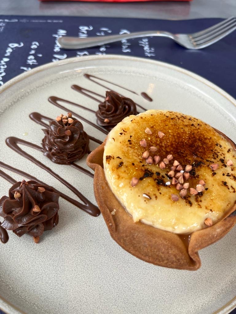 Cadre remarquable, terrasse avec vue superbe. Personnel très sympathique. On avait commandé 2 crêpes au chocolat, au final on a eu au caramel, ça arrive de se tromper mais pour s’excuser on a eu le droit à un gros œuf en chocolat ! Vraiment trop sympa.