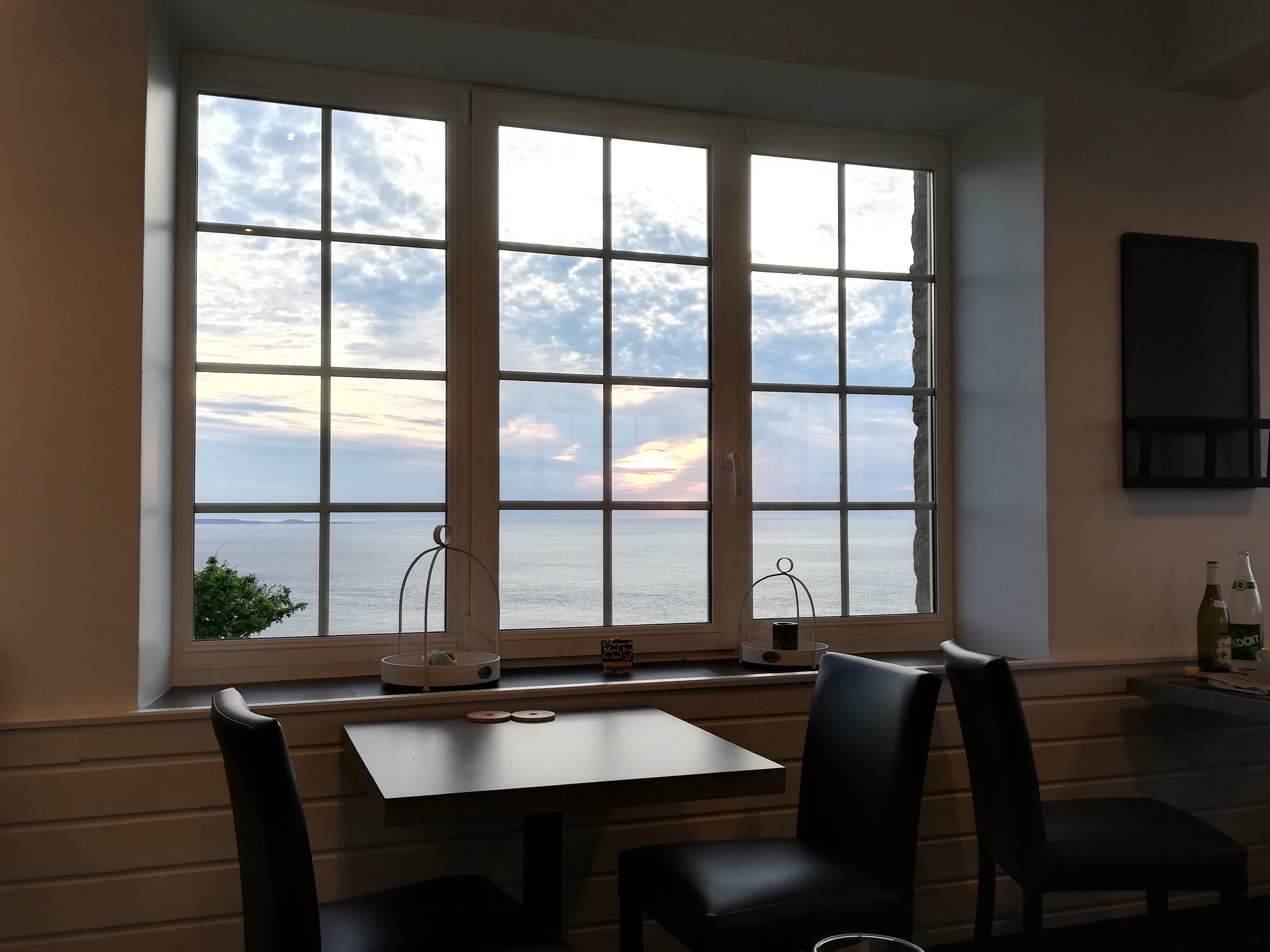 En plus d’être situé dans un cadre exceptionnel face à la mer et au soleil couchant, nous avons fortement apprécié l’accueil du nouveau propriétaire Erwan et de son équipe. Le menu est copieux et original (maquereaux fume au foin et glace au poivre de Sichuan, paleron de veau, dessert au concombre et verveine). On sent les inspirations issues des voyages du maître des lieux. Le menu destinés aux enfant est tout aussi délicieux et à été parfaitement apprécié par les nôtres. À cette période, le coucher de soleil accompagne heureusement le dîner. Ne pas hésiter à prendre les cocktails maisons (mojito du Cotentin et autres…)