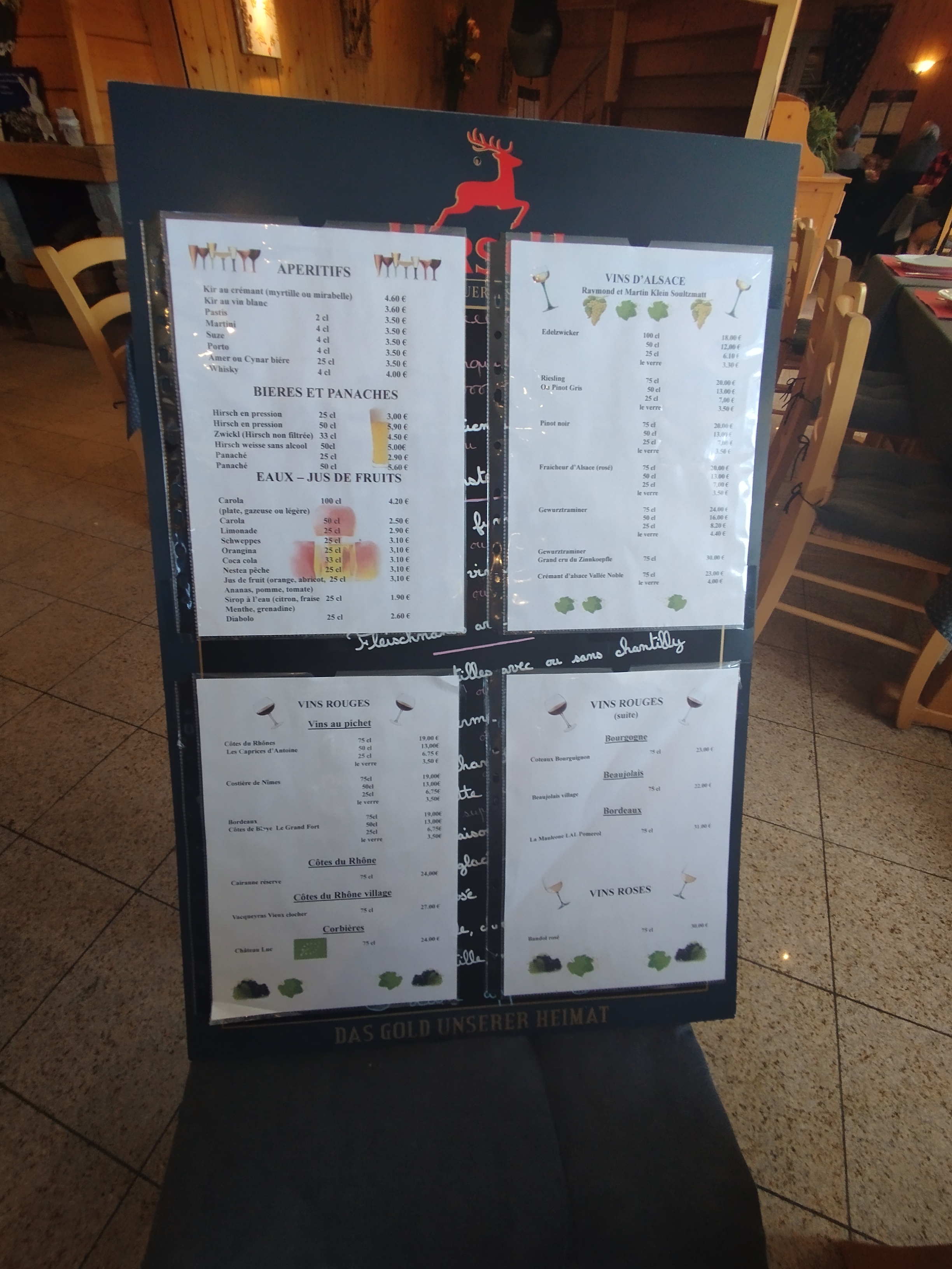 Nous étions 5 à table et avons pris le menu à 24€50 accompagné d'un pinot noir (excellent la maison Robert et Martin Klein) ainsi que le café. Tous les convives ont apprécié chacun en leur choix. On aurait aimé pouvoir manger dans la salle avec vue sur la vallée...pour une première visite pas de déception.