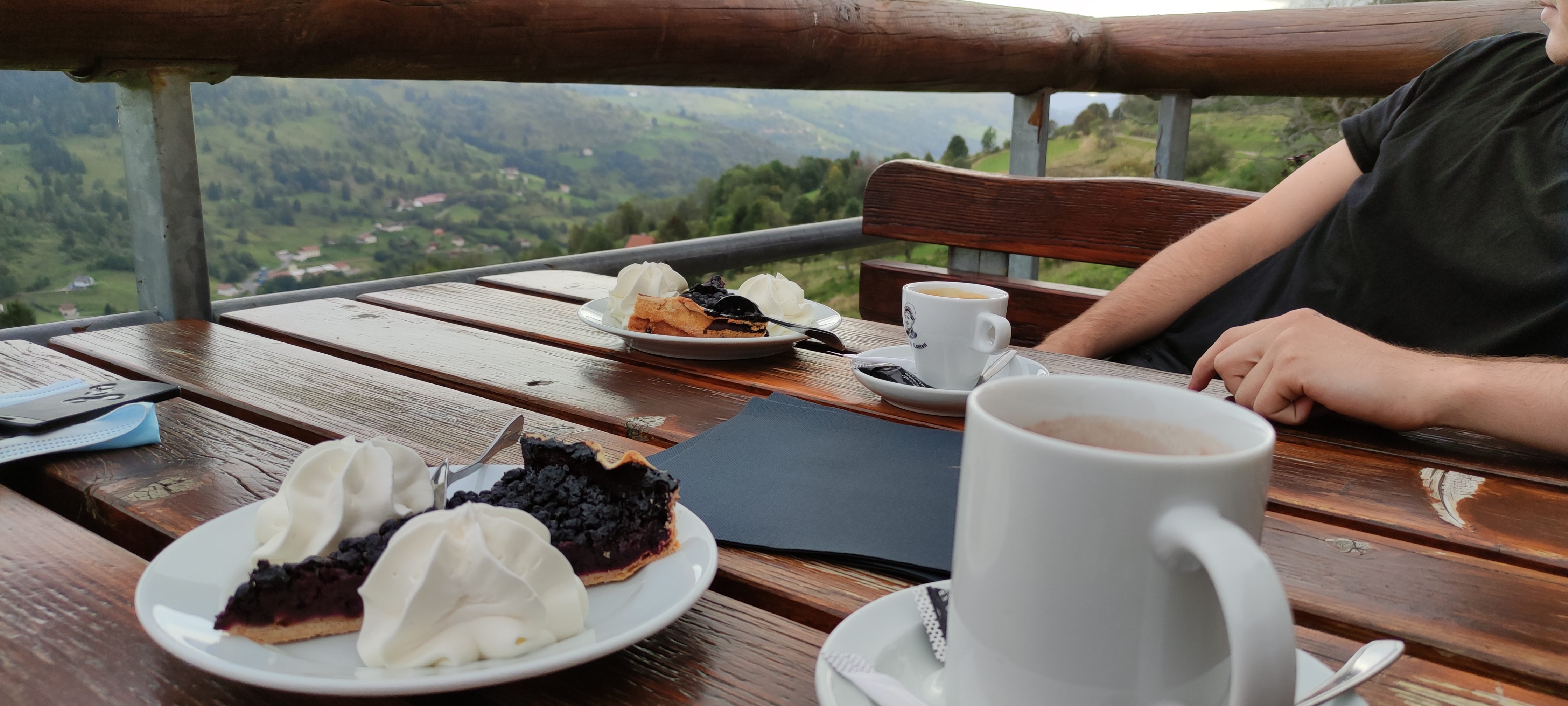 Super accueil ! Installer sur une terrasse avec une belle vu, le goûter composé d'une tarte aux myrtilles avec un chocolat chaud était délicieux 👍. Mentions spéciales à la crème chantilly qui accompagnait la tarte car c'était un régal 👏.