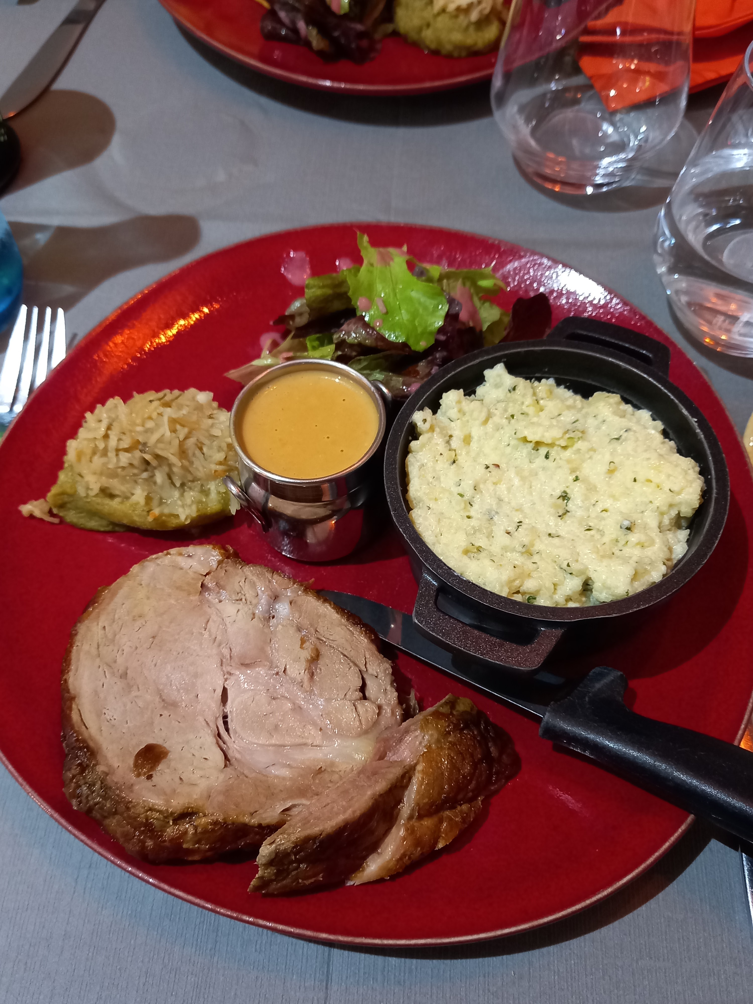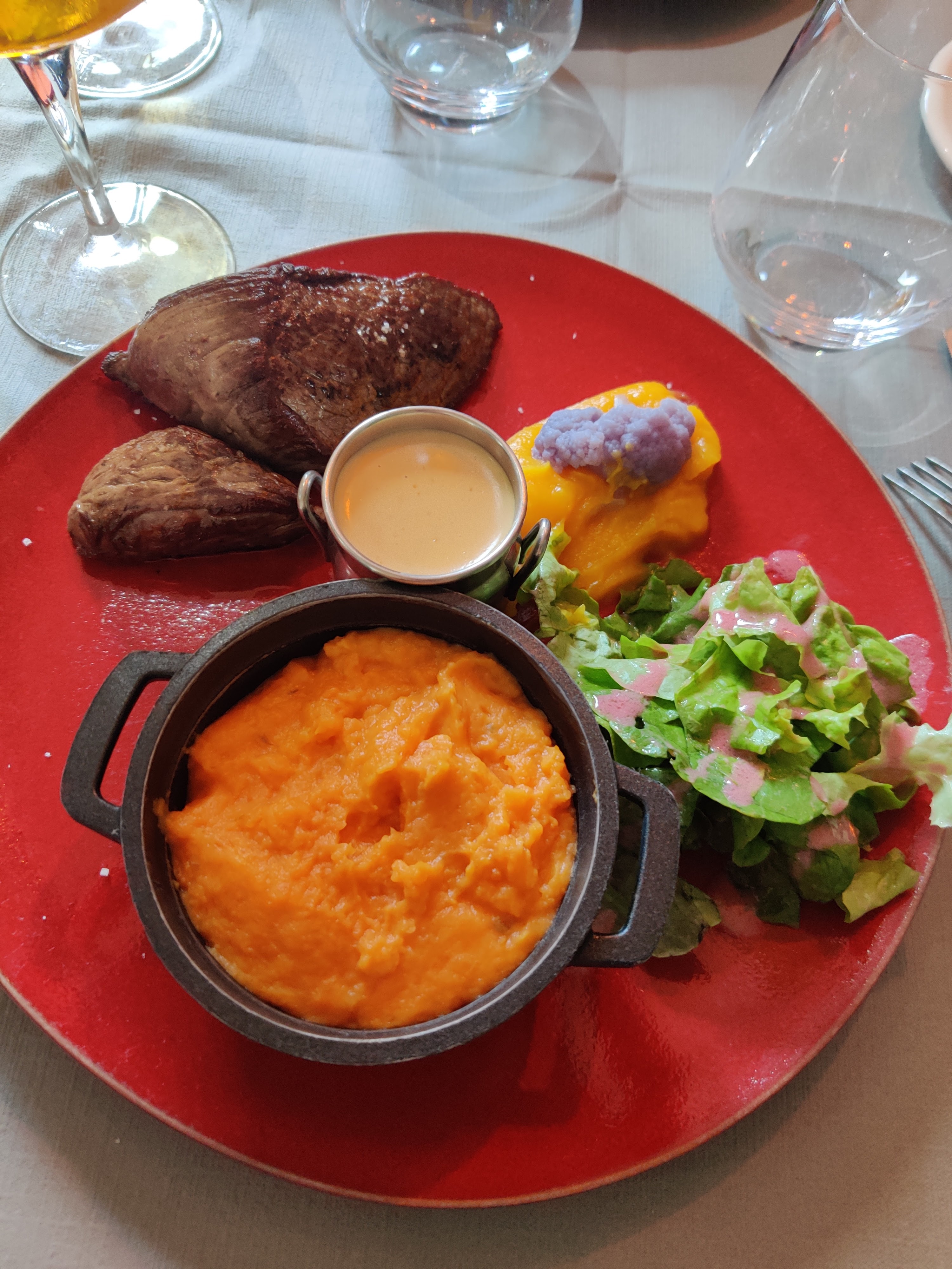 J'ai choisi l'agneau effiloché, et la famille la cuisse de canard ,l'entrecôte de bœuf. La viande était goûteuse,tendre et la garniture purée de carottes,crozet à la sauce tomate ,c'était juste délicieux. La sauce est toujours à part donc c'est top. La salle est petite mais c'est agréable et le service est de qualité. Top. Le prix est un peu élevé mais la qualité le justifie. Produits du coin je pense. Je n'ai pas pu goûter les desserts , car le plat était très copieux.