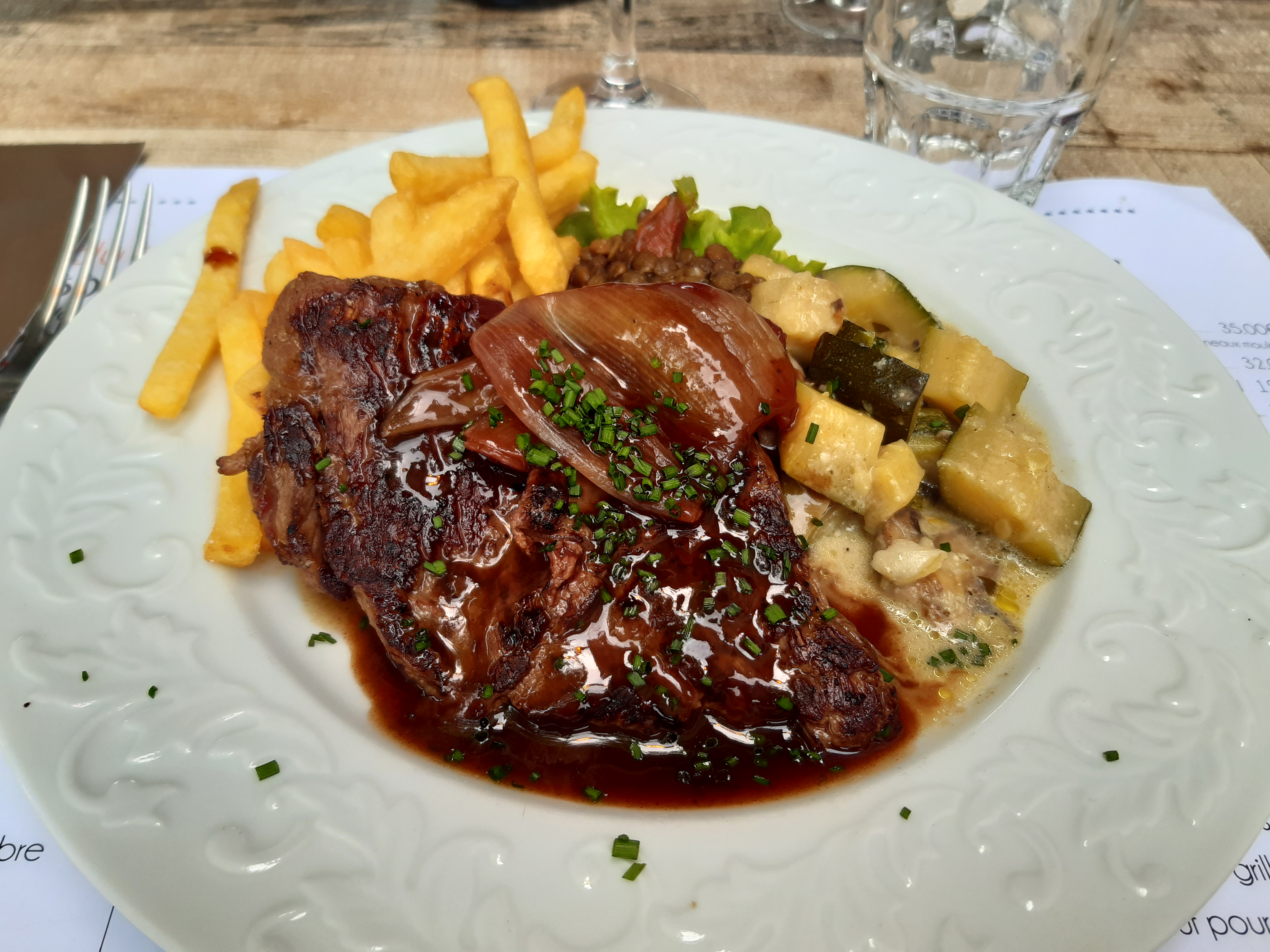 Menu à 20€ (entrée, plat, dessert, café) très bon et copieux. Salade césar délicieuse et belle pièce de viande avec sauce aux cèpes. Cuisine authentique et faite maison.