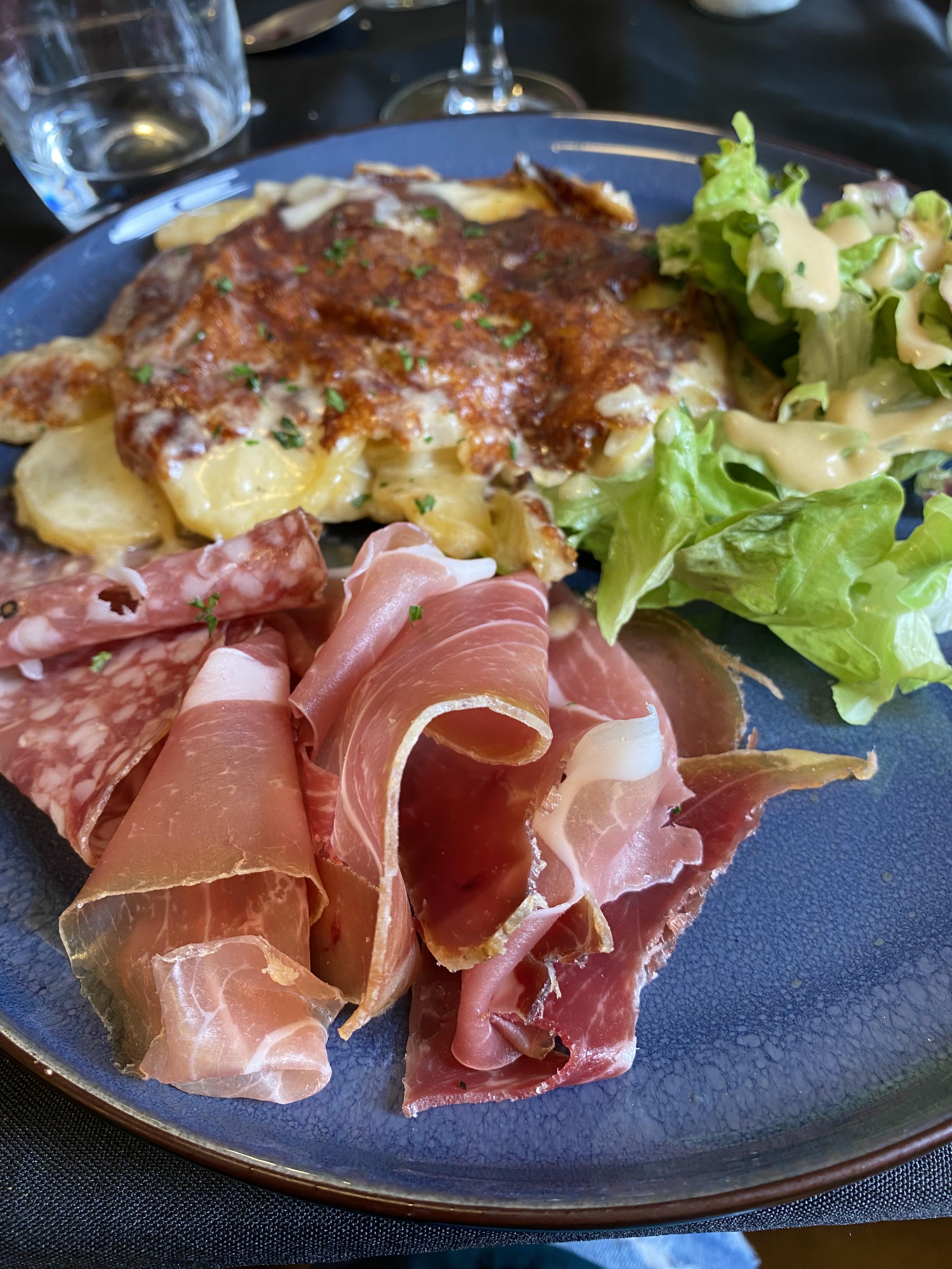 Assiette auvergnate à partager, accueil chaleureux, eau et biscuit pour le chien... top !