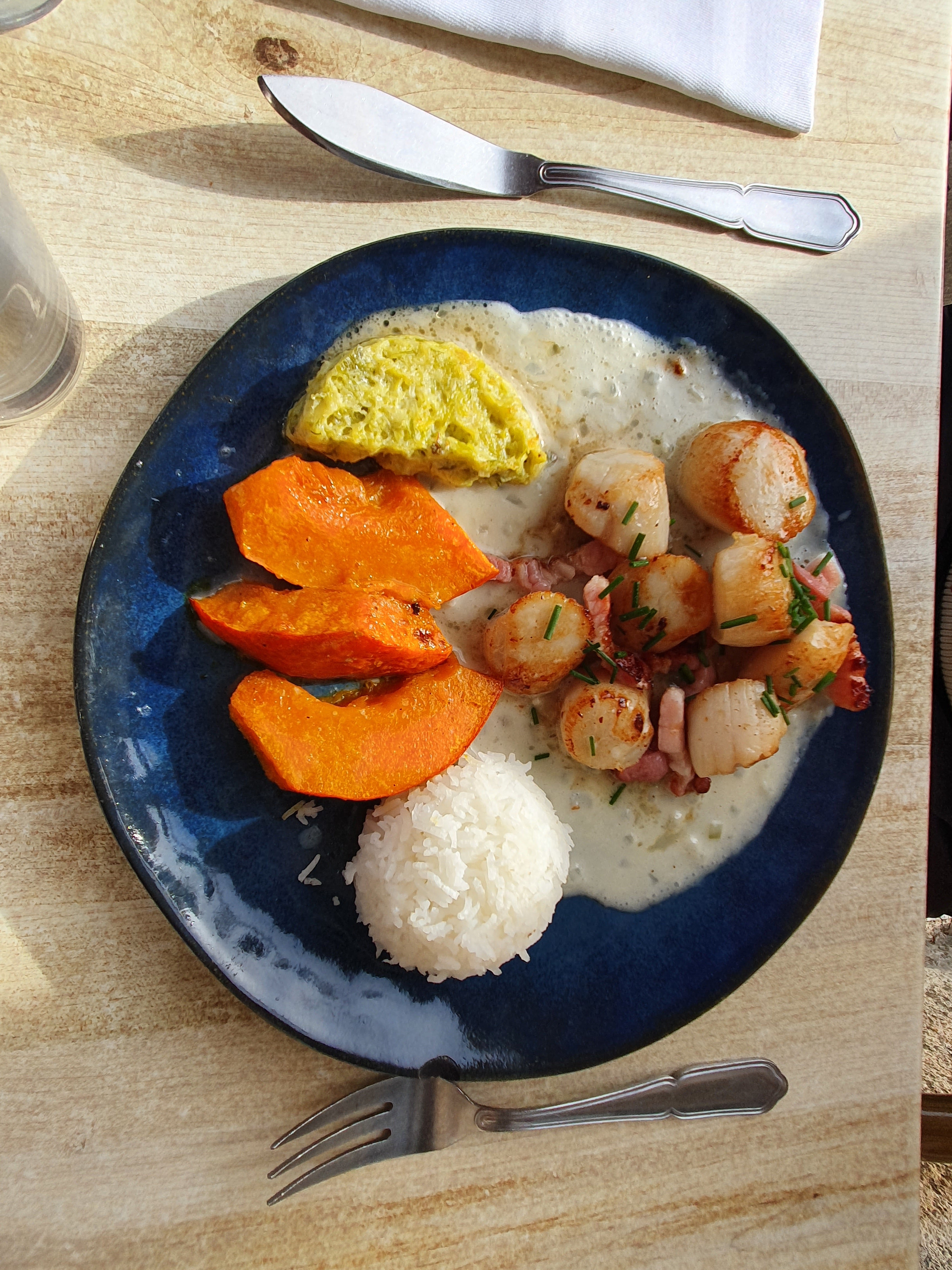 Jolie arrivée sur le port en attendant de nous rendre au restaurant. Accueil agréable de la patronne avec qui nous avons pu échanger pleinement, avant, pendant et après le repas. Nous avons pu dire quelques mots au chef cuisinier, son mari. Pour en venir au repas et au vin (poulpe au chorizo et ses légumes de saison, arrosé d'un verre de Pouilly fumé). Un délice moëleux et original. Ce restaurant propose ce que l'on peut trouver d'intéressant en terme de pêche du moment. Bref, un excellent moment dont on se souviendra.
