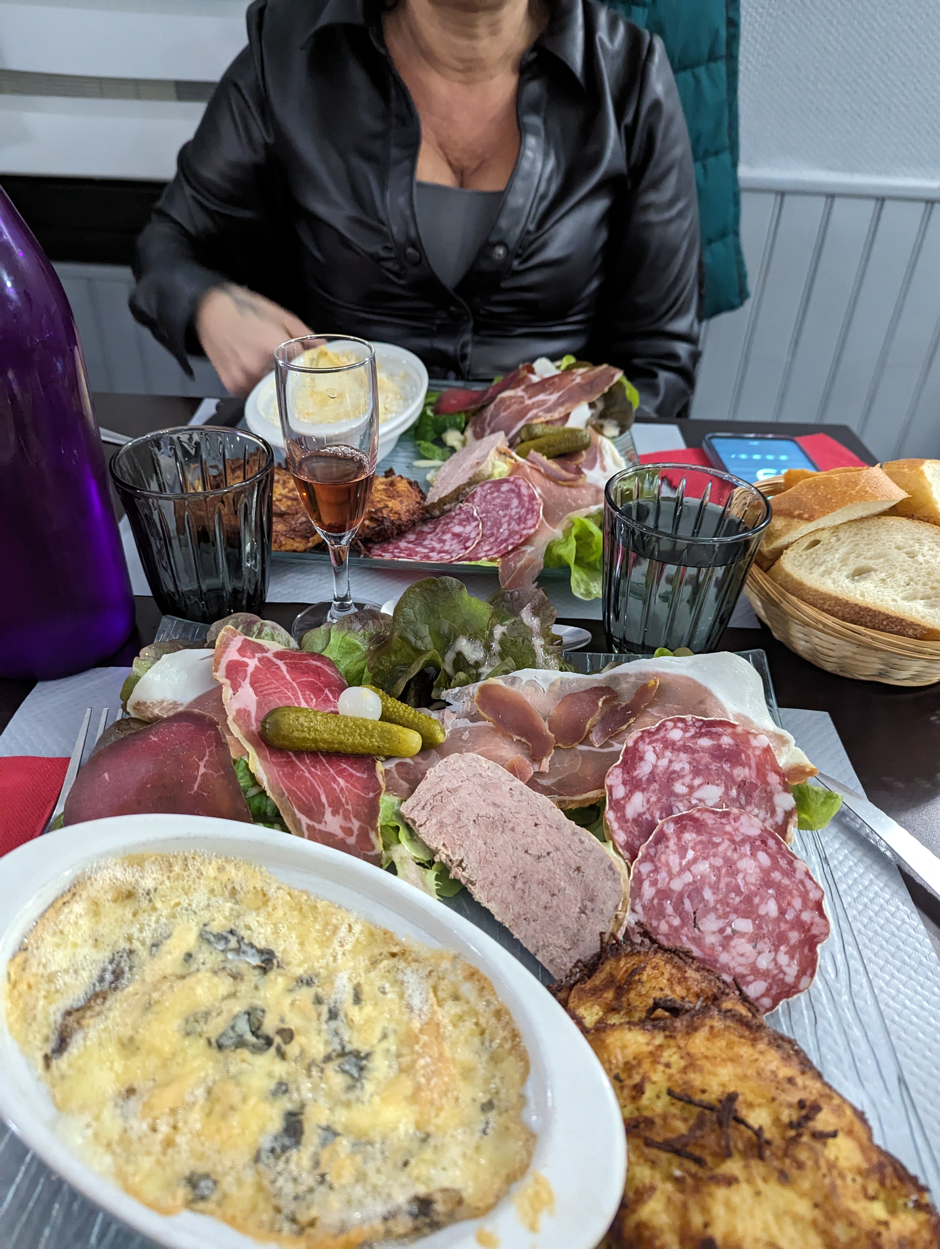 Nous avons pris de la charcuterie (coppa, saucisson, jambon cru...), du reblochon, de la tête de veau, des cuisses de grenouilles, de la friture, des râpées. La charcuterie était bonne, le reblochon aussi. Pour les cuisses de grenouilles, il manquait du citron et de la persillade. La friture avait un goût amer. Les râpées étaient très bonnes.