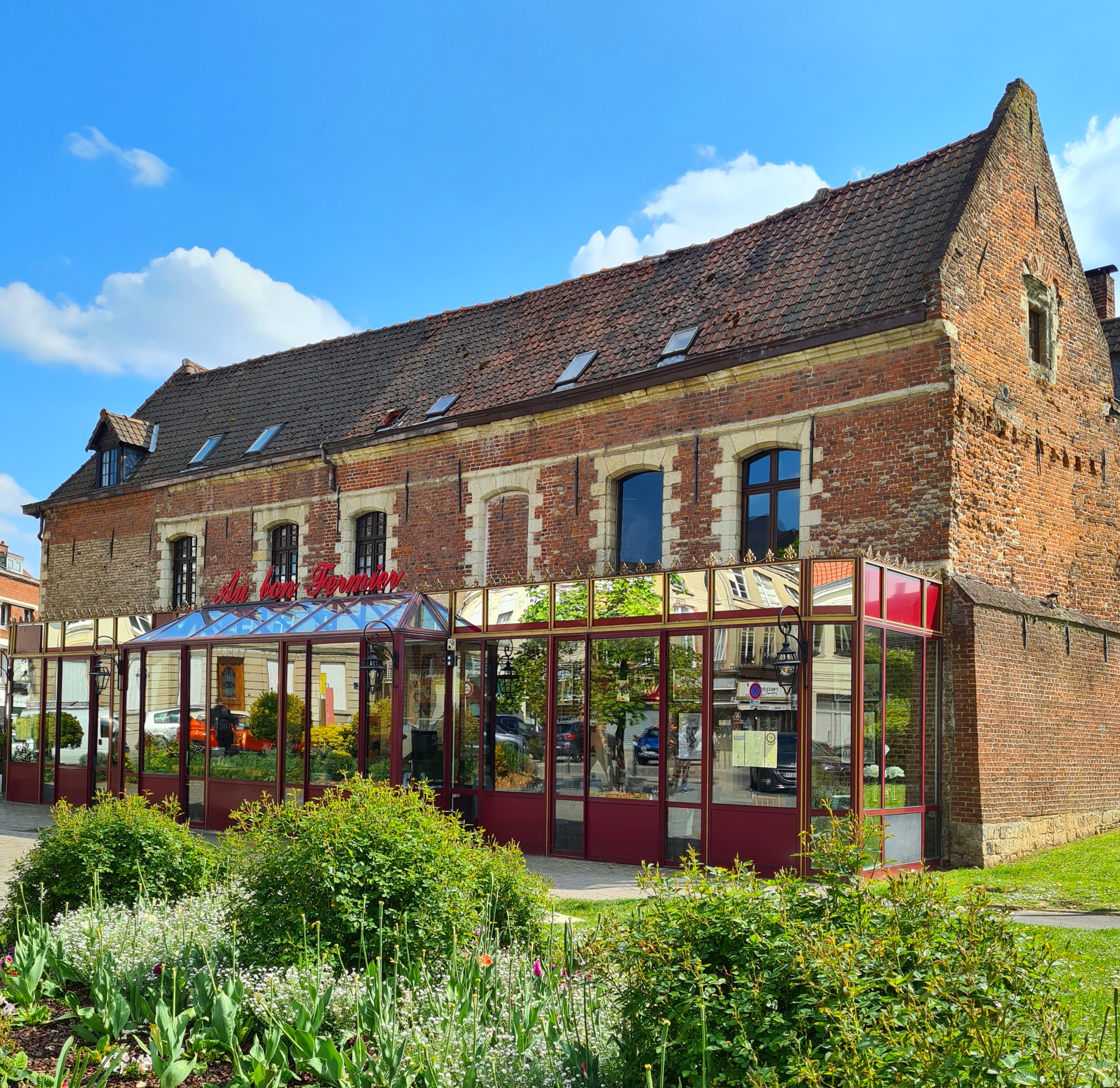 Tout d'abord, le cadre. Un relais de poste du XVI ème dans une petite ville du Nord ( originaire de Provence oblige !) qui constitue un vrai signal urbain dans le cœur de Valenciennes (avec l'office du tourisme). L'espace architectural a été très intelligemment exploité en intégrant les anciennes écuries comme salle de restauration. Les pavés au sol, la décoration, abondante, pertinente, sans être sur-chargée participe à la création d'une ambiance qui rappelle l'imaginaire des relais de poste de l'époque. L'énorme cheminée, gérée de main de maître par une spécialiste de la rôtisserie (au demeurant très professionnelle et efficace), trouve son pendant avec le salon tendu de volages cramoisis où un pianiste joue des morceaux de qualité. Le chef vous accueille avec une proche distinction, à l'image de l'ensemble du personnel qui associe subtilement l'esprit de Paul Bocuse ( très présent), avec un réel souci de votre bien être. Les plats sont ainsi constitués de produits locaux de très grande qualité et cuisinés de façon à associer l'esprit du lieu et le type de cuisson. Les conseils sont pertinents et la réussite de la soirée garantie.( Nous avons eu la délicate surprise d'une attention du personnel pour notre anniversaire.) L'hôtellerie est encore plus surprenante. La distribution des chambres traverse des espaces variés, au travers d'un cheminement évoquant les ruelles médiévales menant, avec surprise de salons aux différentes chambres se référant chacune à des artistes locaux. La décoration s'appuyant sur la statuaire religieuse crée une réelle rupture avec l'aspect brut des superbes briques d'époque. Le maintien des éléments architectoniques in situ contribue à la conception d'une ambiance très originale et spécifique dans un cadre d'un confort extrême. ( La literie est excellente, les draps en coton épais remarquables, les serviettes de bains douces et moelleuses à souhait). Le séjour au Bon Fermier est une expérience incontournable pour les amateurs de qualité, de référence culturelle et authenticité.