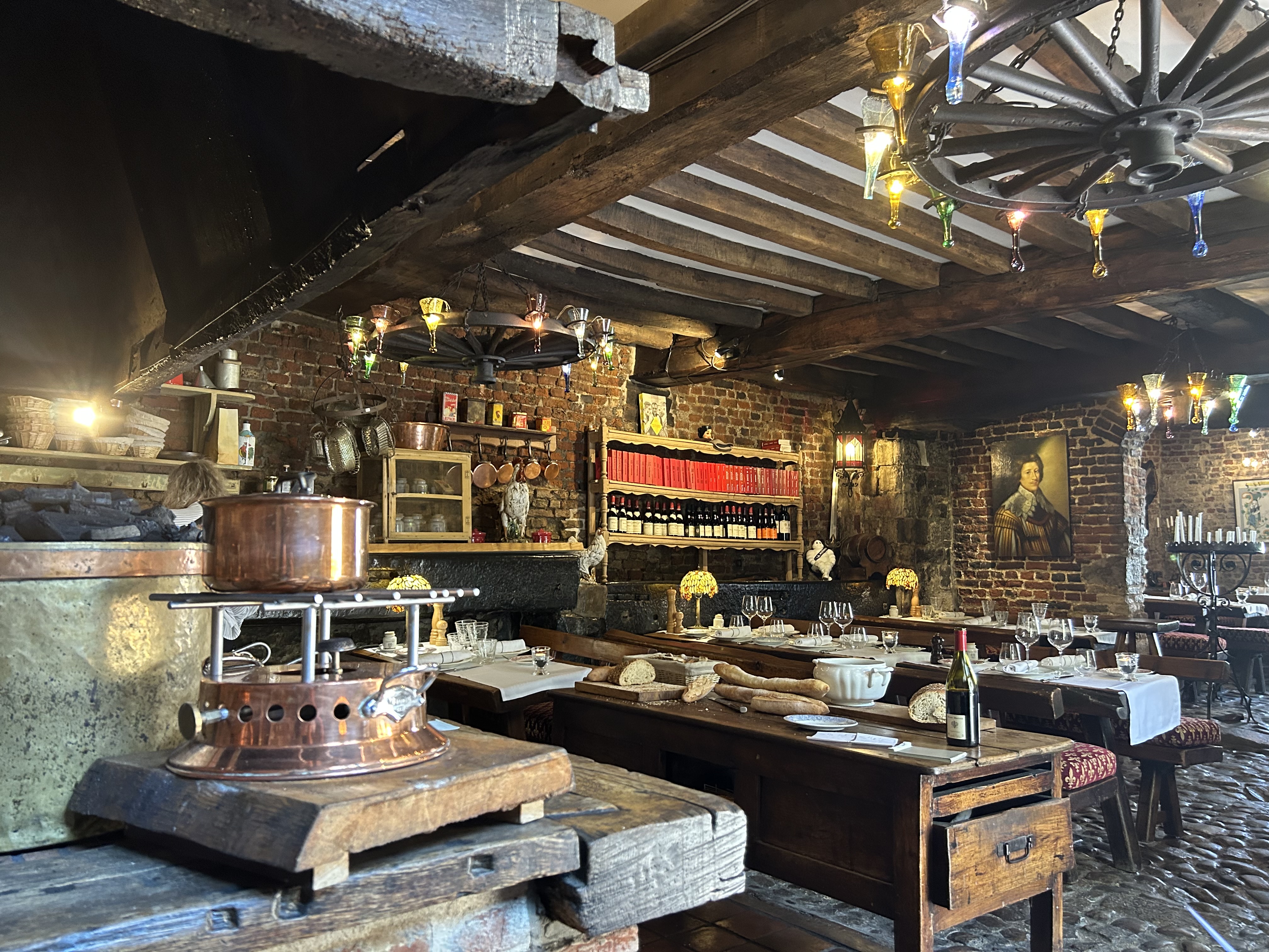 Un endroit extra ordinaire, quel que soit le prix faites vous plaisir, cochon a la broche, gambas, feuilleté au maroilles, homard, carré d'agneau etc etc on se croirait dîner dans le château du roy, un moment magique qui vaut le voyage. Chambres à l'image du bâtiment, très bien, lit très confortable, éviter les chambres qui donnent côté rue plus bruyantes avec les pavés.