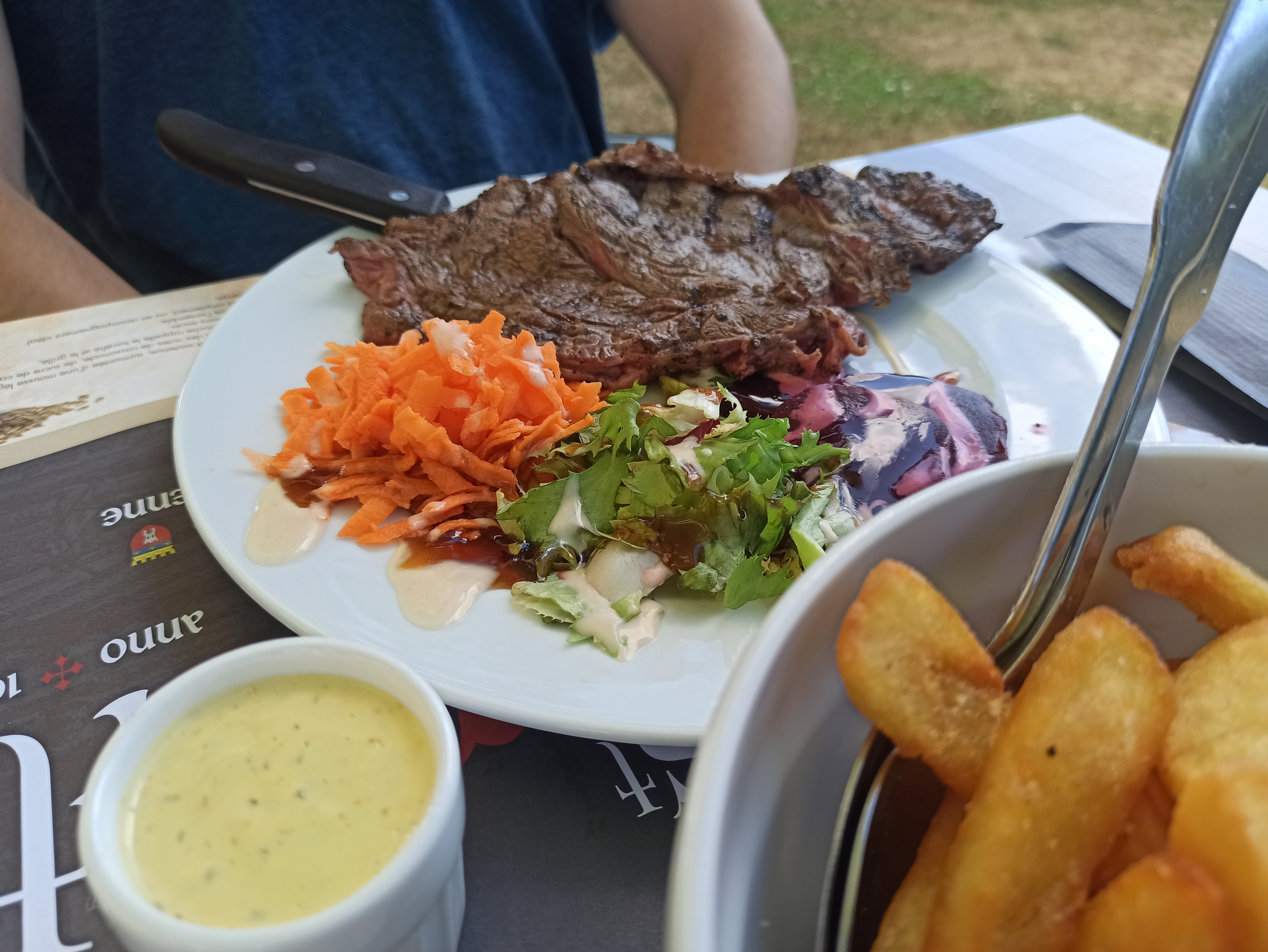 Un cadre extérieur très sympa avec point de départ pour une ballade digestif. Pour la cuisine, viande d'origine étrangère, carottes râpées en accompagnement avec quelques frites et sauce mayonnaise en stick. Dommage. Cuisiner avec des produits locaux, faire une sauce mayonnaise maison, diversifier les légumes auraient été appréciés.