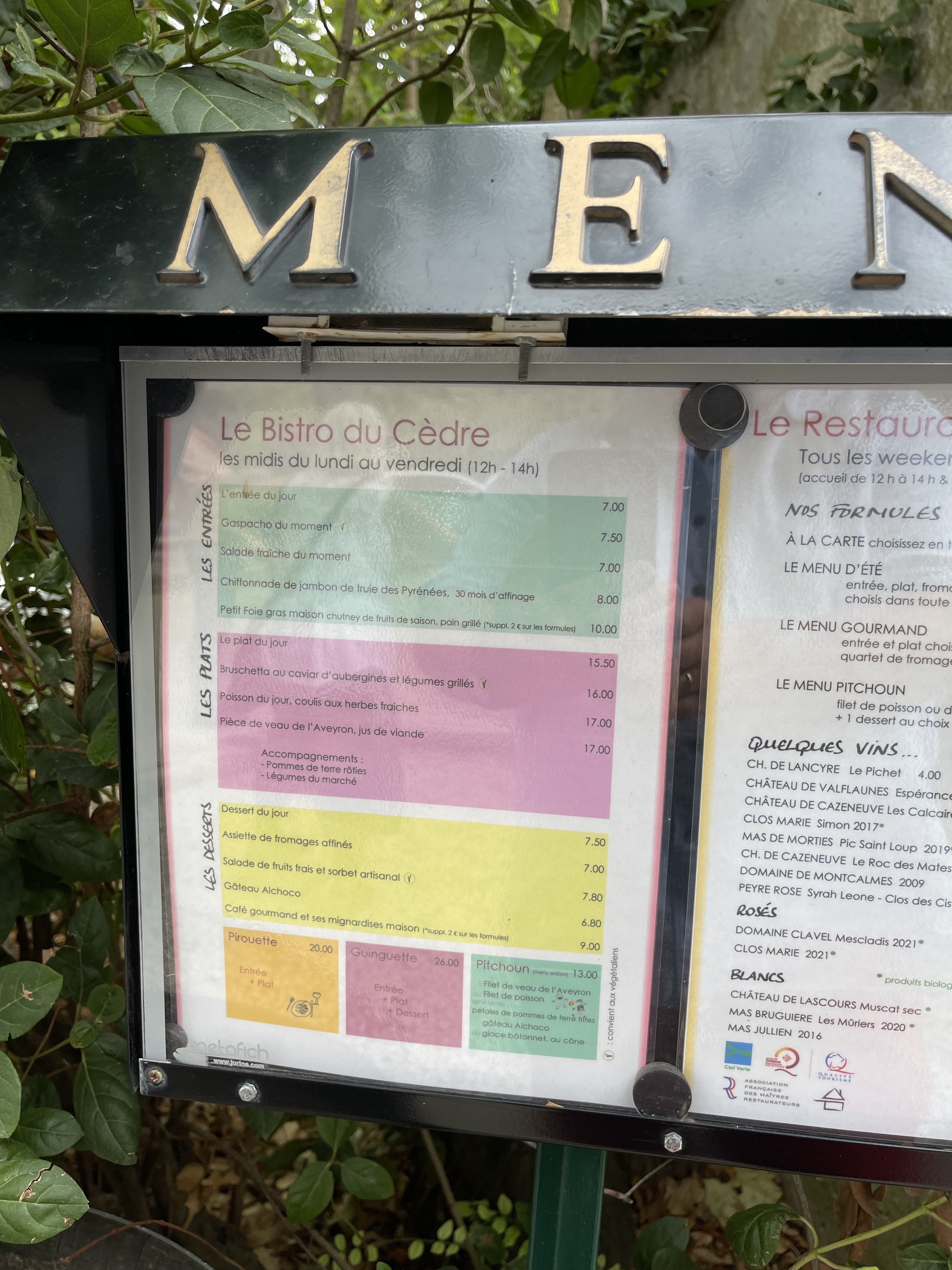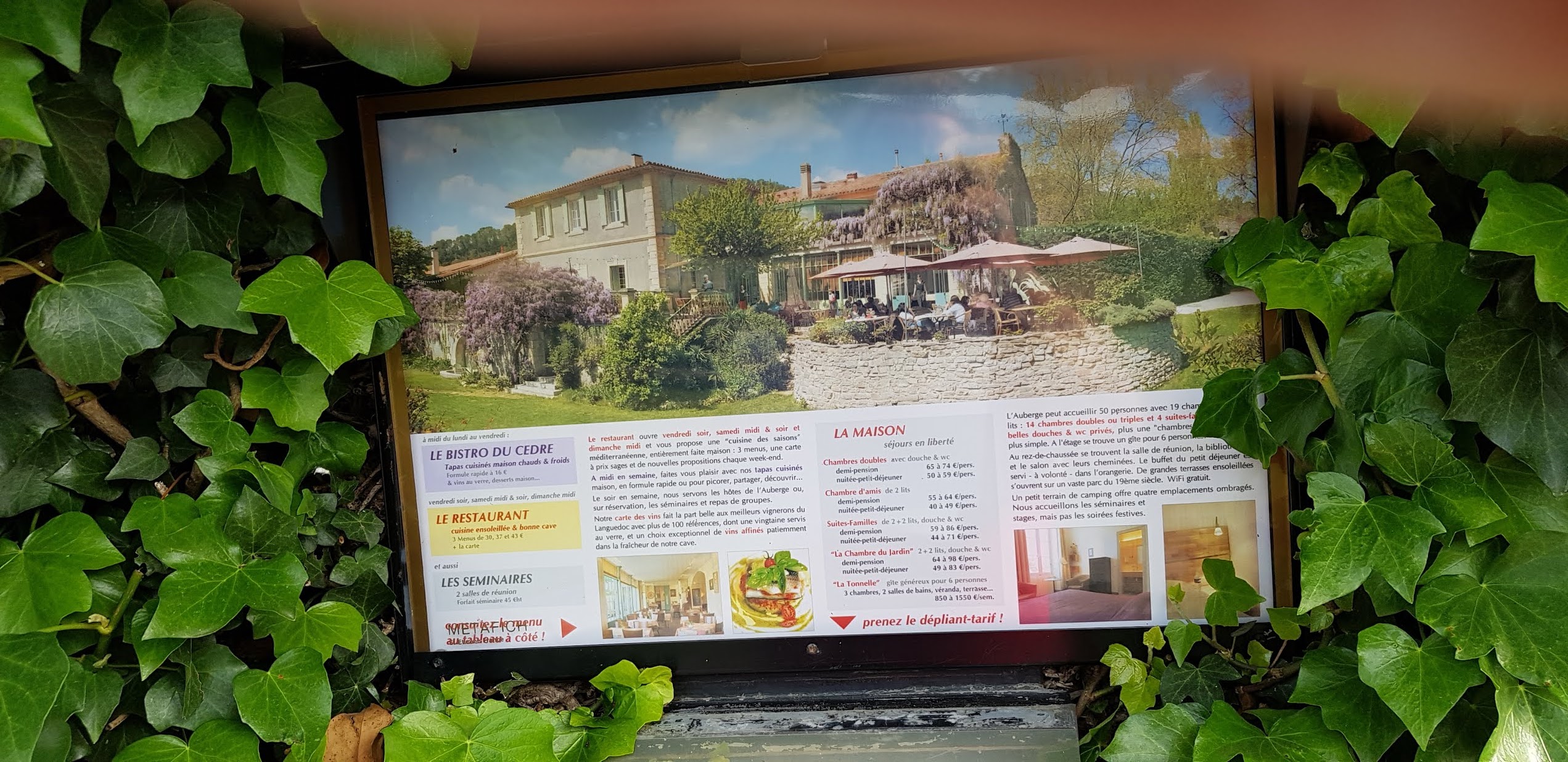 1 joyau dans un écrin de verdure: Cet endroit est magique il y a peu de chance de le trouver sur les guides touristiques ou à l’annuaire des bons gastronomiques, en tout cas nous ne l’avons pas vu, et pourtant il vaut 10 fois le détour, on nous l’avait chaudement recommandé, connaissant nos aspirations et exigences. C’est le duo parfait, cadre et cuisine ! auxquels on peut ajouter, accueil et service. Un 21 Octobre à midi avec 25 degrés et un magnifique soleil, la terrasse est pleine, et les parasols sont indispensables tellement il fait beau, surement l’été indien. -Le cadre tout d’abord est hypnotisant subjuguant, calme absolu, plénitude verdoyante, face au pic St Loup, une grande bâtisse aux volets verts et parasols oranges vous invite a un délicieux moment, et qui trône au milieu du parc ; sa majesté « le cèdre géant » qui domine tout du haut de ses centenaires, et de sa cinquantaine de mètres, impossible de le rater, et le nom de l’auberge apparait comme une évidence, il a dû en voir du monde, des saisons, et des changements depuis toutes ces années . Ce qui séduit immédiatement c’est ce calme cette quiétude rassurante pas de bruit juste le chant des oiseaux qui sont ici dans leur élément, un magnifique parc de verdure très arboré. L’auberge qui fait aussi hébergement hôtel propose une bonne restauration, différents menus et une carte de vin comme je n’en ai jamais vu, et pourtant des établissements nous en avons fréquenté des centaines, 36 pages de tous les cépages, blanc, rosé, rouge, champagne, si vous ne trouvez pas votre bonheur c’est tout simplement que vous n’aimez pas le vin, 1 grand bravo à Françoise. La maitresse des lieux, omniprésente, vous conseille, elle connait mieux que quiconque sa cave, ses vignerons et les cépages des environs, ainsi les accords mets et vins sont parfaits. Le menu gourmandise, pour 43€ est vraiment très équilibré élaboré à partir de produit frais saisonniers, entrée, plat, fromage et dessert, plusieurs choix sont possibles avec quelques suppléments bien étudiés, c’est d’un excellent niveau, les présentations sont soignées, les assiettes copieusement remplies, mettent en appétits, les produits locaux sont mis en valeur. Bref un très bon moment qu’on ne voudrait pas interrompre, tant le lieu a du charme. Si on s’accorde pour dire que, ce qui fait venir les clients à 50% c’est le cadre, l’ambiance, la situation, ce qui les fera revenir à coup sûr, c’est ce qu’il y a dans les assiettes. Ici c’est bien le cas, séduction d’abord, et enchantement ensuite… Surtout ne pas oublier de réserver et de se renseigner sur les dates de fermeture car de octobre a Mars le restaurant ne sert plus.