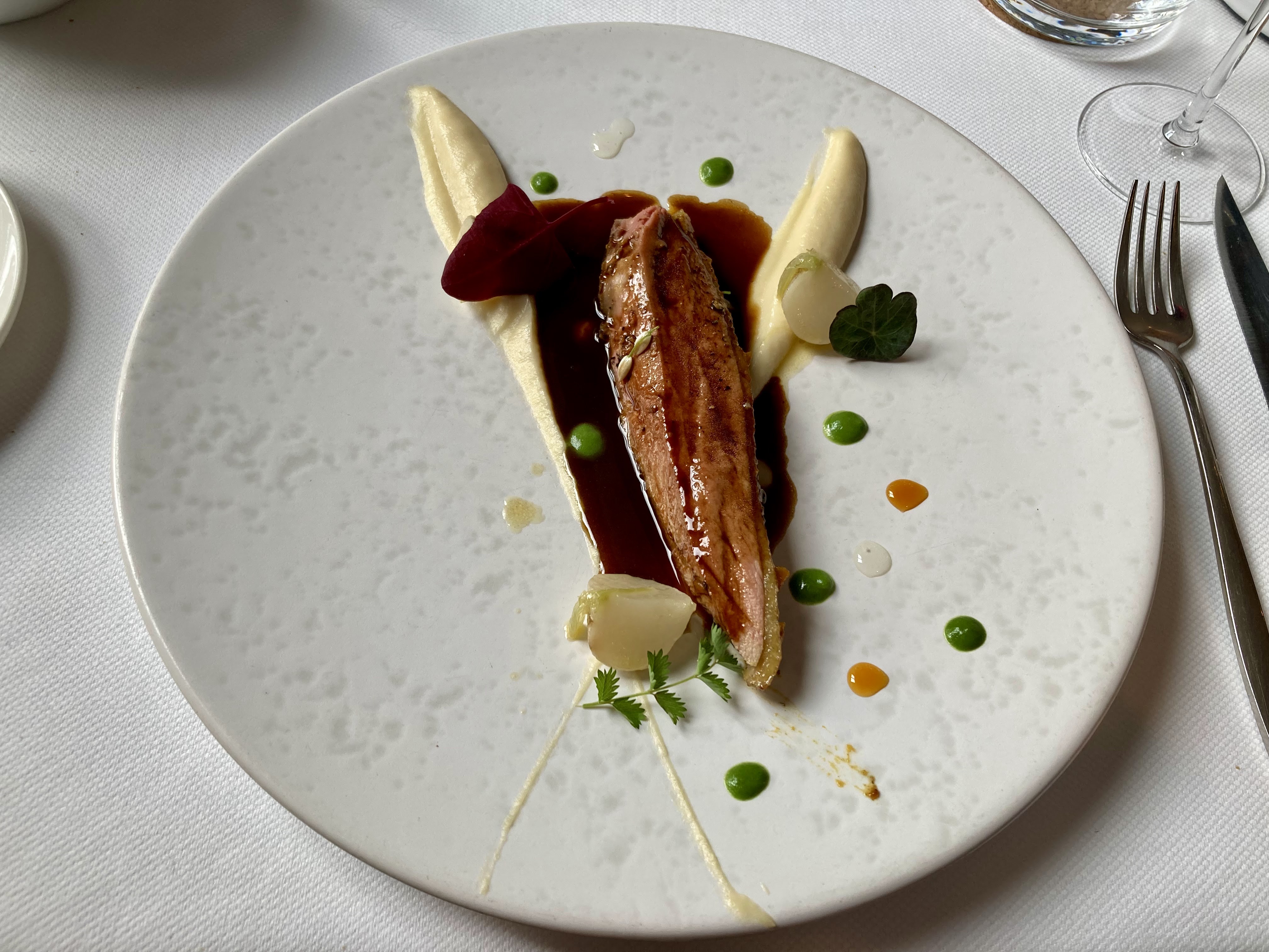 Nous avons pris un délicieux déjeuner aujourd'hui. Nous avons opté pour le menu à 65 €, qui était merveilleux. Je pense qu'une deuxième entrée aurait été trop pour nous. La taille des plats était parfaite, pas trop petite. Les raviolis aux escargots et le plat de truite étaient particulièrement bon. La canette était parfaitement cuite et délicieuse, mais pas aussi intéressante que la truite. Nous avons tous les deux apprécié le comté râpé qui était étonnamment léger. J'ai trouvé que la tarte aux fraises de mon mari manquait un peu de fraises et que mon soufflé au Grand Marnier et à la rhubarbe était un peu trop sucré. Nous sommes habitués et apprécions les longs déjeuners, mais comme nous n'étions que deux, il m'a semblé que nous attendions un peu trop longtemps entre les plats. C'est un beau décor, mais malheureusement la vue sur la rue n'est pas très attrayante. Néanmoins, nous recommandons vivement ce merveilleux restaurant et sommes très heureux d'habiter non loin de là. Nous attendons avec impatience notre prochaine visite !