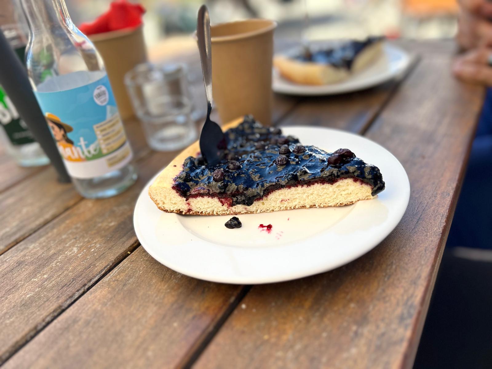 une bonne tarte myrtilles après 1h50 de vélo, miaam😋. charmant petit restaurant, avec les cloches de vache en fond sonore😉
