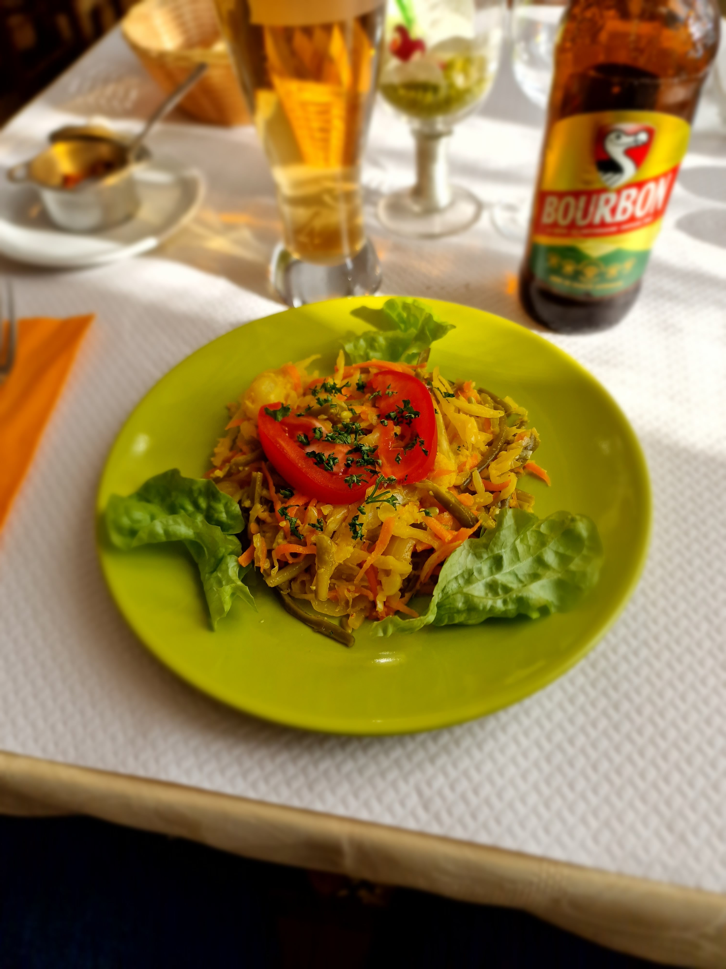 De retour du marché de St août ce mardi, nous avions envie de dépaysement. Pas déçus de la carte, on reconnaît bien les plats faits maison de part le peu de choix sur la carte et surtout la bonne cuisine réunionnaise : goût, couleurs et allié aliments et épices. Plat épicé et non pimenté ! Le gâteau à la patate douce est une belle douceur.