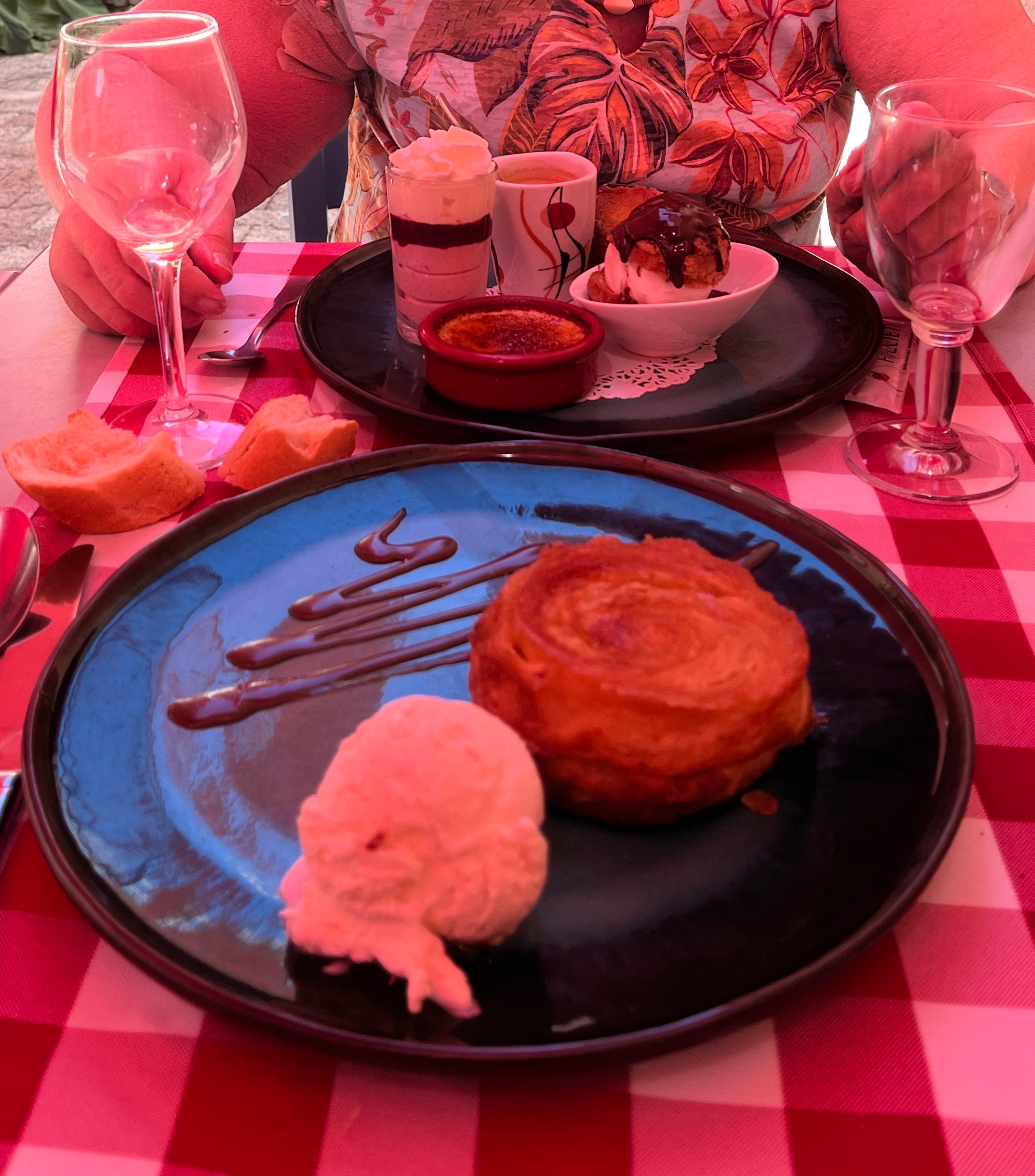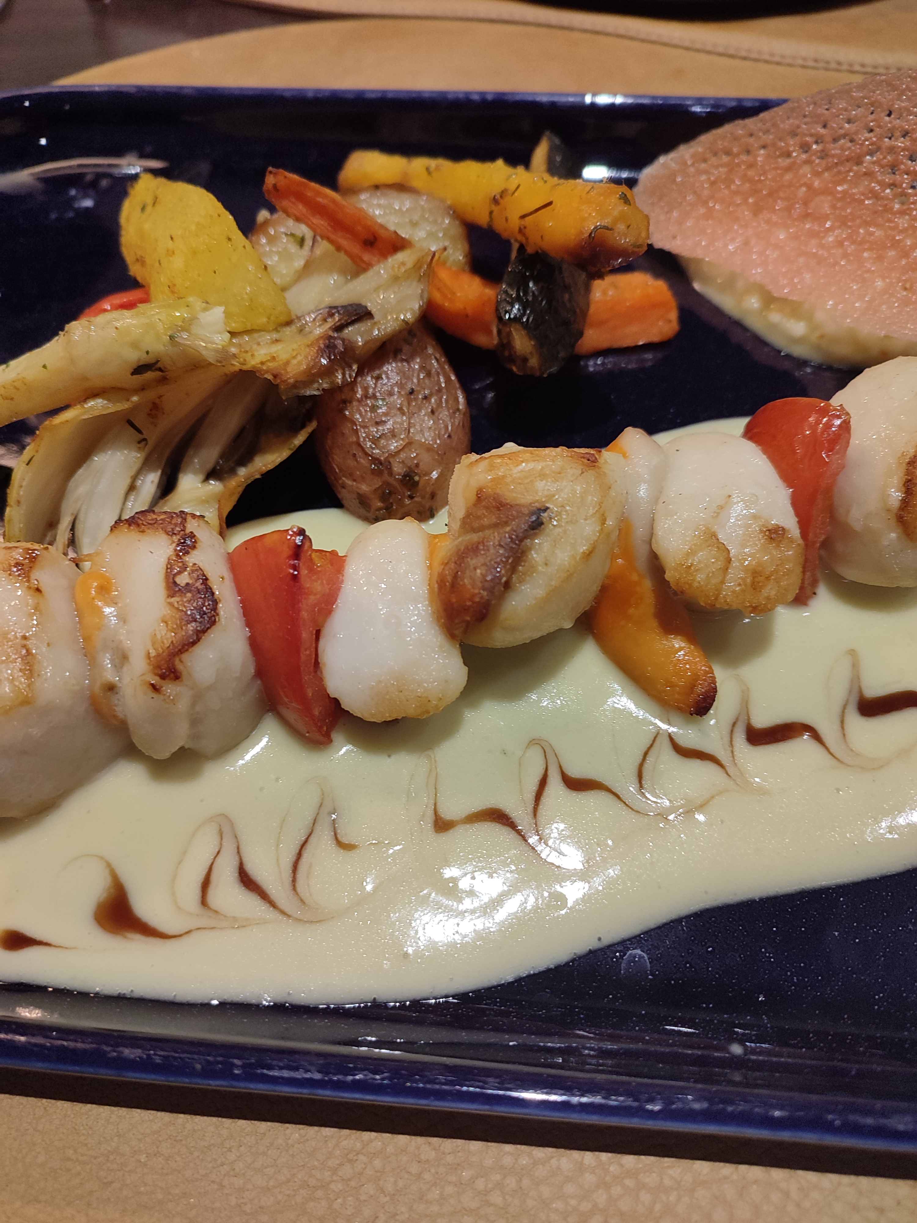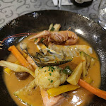 Gratin de Saint Jacques et crevettes flambé au pastis et ses légumes à tomber par terre . De grosse Saint Jacques moelleuse parfaite cuisson. Dessert, thé gourmand kouign amann, panna cotta top. Un moment agréable avec une amie.