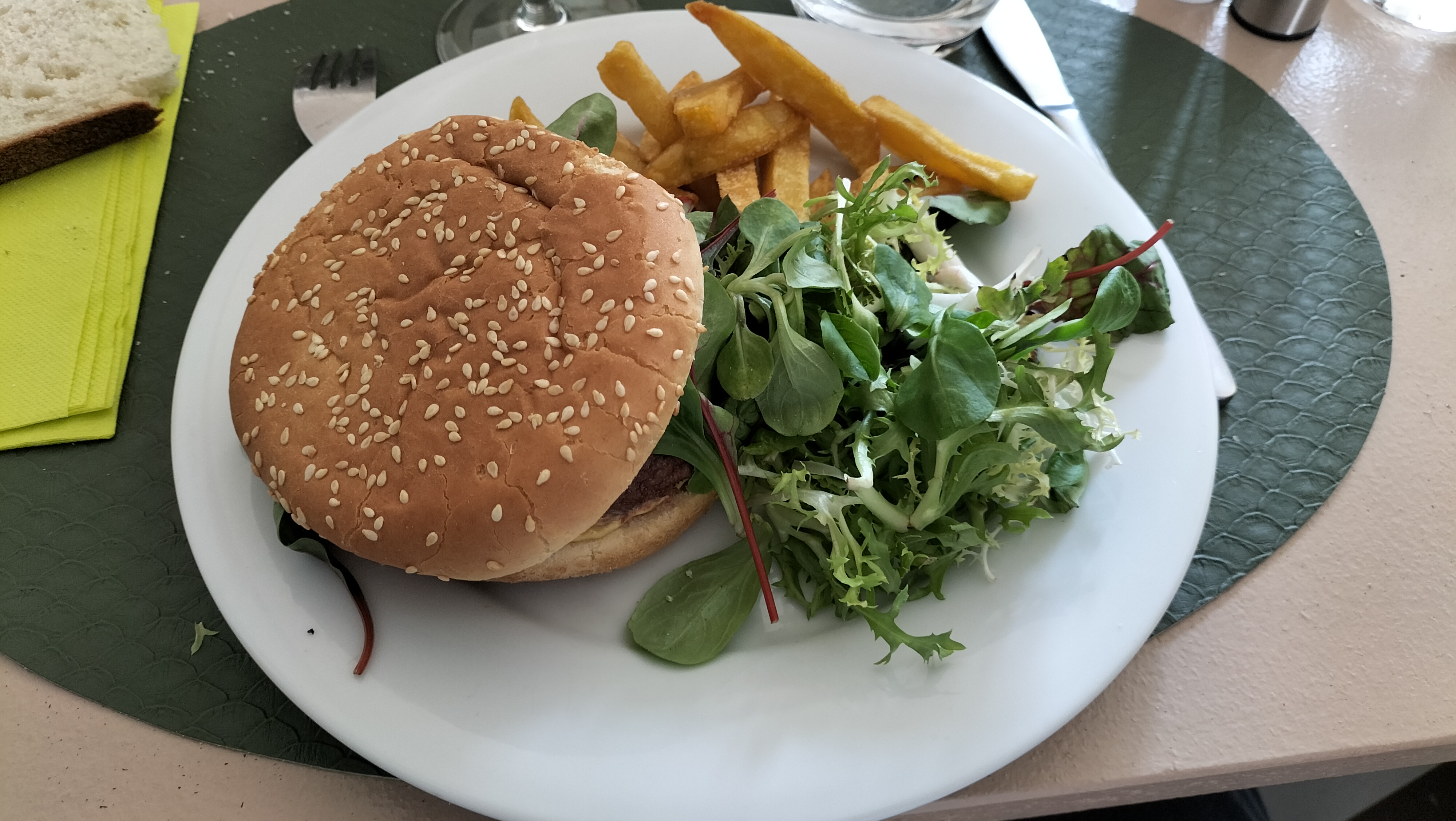 Le hamburger est très bon et bien assaisonné. Un peu plus de frites aurait été un plus. Le dessert, un moelleux au chocolat, était moyen. Compter 5€ pour un verre de vin et environ 24 € pour un plat, un dessert, un verre de vin et 1/2 evian. Endroit très propre et semble avoir été rénové récemment. Très bon accueil.