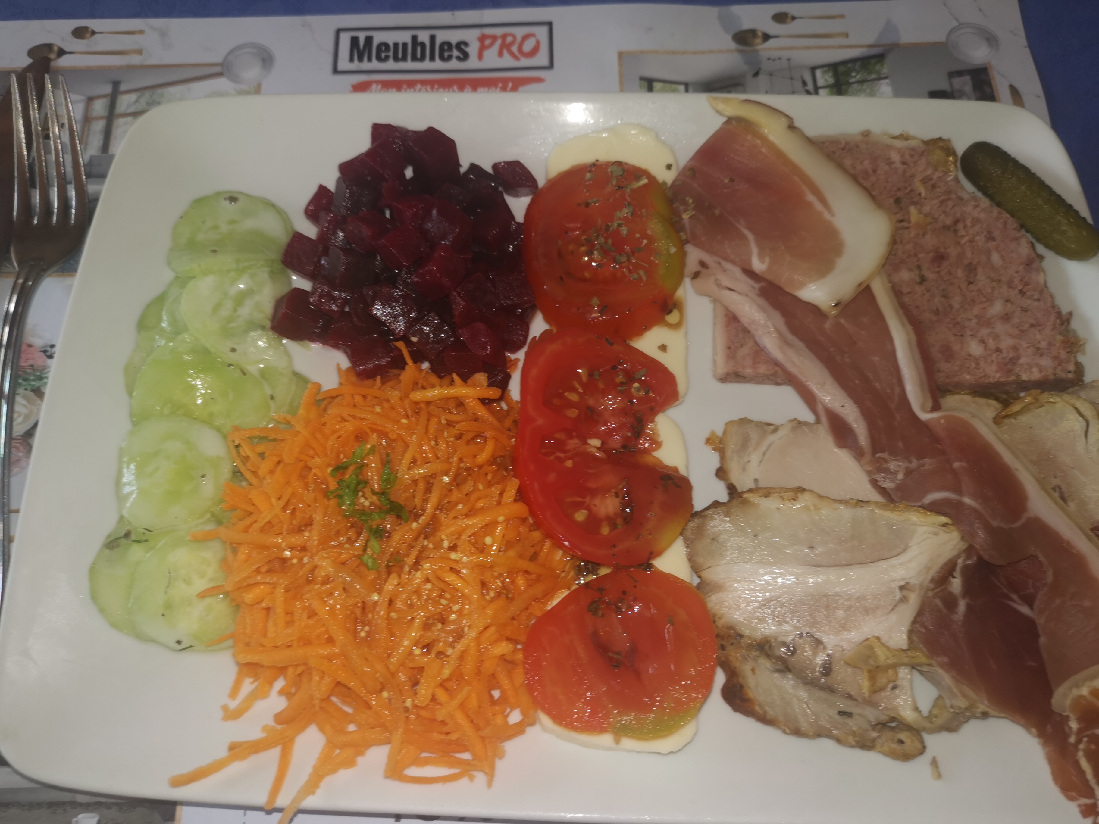 Menu très copieux pour un prix très raisonnable avec des produits de qualité. Bravo!! Je recommande pour un jour ensoleillé en terrasse et pour un jour pluvieux la salle avec ke fruits de cheminée. Testez vous ne serez pas déçus.