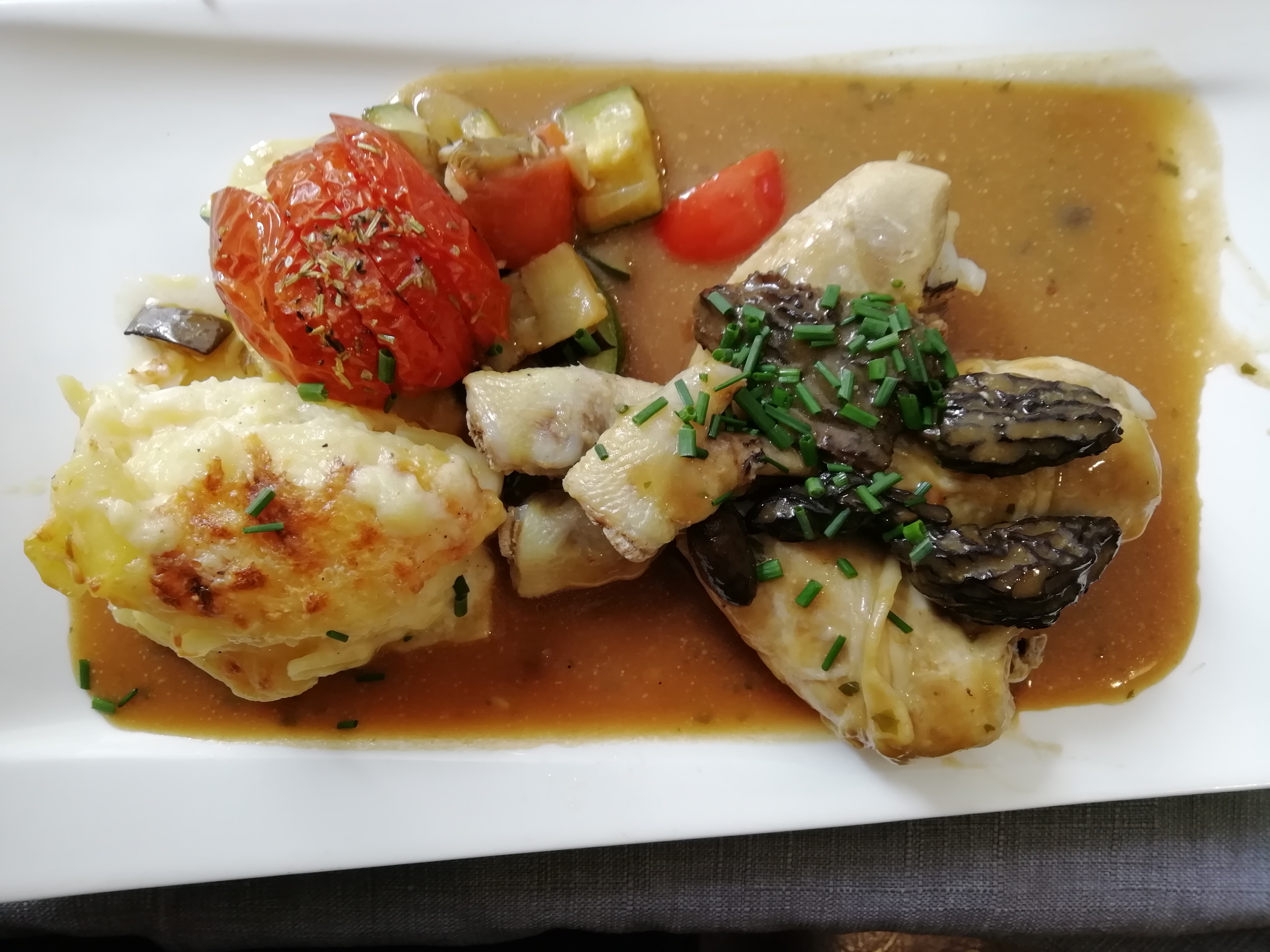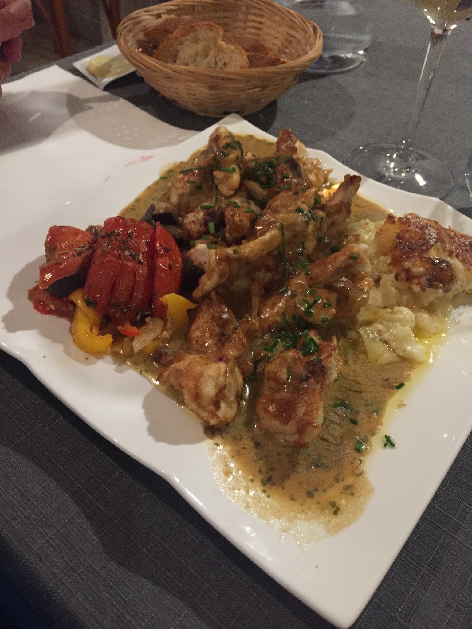 Repas excellent: petite salade de crudités, brechet de poulet à la crème, gratin dauphinois, tomate provençale, haricot vert... et pour terminer une tarte meringue avec coulis fruit de la passion. Une pure merveille avec un service de qualité... avec grasse et discrétion, disponibilité.