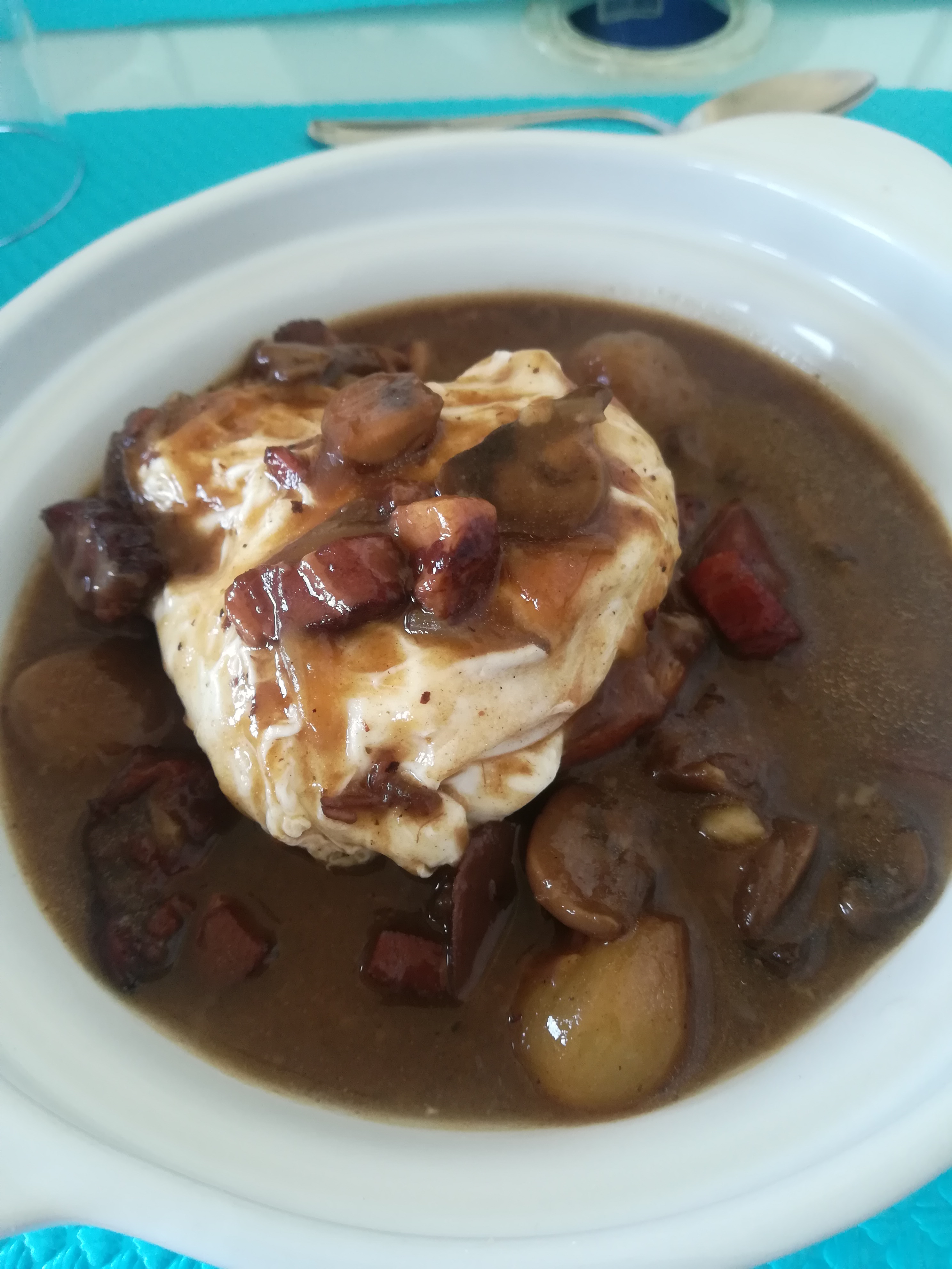 Repas excellent. Oeufs en meurette, saucisse de morteaux avec aligot et profiteroles !! Tout maison, que du bonheur !! Nos papilles se sont régalées !!