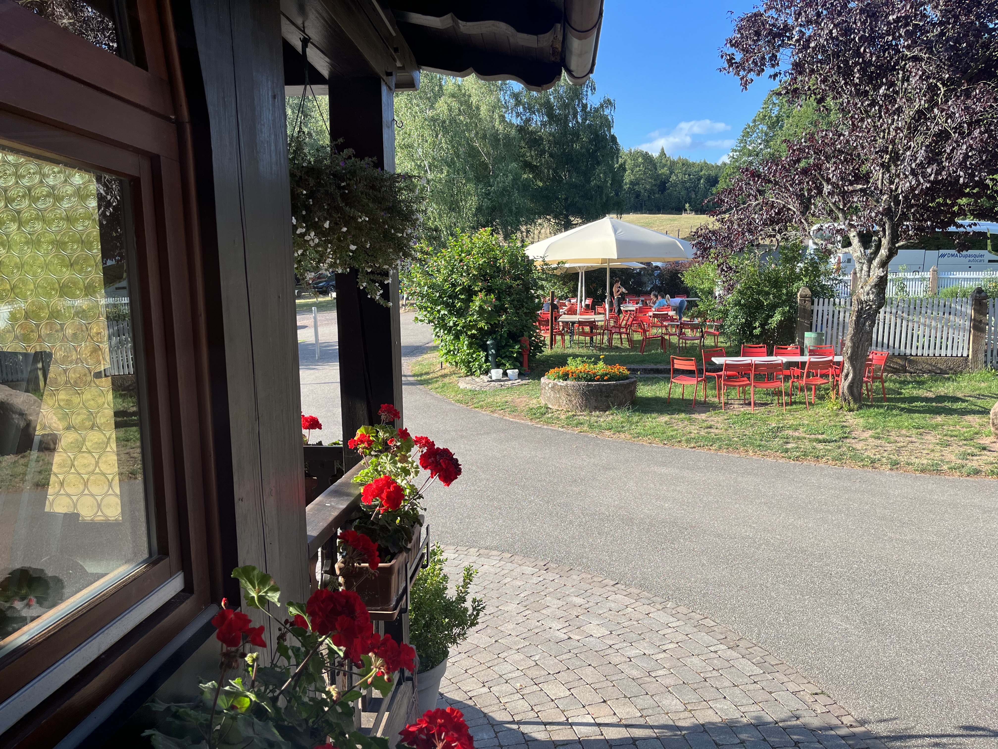 Une auberge bien placée. Deux grandes terrasses, lune couverte un peu sombre, l'autre équipée de parasols. Un service très très lentement sur cette terrasse bien que poli. Aucune carte de glace sur table pour susciter l'envie et uniquement des tables de 4 souvent occupées par deux personnes. 15 minutes pour passer commande a une jeune fille qui marche désespérément a vide. Bien dommage. Le cadre reste toutefois agréable, en bordure de forêt et près d'une aire de jeux pour enfants. De grands parkings à proximité.
