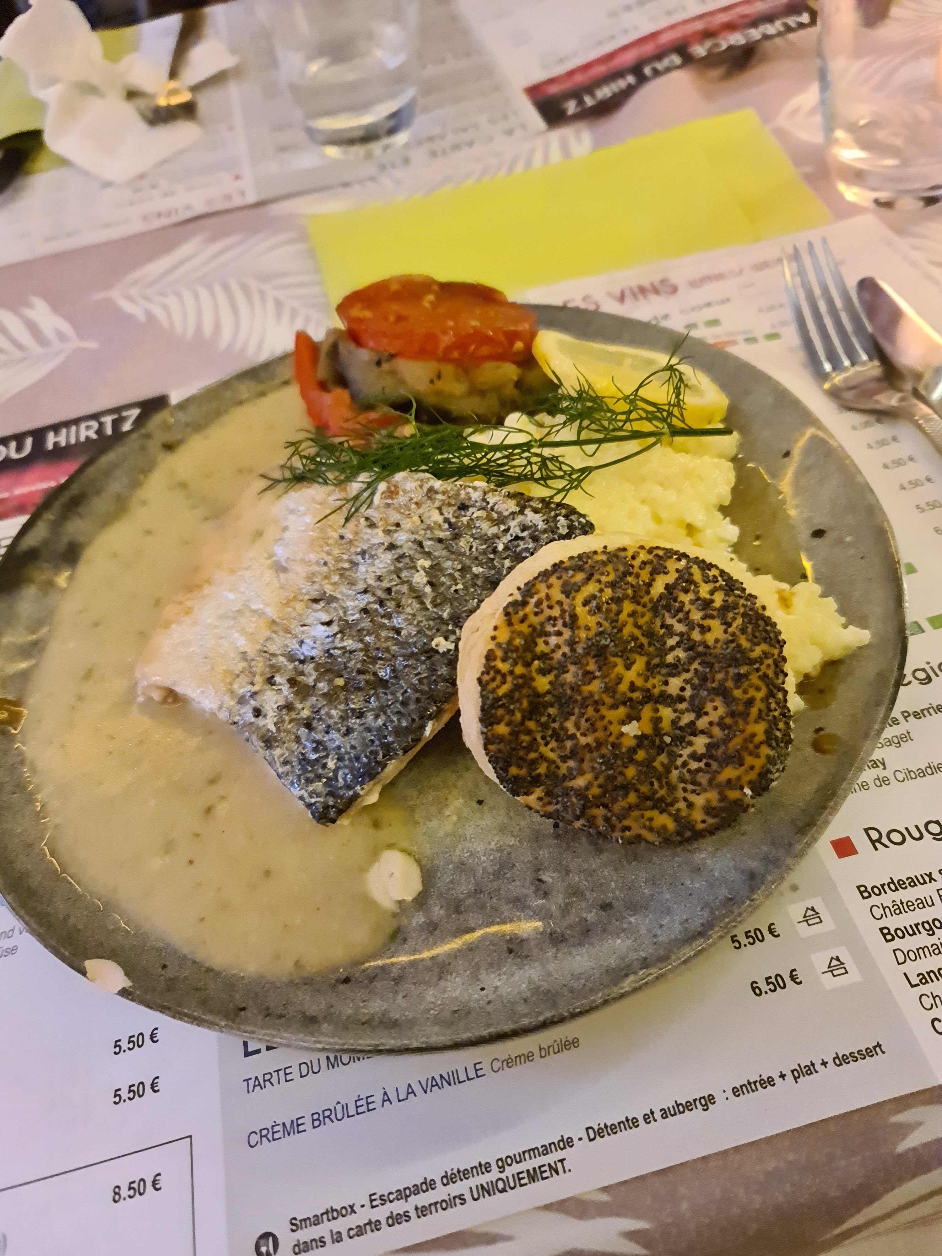On a très bien mangé, bon vin, excellent menu, truite saumonee et carpe frite délicieuses, desserts succulents
