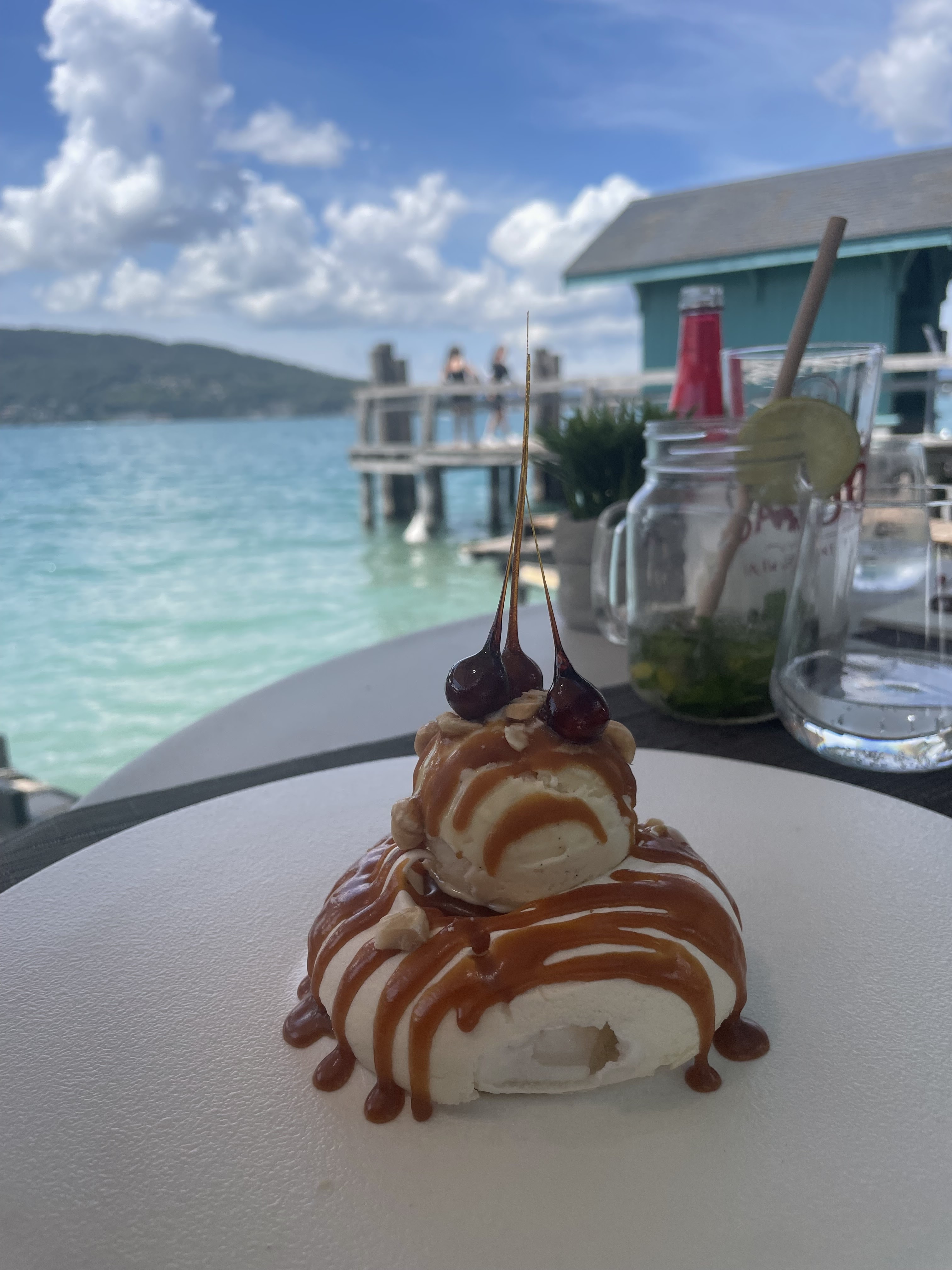 Joli cadre, sur un ponton au bord du lac juste sublime mais tarifs très élevés pour ce qu'on y mange.. 6.50€ un jus d'ananas je trouve le prix excessif !