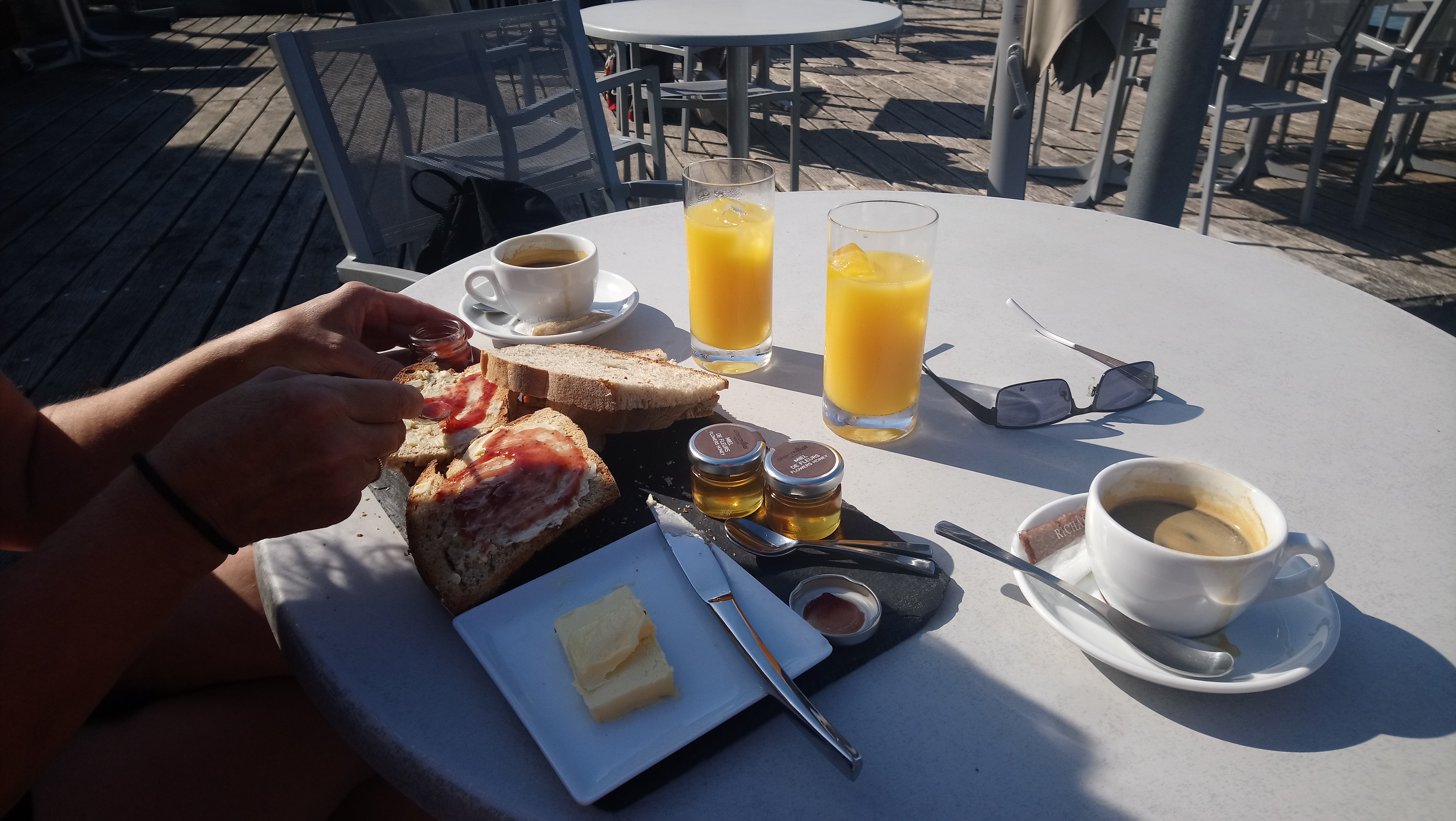 Pas de bonjour. 4 personnes avant nous décident de ne pas rester. Nous nous installons sur une table à l ombre, pas encore débarrassée. Madame, mettez-vous sur une table propre ! On aimerait bien mais toutes les autres tables sont au soleil et vous refusez d ouvrir de nouveaux parasols. Bref, nous avons choisi de suivre nos 4 prédécesseurs. Dommage, le spot est top.