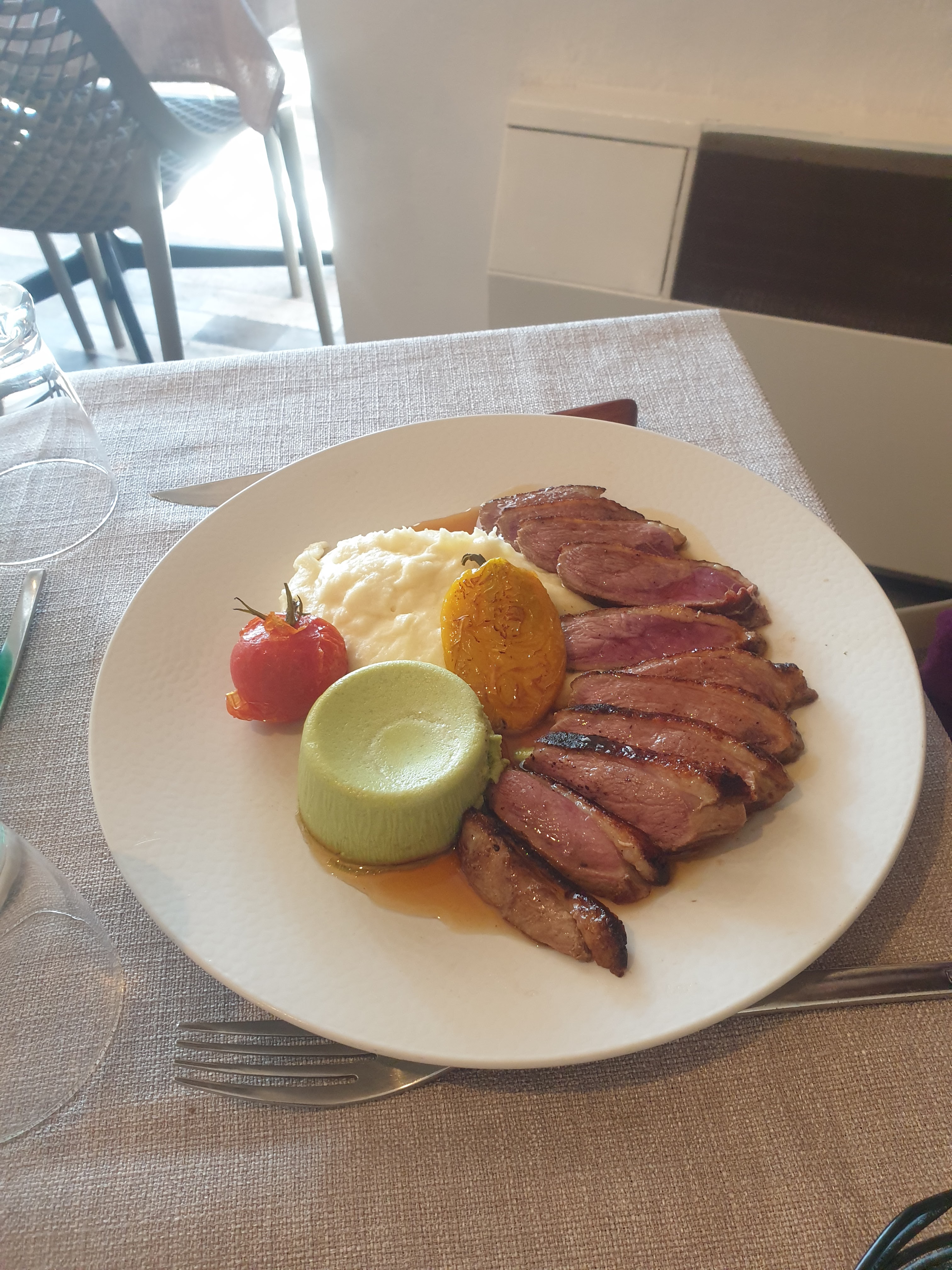 Magnifique restaurant mais vu la chaleur, même sur la terrasse ombragée la chaleur était invivable. Les plats étaient copieux et excellents, le service parfait, et l'accueil est très bien même accompagnée de mon chien. Magnifique vue.