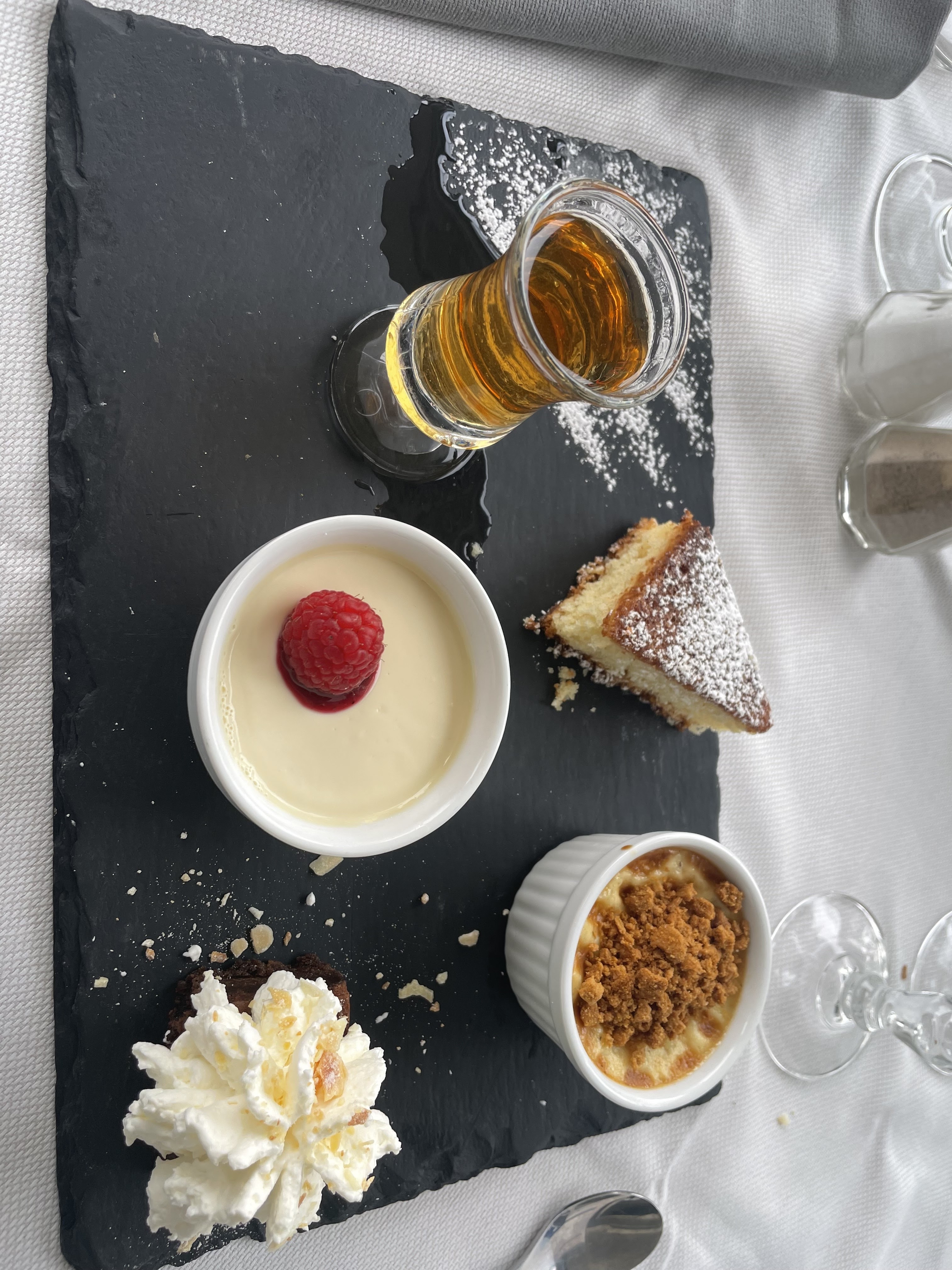 Cadre super Dommage pour nous, la pluie était au rendez vous Nous avons très bien manger, petits salés fait maison avec nos apéritifs Un petit peu chère mais assiettes bien remplis et succulentes Un cadeau pour les enfants que je trouve très sympathique Serveur très souriant et professionnel Pas d'attente à table malgré le monde dans le restaurant Je recommande