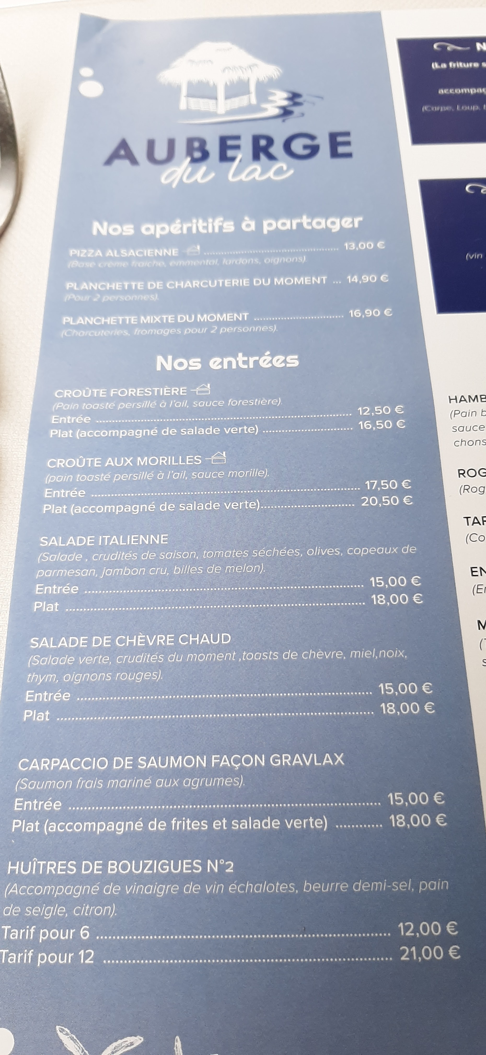 Des expériences mitigées à l’Auberge du lac, avec une qualité du service et des plats qui n’est pas toujours au rendez-vous. L’établissement, notamment en été, est souvent débordé et préfère malheureusement accepter encore plus de clients plutôt que de privilégier la qualité du service et de la cuisine. Le changement de propriétaire a, de façon évidente, eu un impact négatif sur l’ensemble du restaurant. S’agissant du service, certains serveurs soupirent devant nous quand nos demandes ne leur conviennent pas, et l’attente est souvent très importante. Pour les plats, les fritures sont devenues soit très sèches, soit très grasses. Les frites qui les accompagnent sont quant à elles très bonnes avec leur mayonnaise et leur salade. Les pizzas sont souvent très bonnes, mais la qualité est assez variable selon les jours. Le cadre est exceptionnel, avec une belle salle sur l’eau en hiver et des pilotis en été, mais ne justifie pas du tout les prix excessifs pratiqués par l’établissement sur certains produits (notamment les desserts).