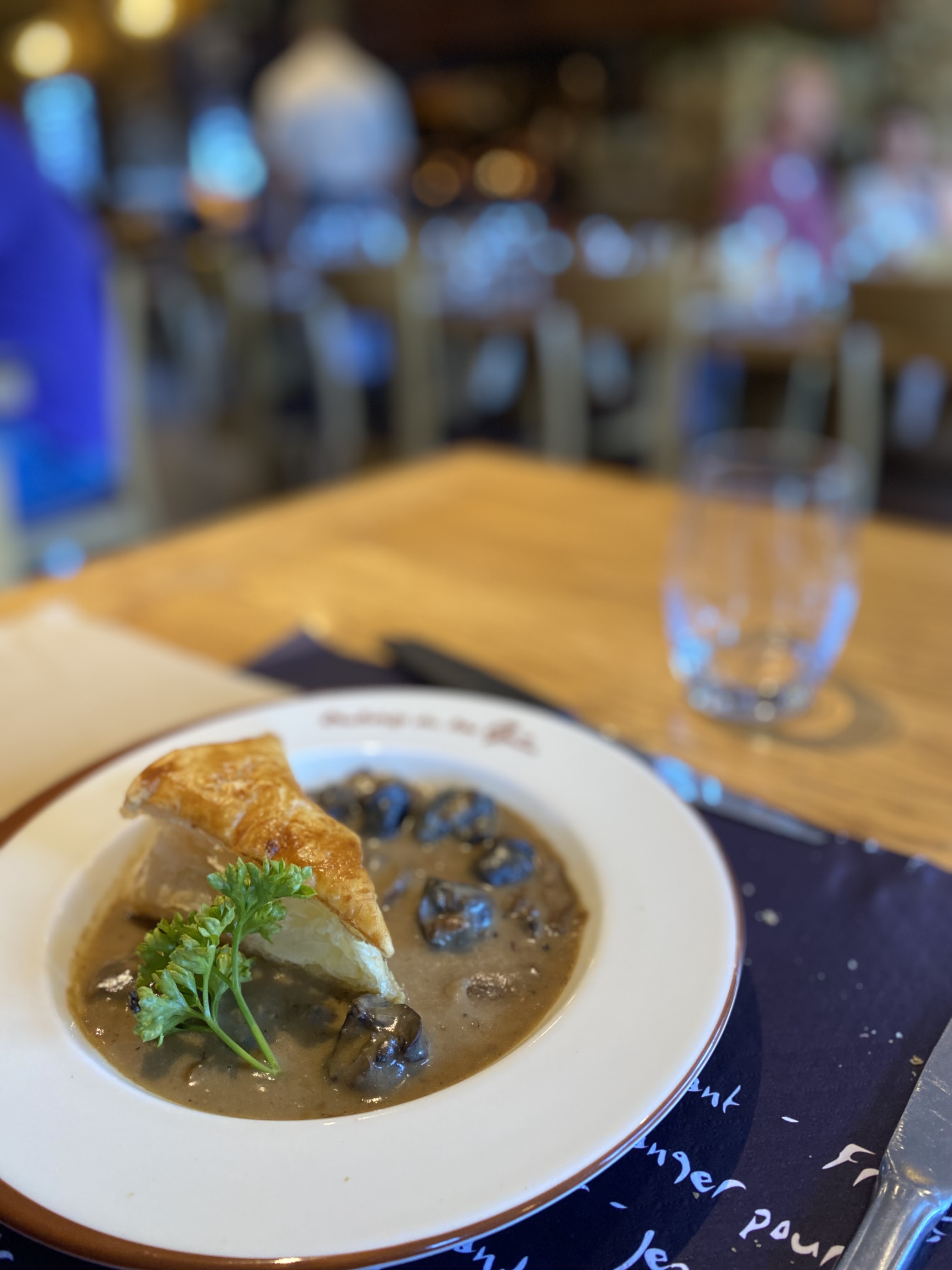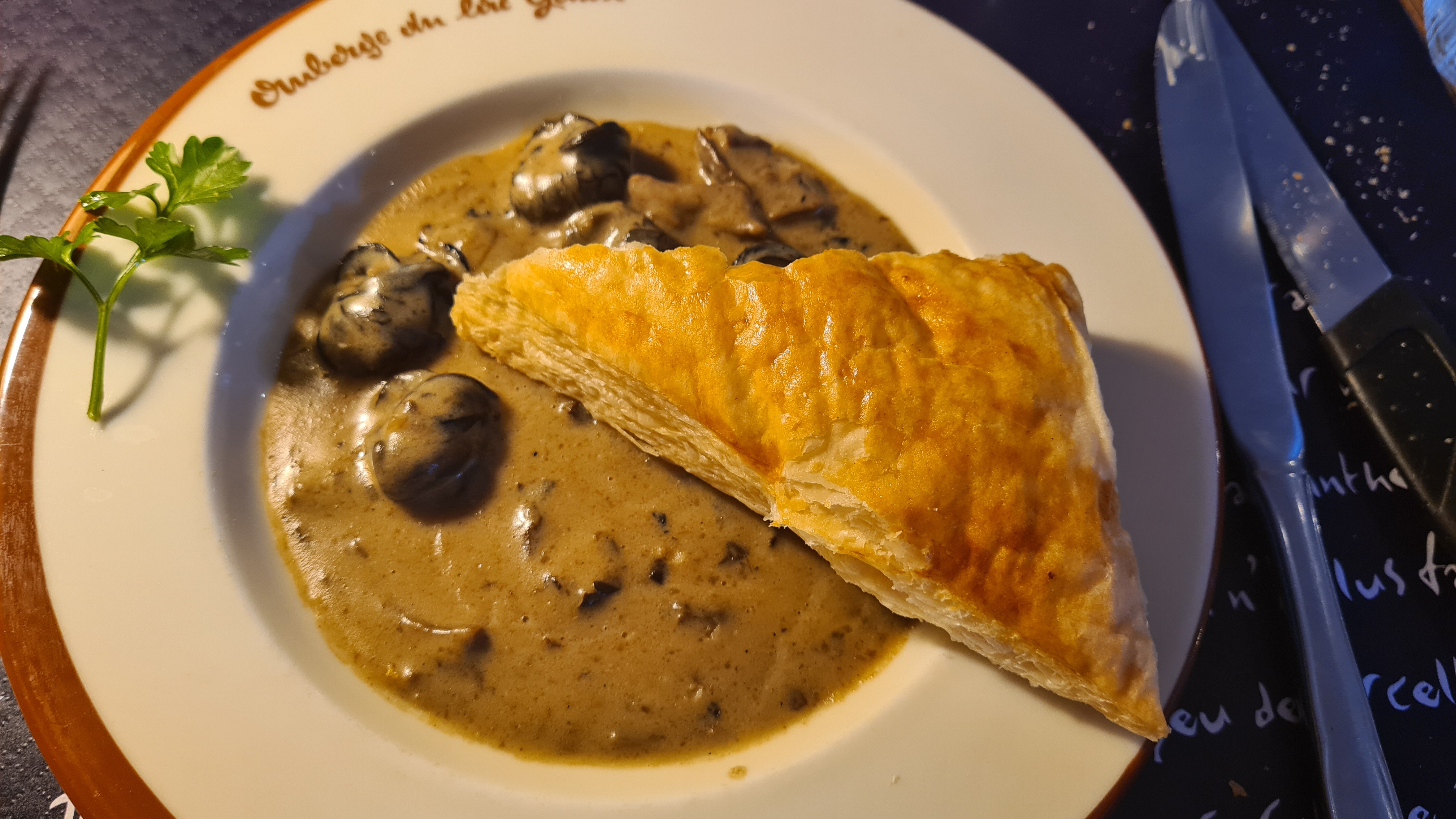Vin au verre en apéritif servi dans le même verre que celui du service,croustade aux escargots..6 escargots dans une sauce sans saveur avec un triangle de pâte feuilletée dans un coin,truite pas mauvaise mais les frites se résumaient à un font de sachet surgelé, minuscules est donc grillées, la salade avec une sauce industrielle, ou alors un faut ap6a faire une sauce de salade,et le crumble juste une compote de pomme avec un cramble par dessus .le service aimable pour autant. .. Déçu