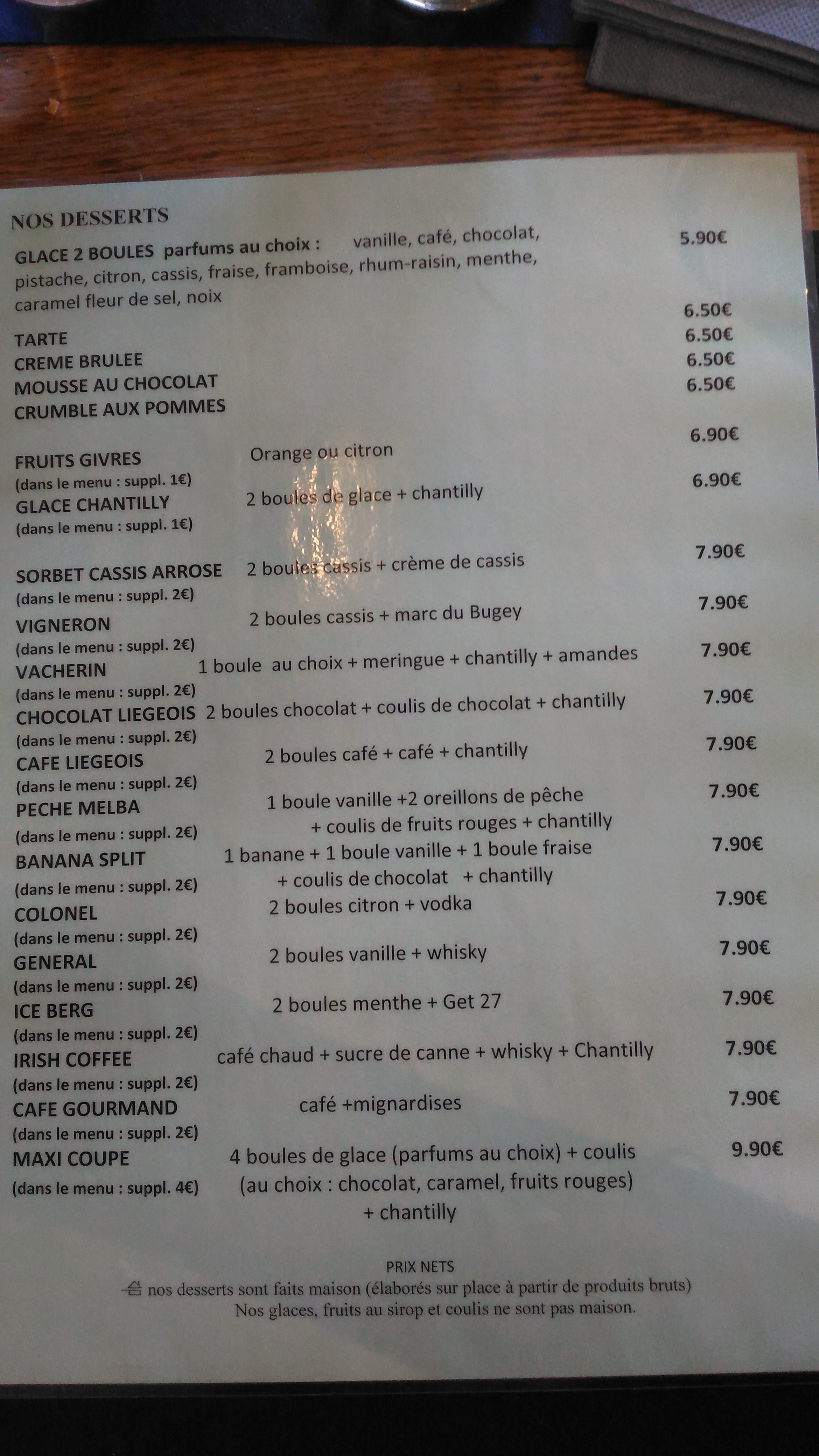 Lieu chaleureux et convivial, personnel très accueillant, serviable et souriant. Le serveur du samedi soir en pull de Noël était fort sympathique et prévenant malgré le monde. Bravo !. Je regrette juste le fait qu'il faille ajouter 2 euros pour le choix des glaces en plus du menu de 28,50€. Mieux vaudrait afficher les prix exact des glaces , en effet, le repas ne correspond plus au prix du menu.