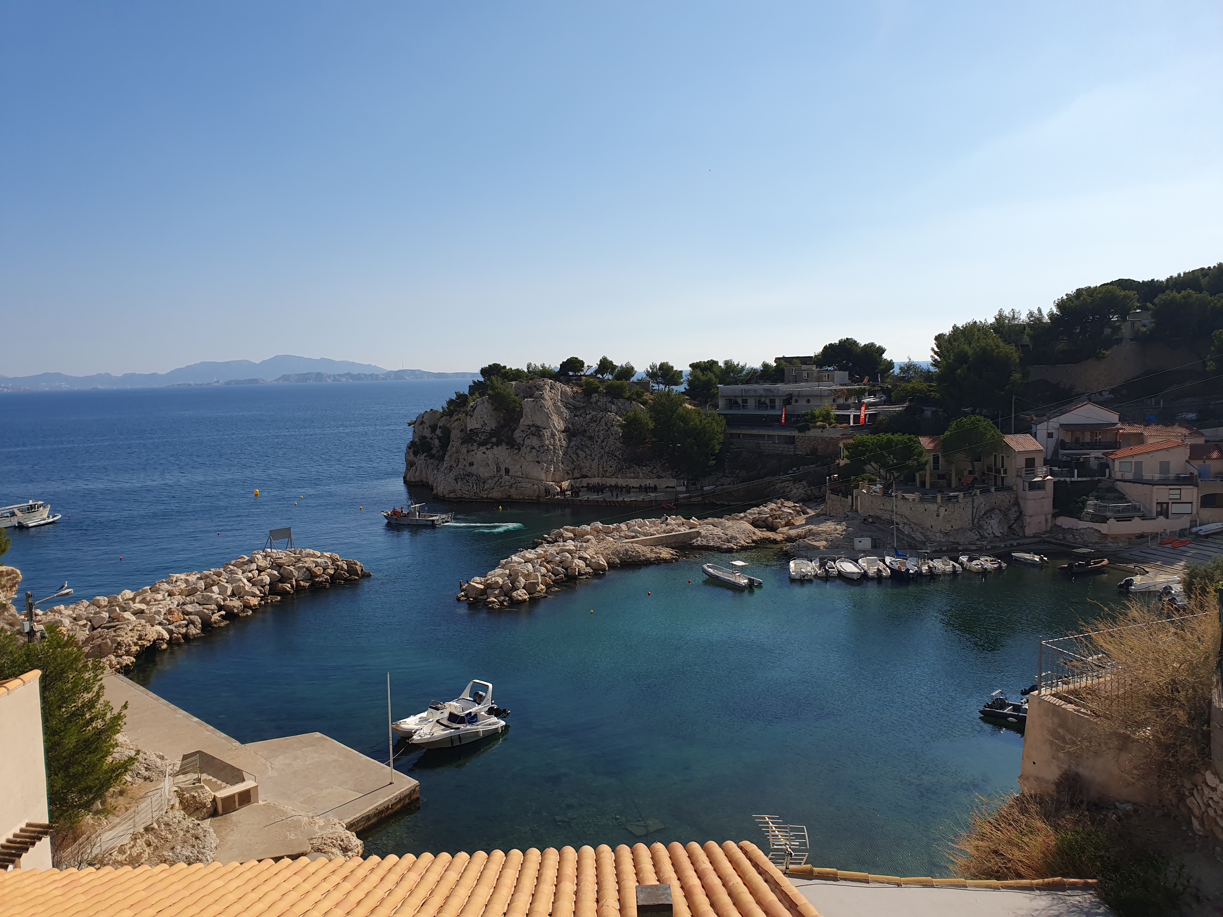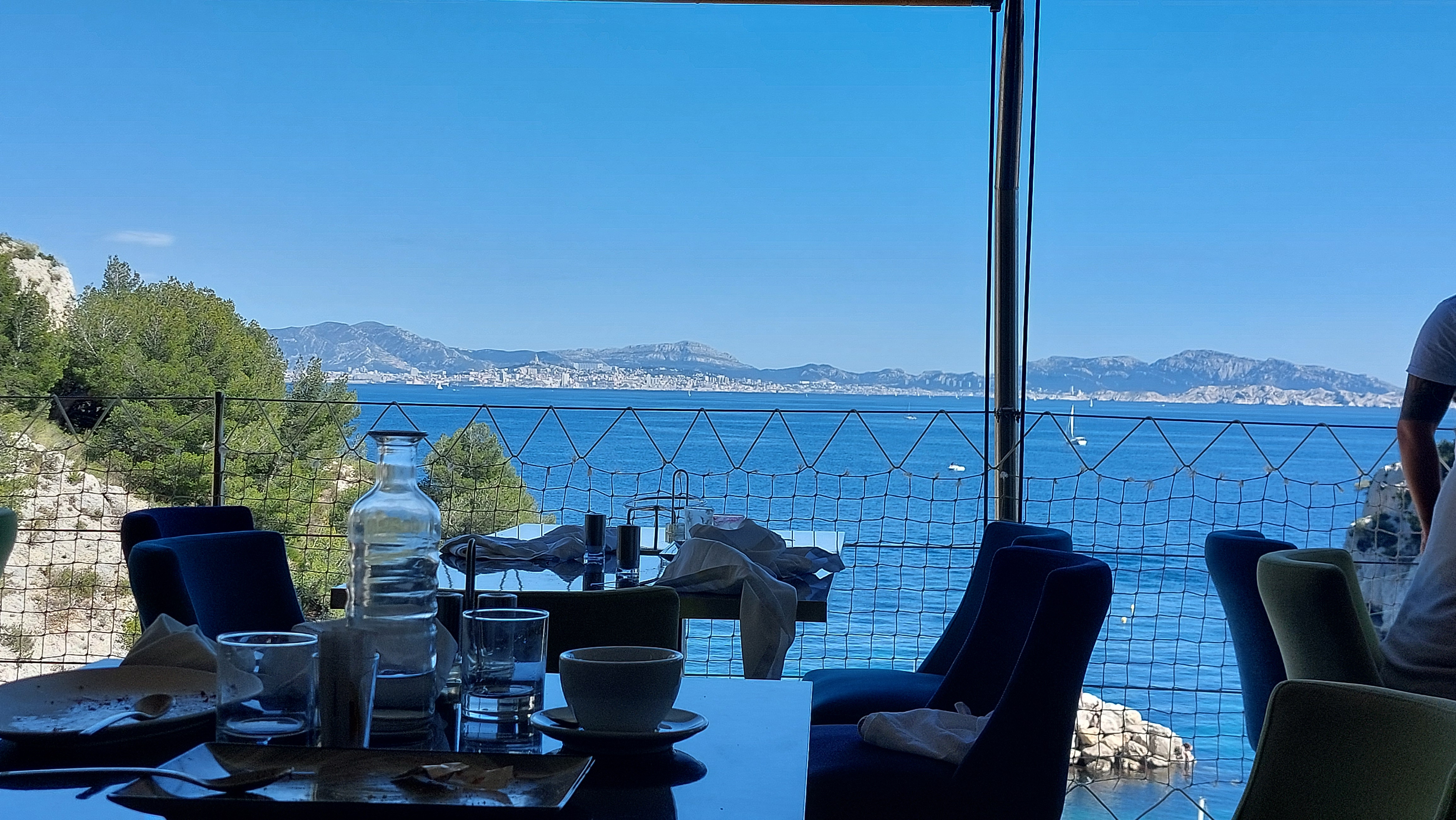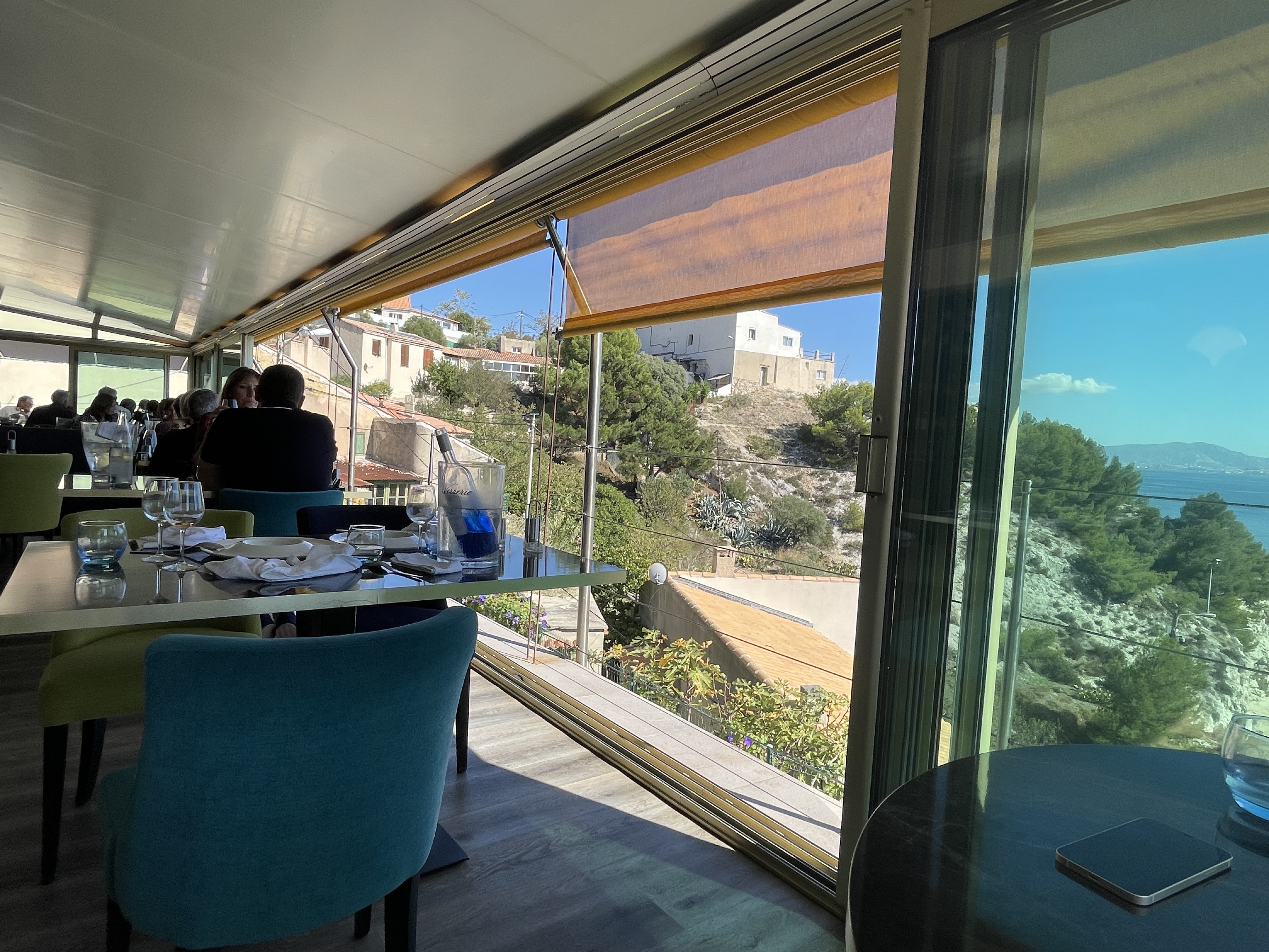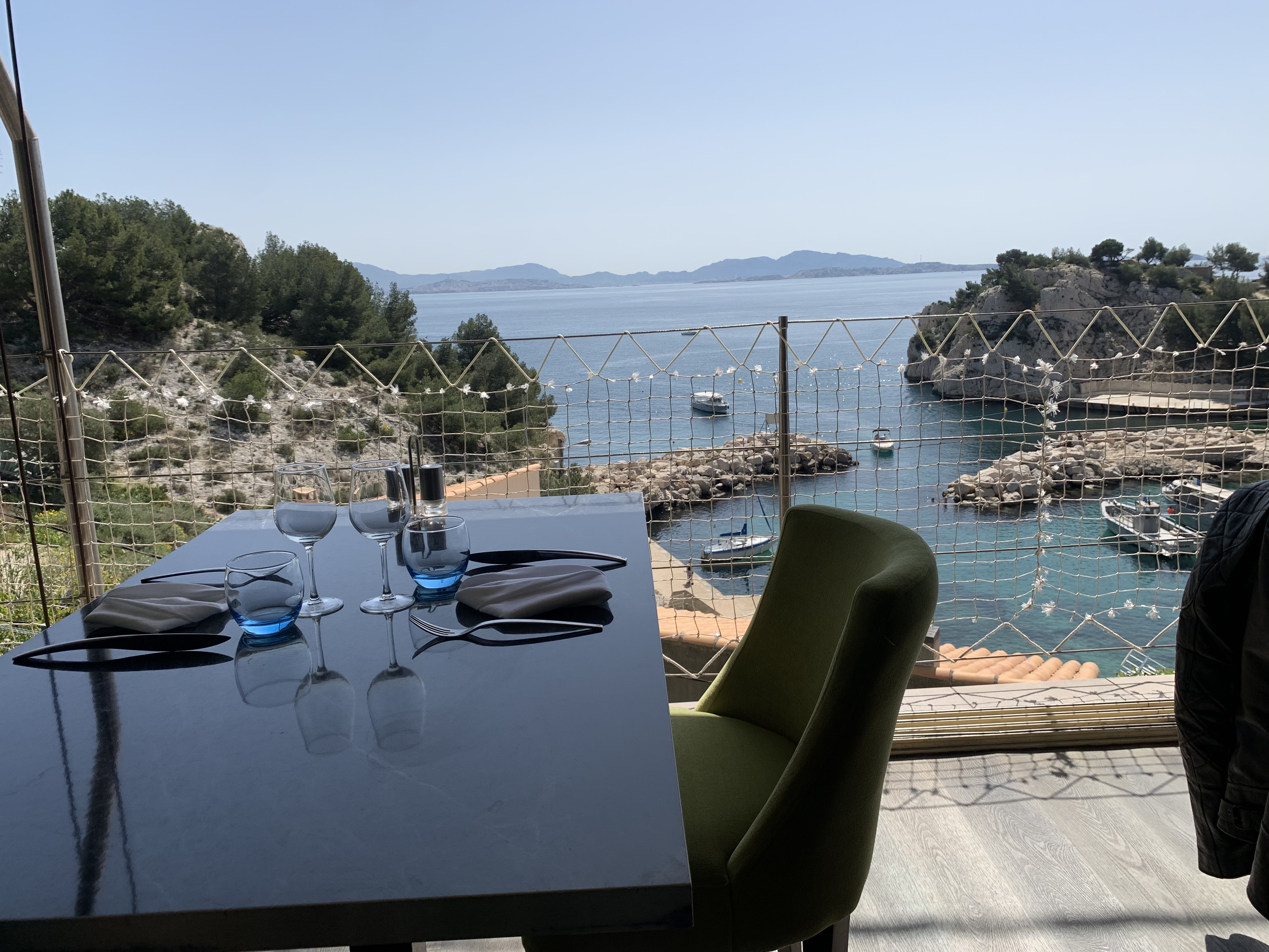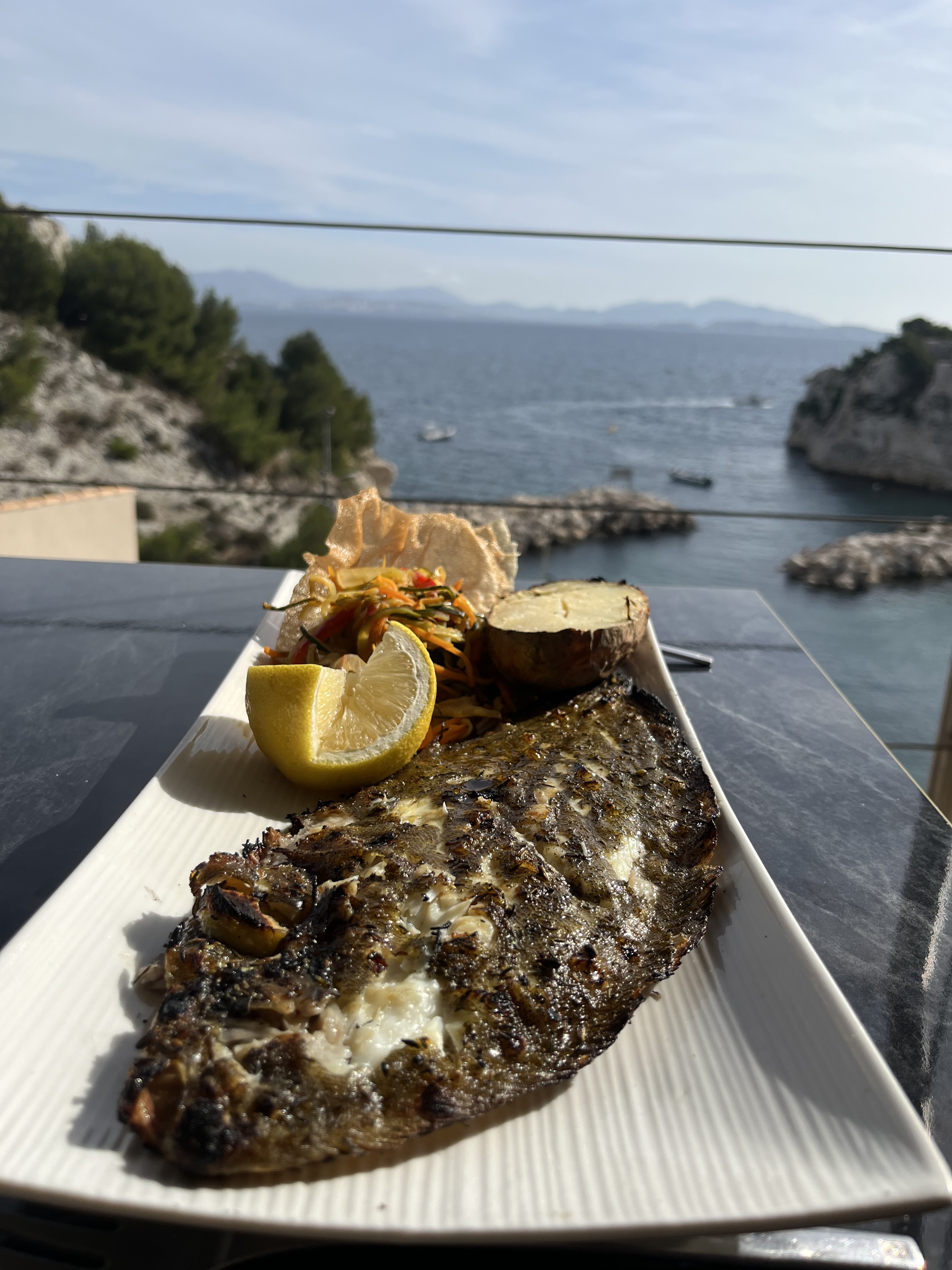 Repas de poisson très bon, vue magnifique sur Marseille et le port de Niolon.