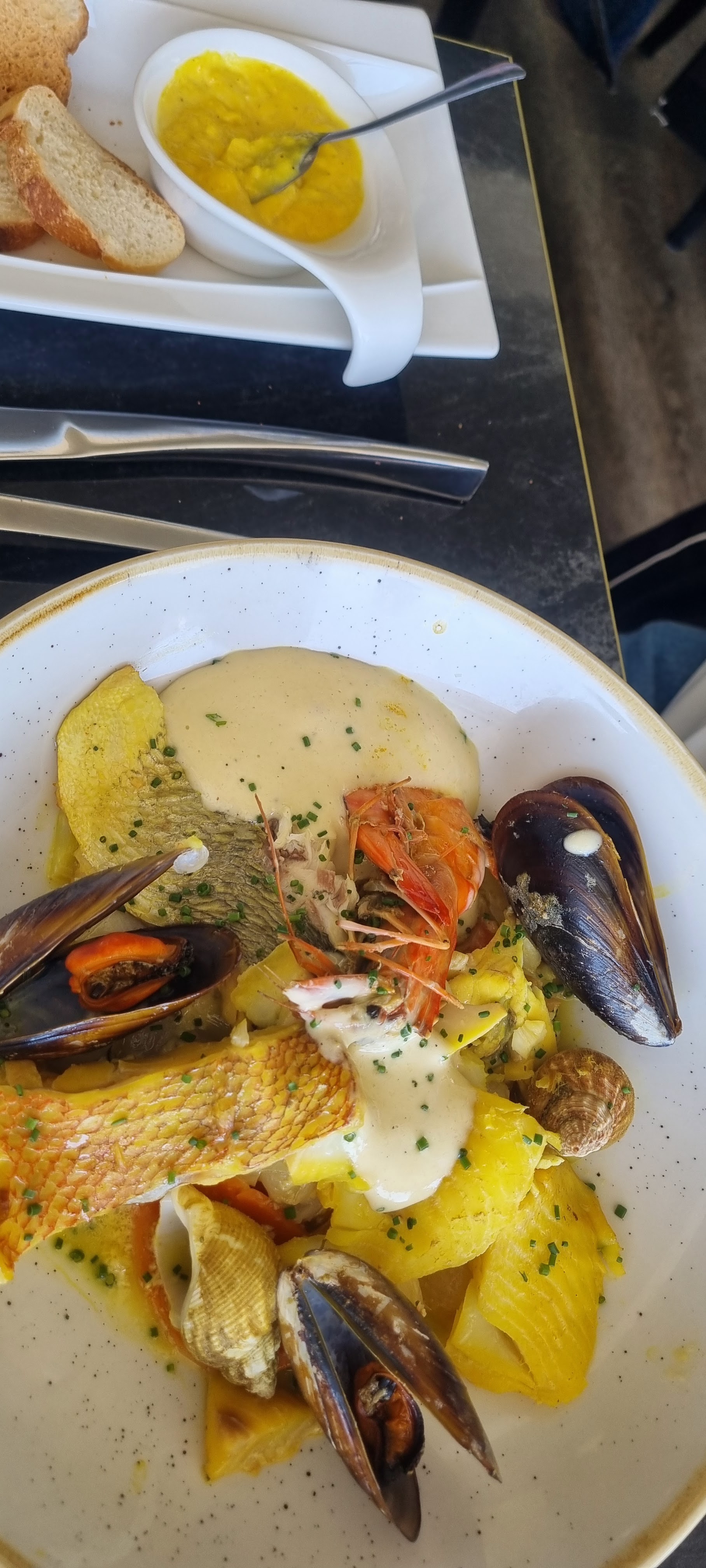 Excellent, une bouillabaisse délicieuse avec une superbe vue sur la mer. Un moment très agréable 👍il manquait juste le soleil ☀️😉